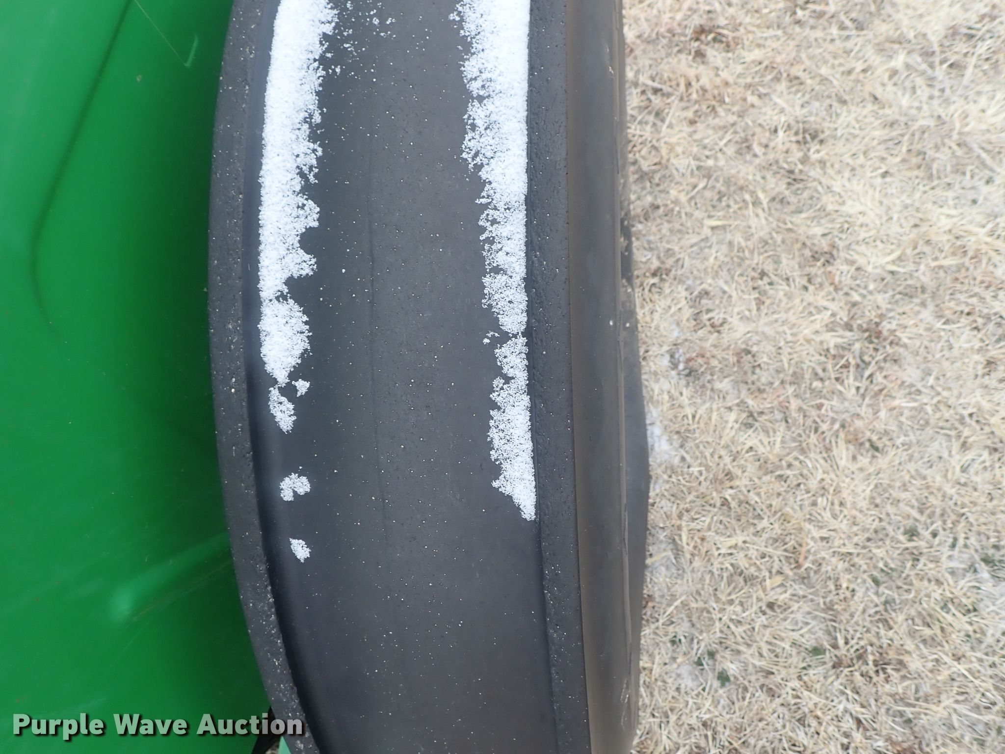 John Deere 450 grain drill. 21 row units, 7.5" row spacing, Hydraulic lift, Ground meter drive, Spring down pressure, Double disk openers, Disk scrapers, Seed cups, Rubber closing wheels, 7.50-20 tires, Serial N00450X003973. Kinsley, KS 67547