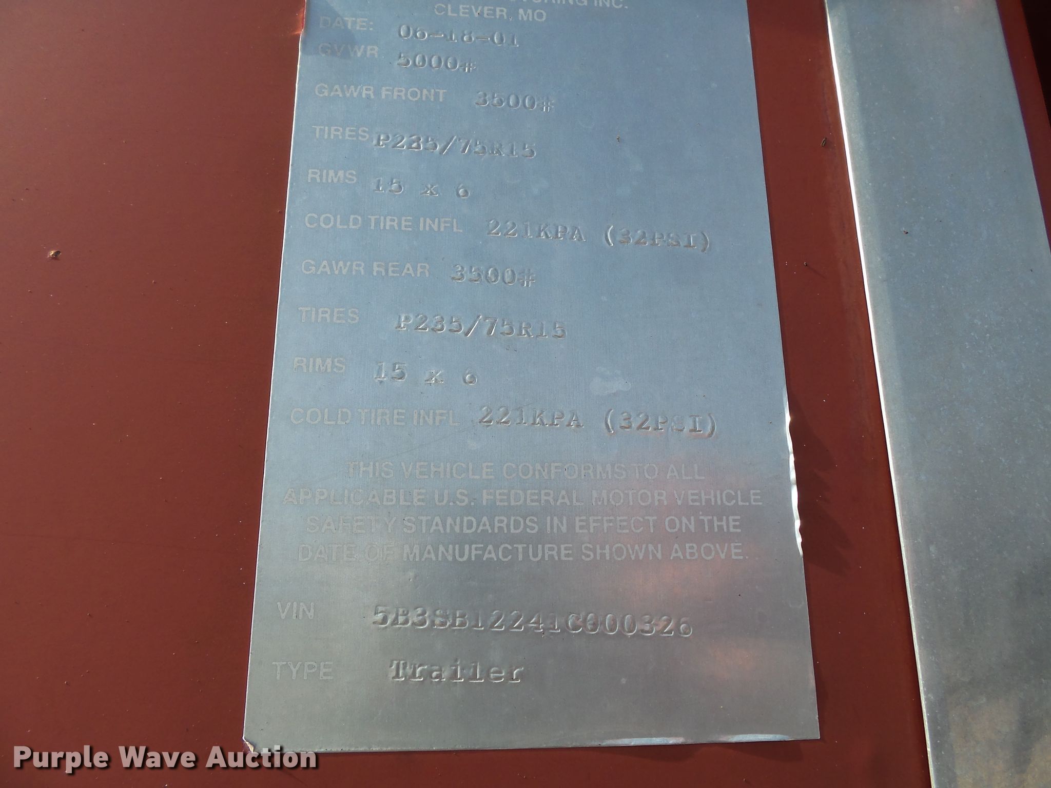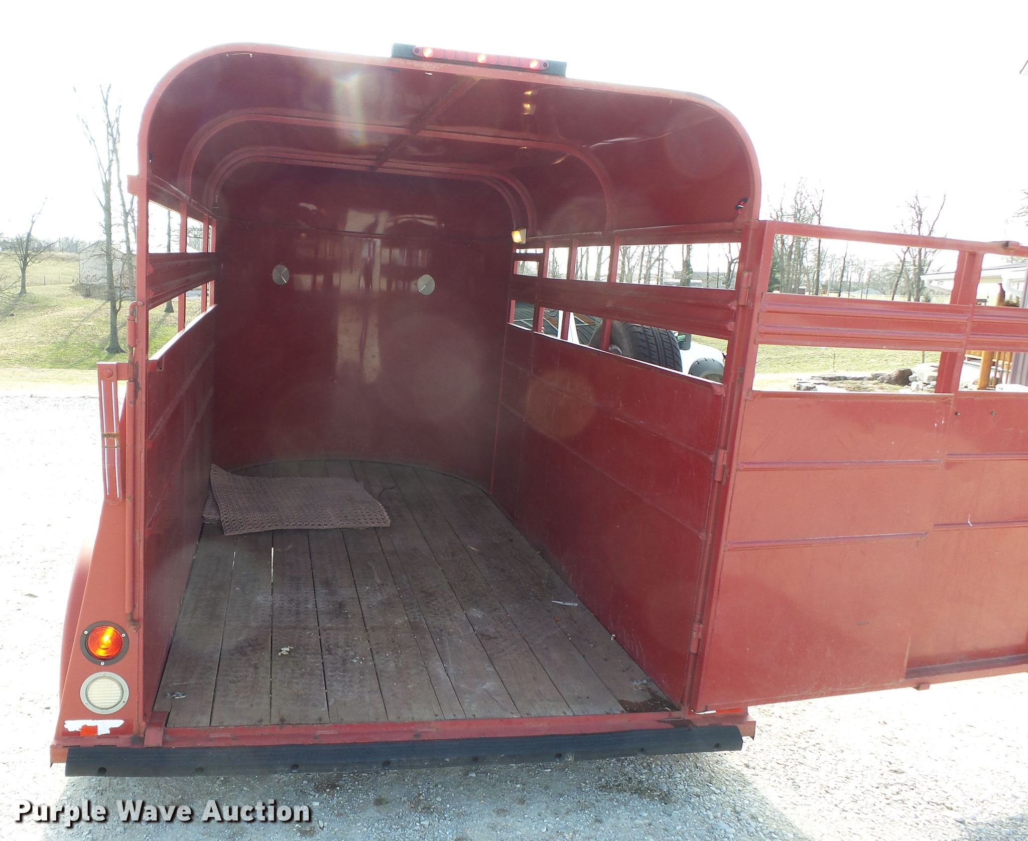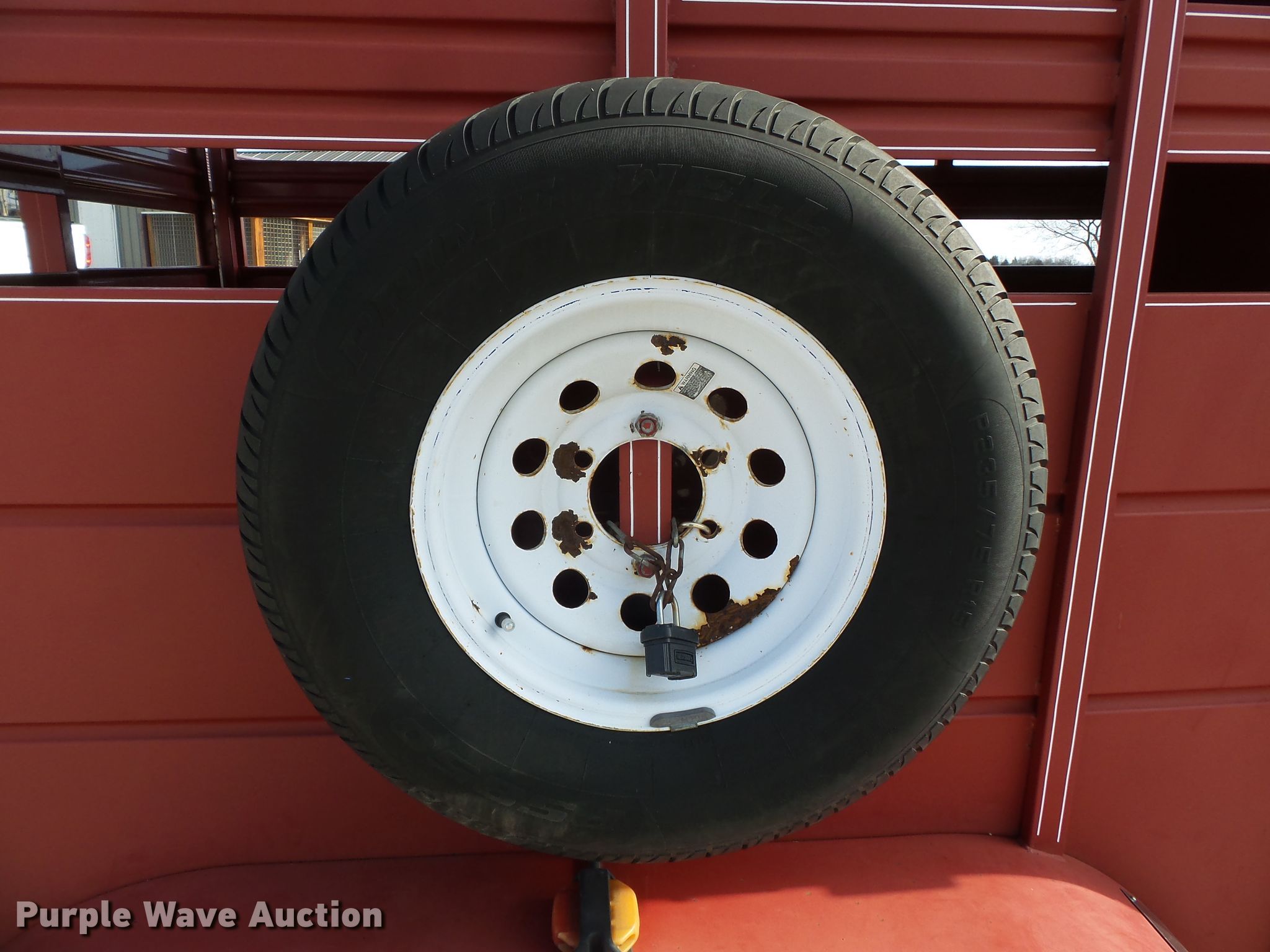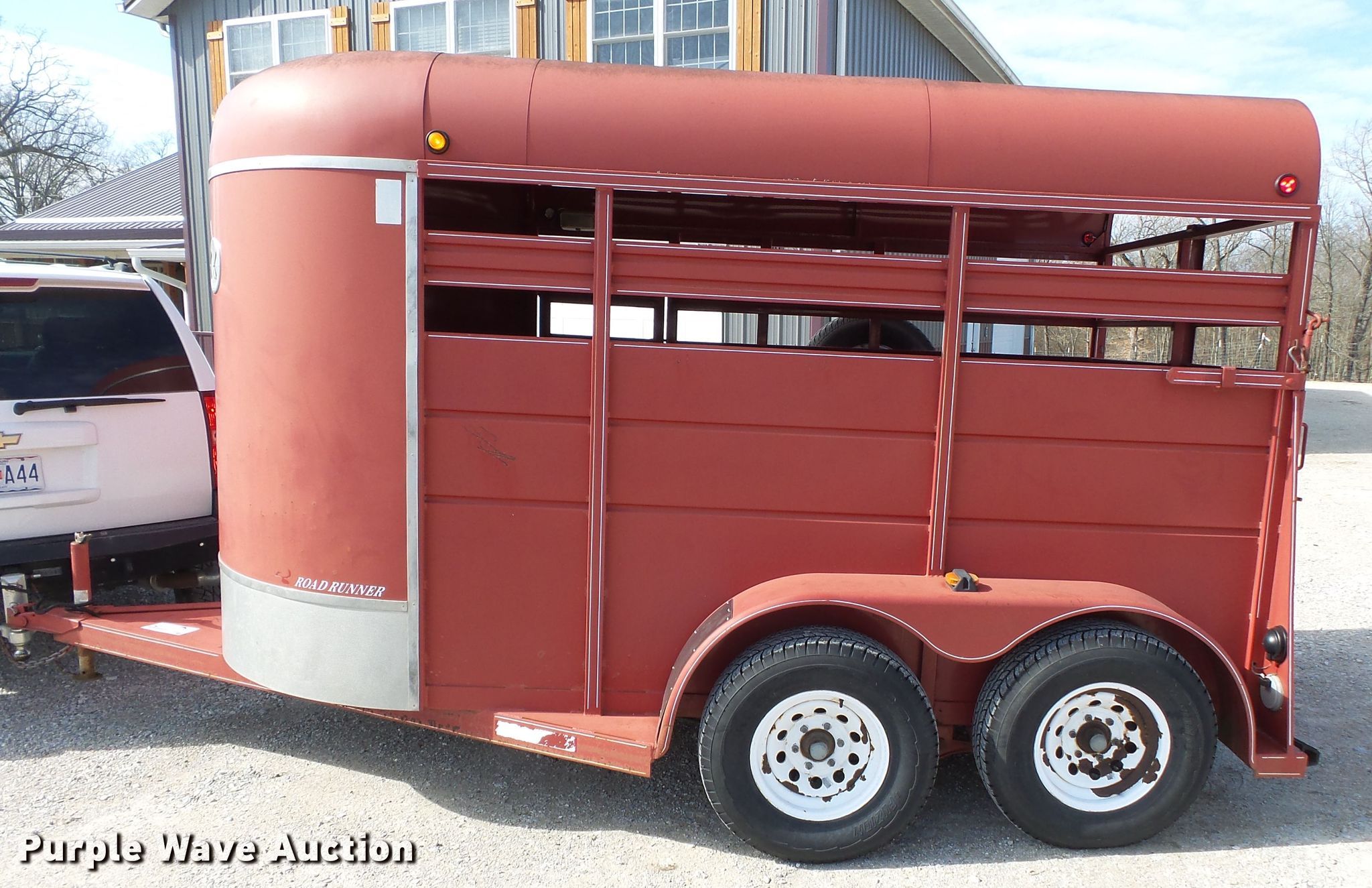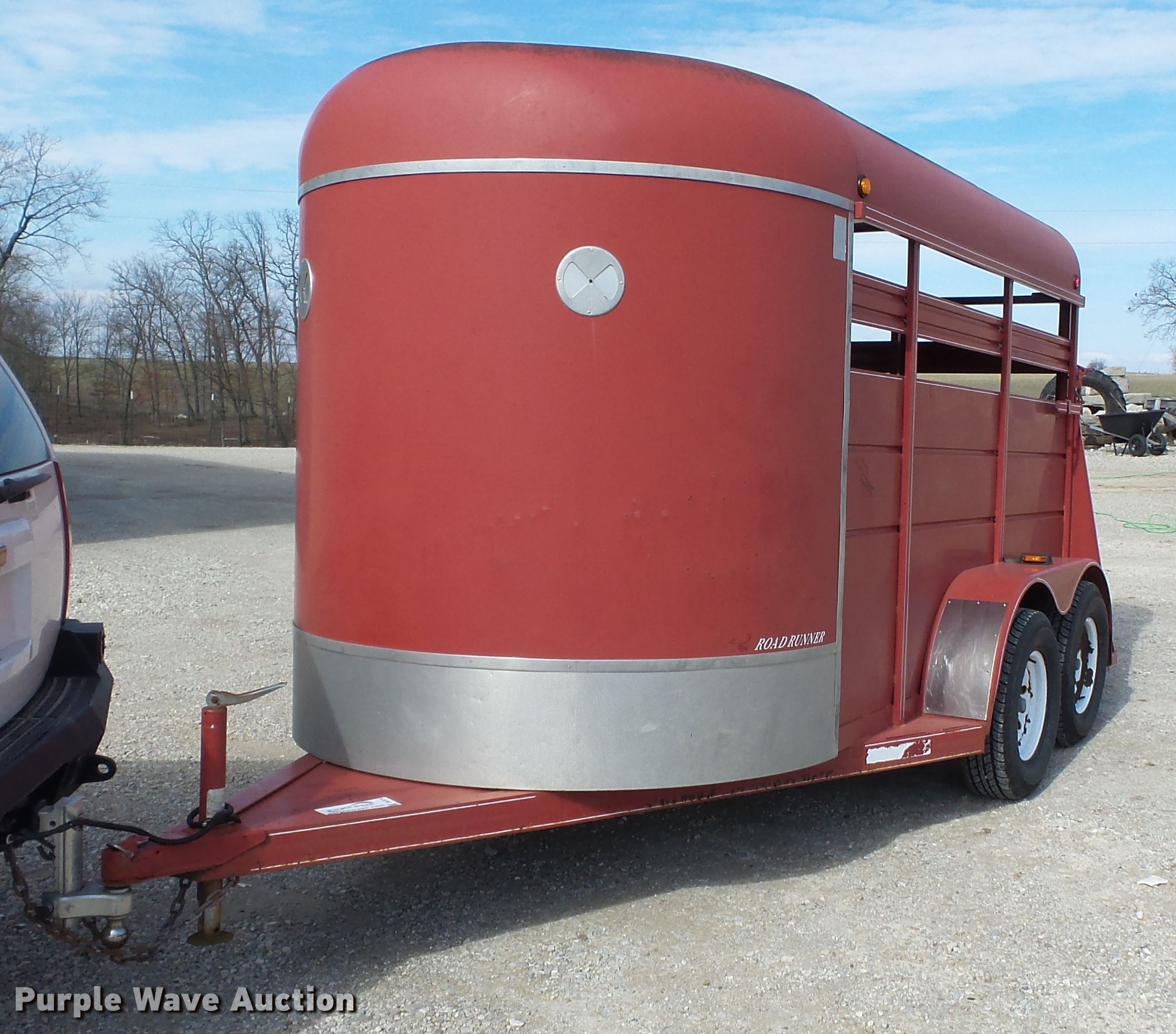 Purple Wave is selling a used Livestock Trailer in Missouri. This item is a 2001 Road Ranger livestock trailer with the following: 15'L overall, 12'L x 69"W body, Ground load, Rubber floor mat, Steel construction, 2" ball hitch, Single leg landing gear, Spring suspension, Electric brakes, Tandem axle, Steel wheels, 235/75R15 tires, GVWR 5,000 lbs