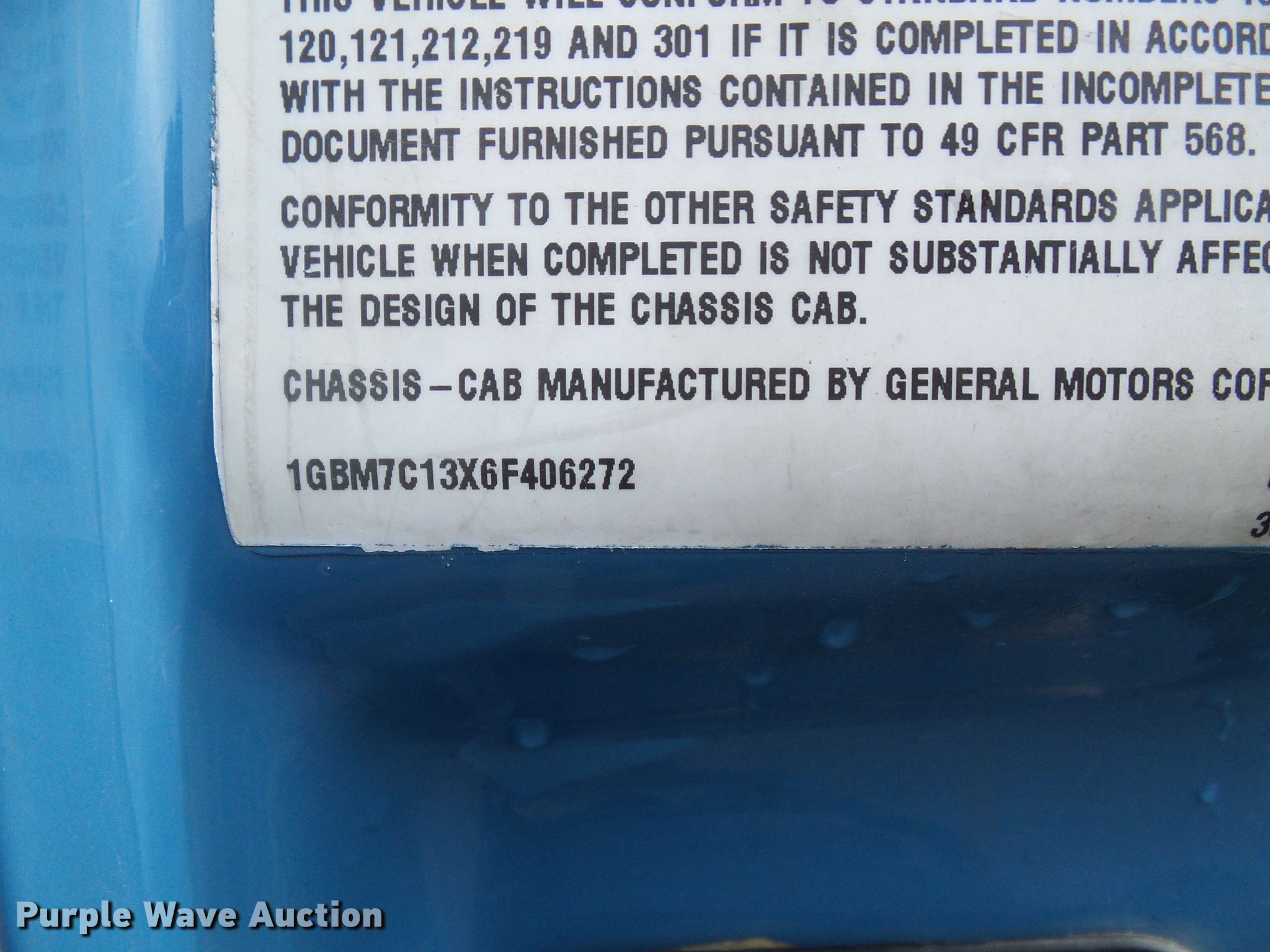 Purple Wave is selling a used Truck Chassis in Missouri. This item is a 2006 Chevrolet C7500 truck cab and chassis with the following: 150,510 miles on odometer, Isuzu 6HK1-TC 7.8L six cylinder diesel engine, Six speed manual transmission, Single axle, AC and heat, PTO, 143" from rear of cab to center of rear axle, Single fuel tank, Spring suspension, Air brakes, 216" wheelbase, 11R22.5 tires, GVWR 33,000 lbs