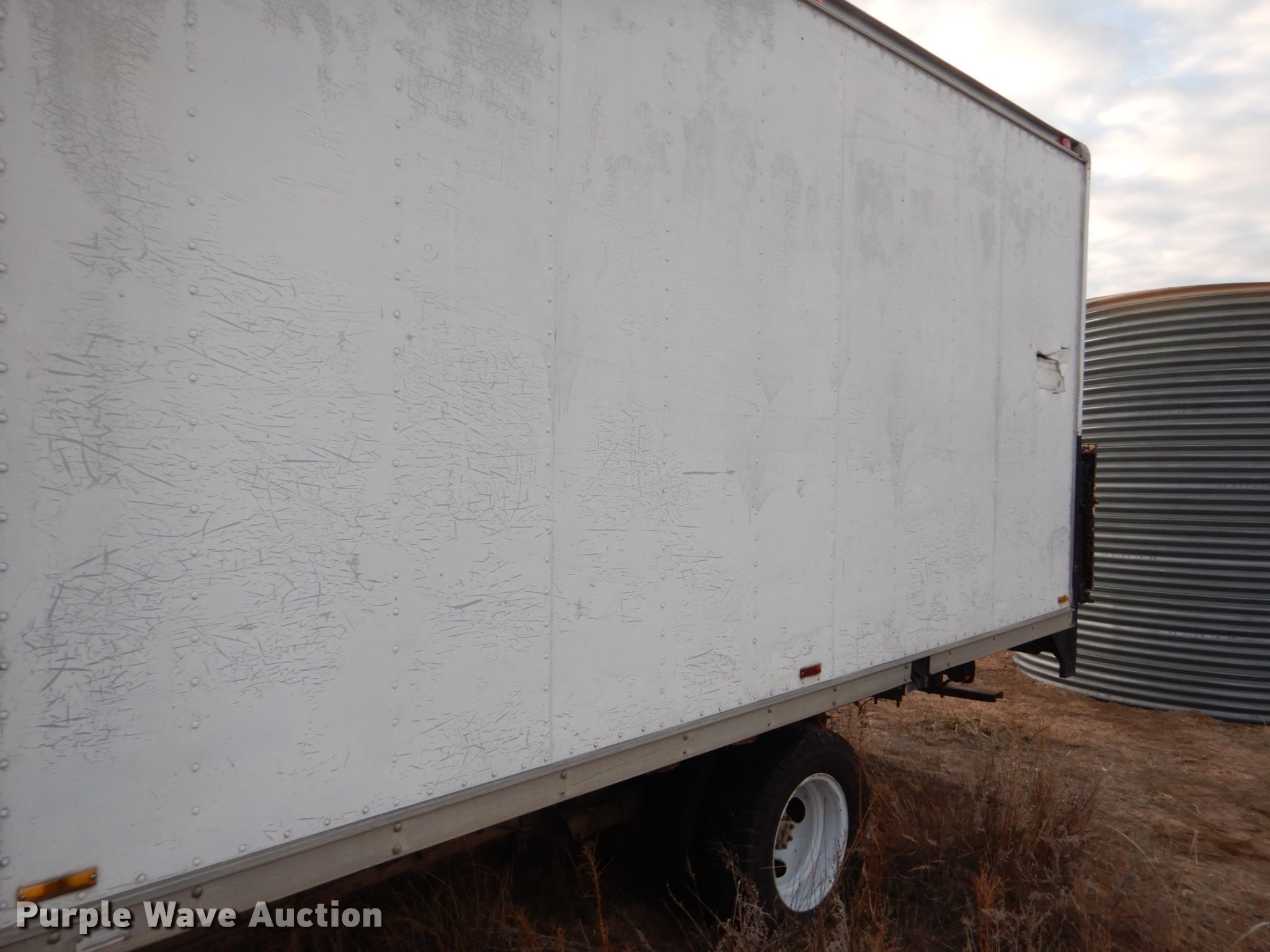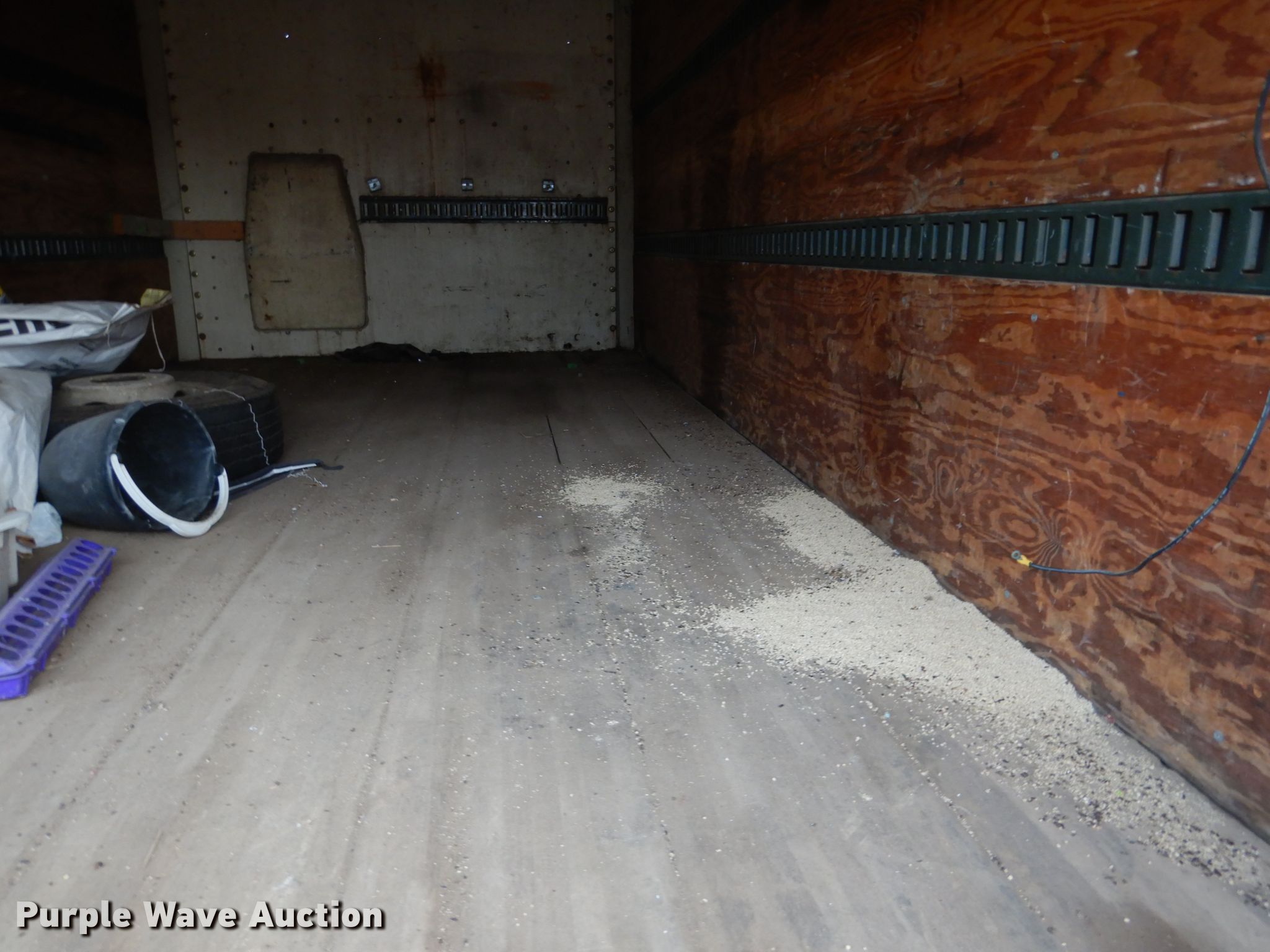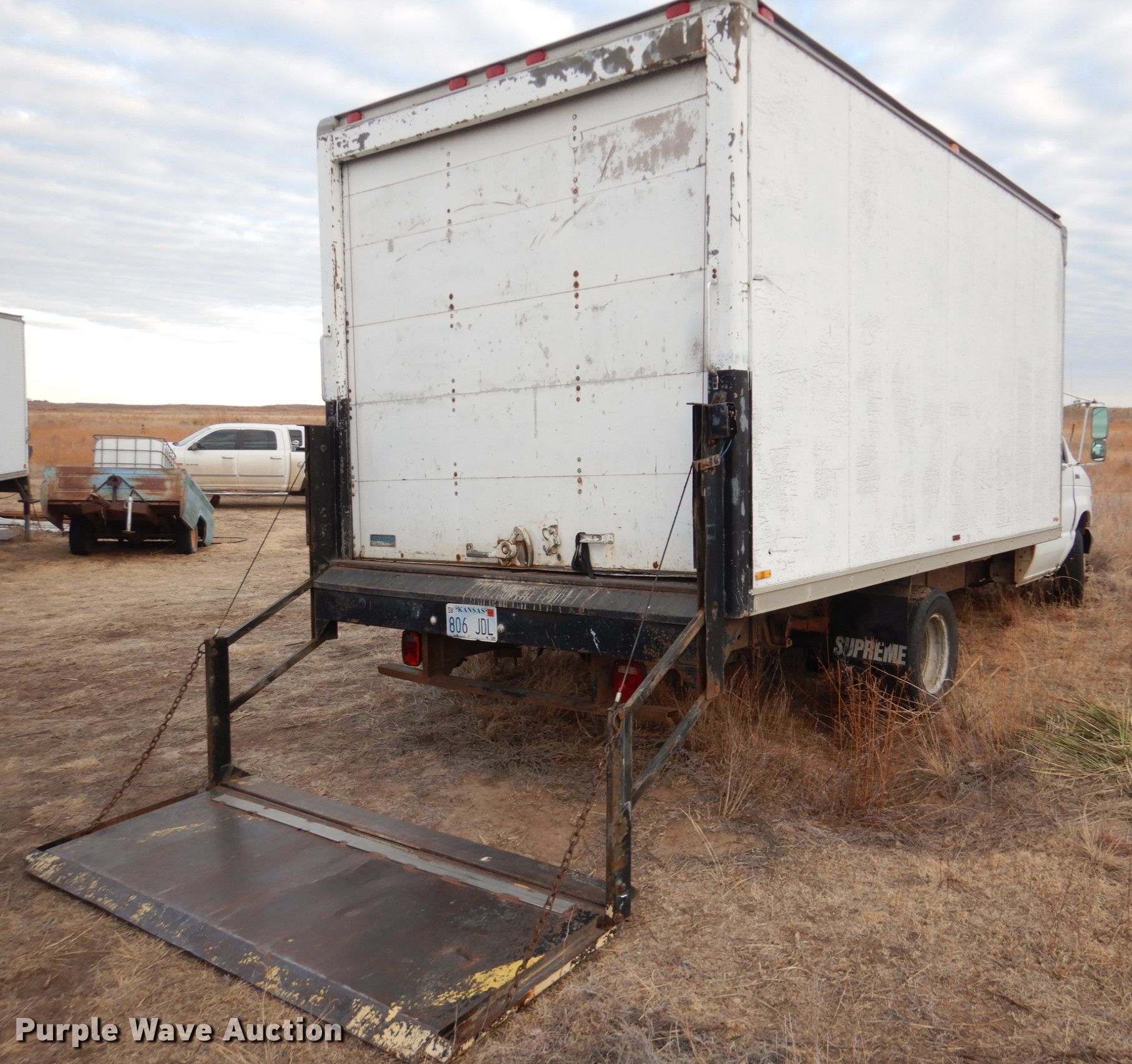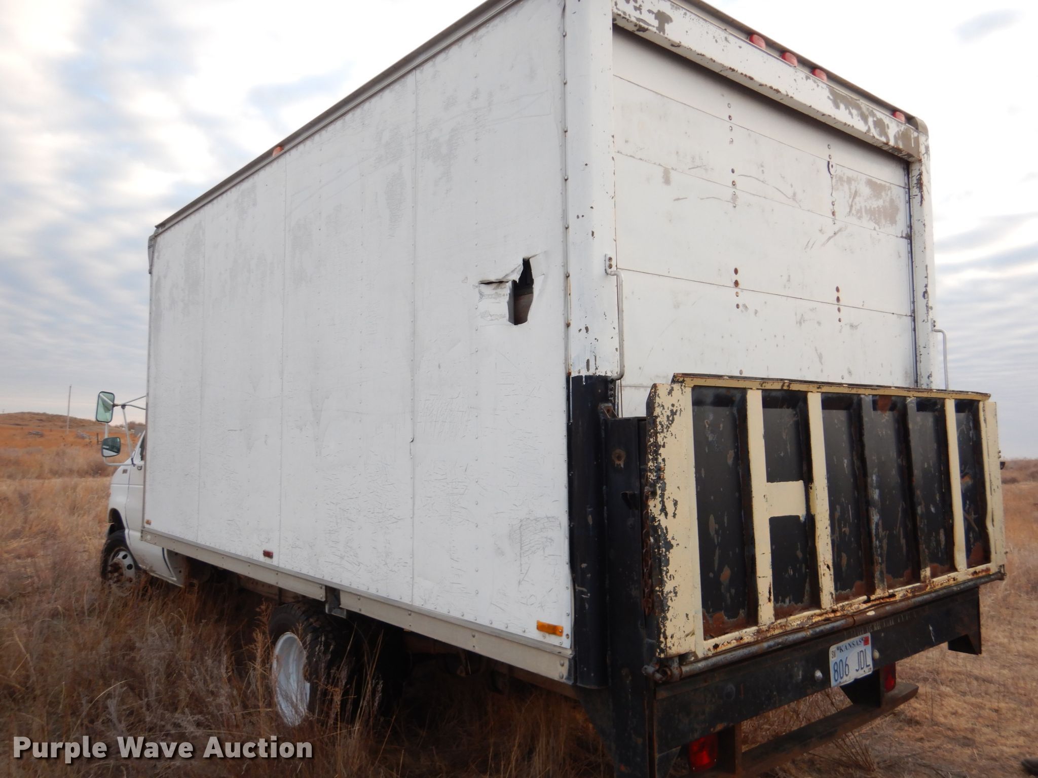 1997 Ford E350 box truck. 208,872 miles on odometer, 5.4L V8 SOHC 16V gas engine, Automatic transmission, Single axle, AC and heat, Diamond box bed 15'L x 78"W x 84"H, Wood floor, Tommy Gate 911348 end gate lift, Spring suspension, Hydraulic brakes, 225/75R16 tires, GVWR 7,800 lbs, Cracked windshield, Non-operational fan, Contents not included. Kansas title. Title distribution may be delayed up to 14 days from verification of funds. 1FDKE37L1VHB55866. 1203 Elm Blvd. Liberal, KS 67901