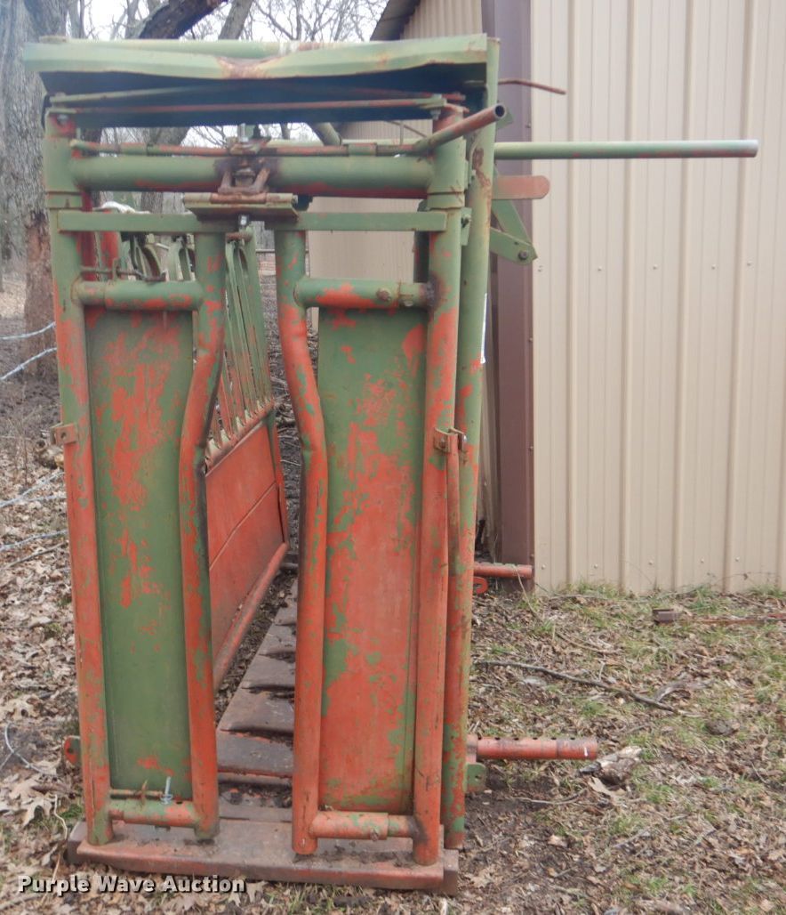 Purple Wave is selling a used Livestock Equip. in Oklahoma. This item is a Livestock squeeze chute with the following: 8'L x 3'W, Self-catching head gate, Rear entry gate