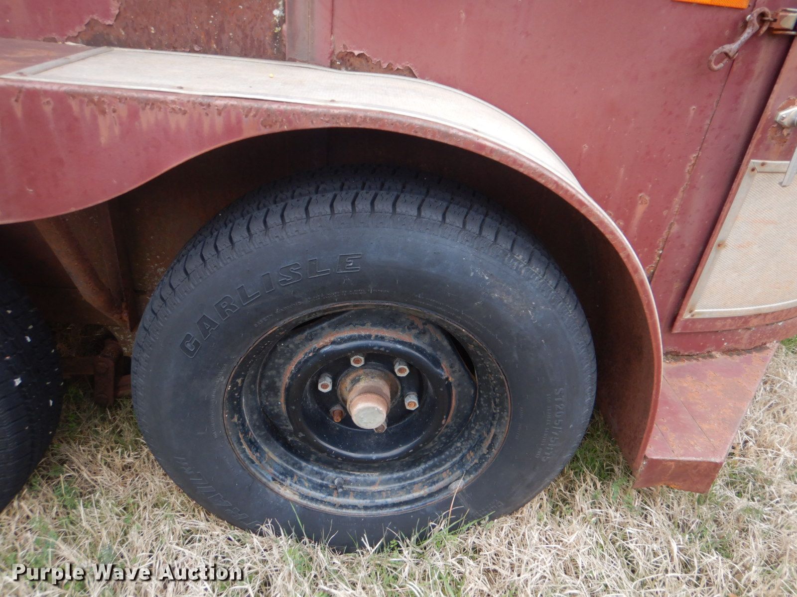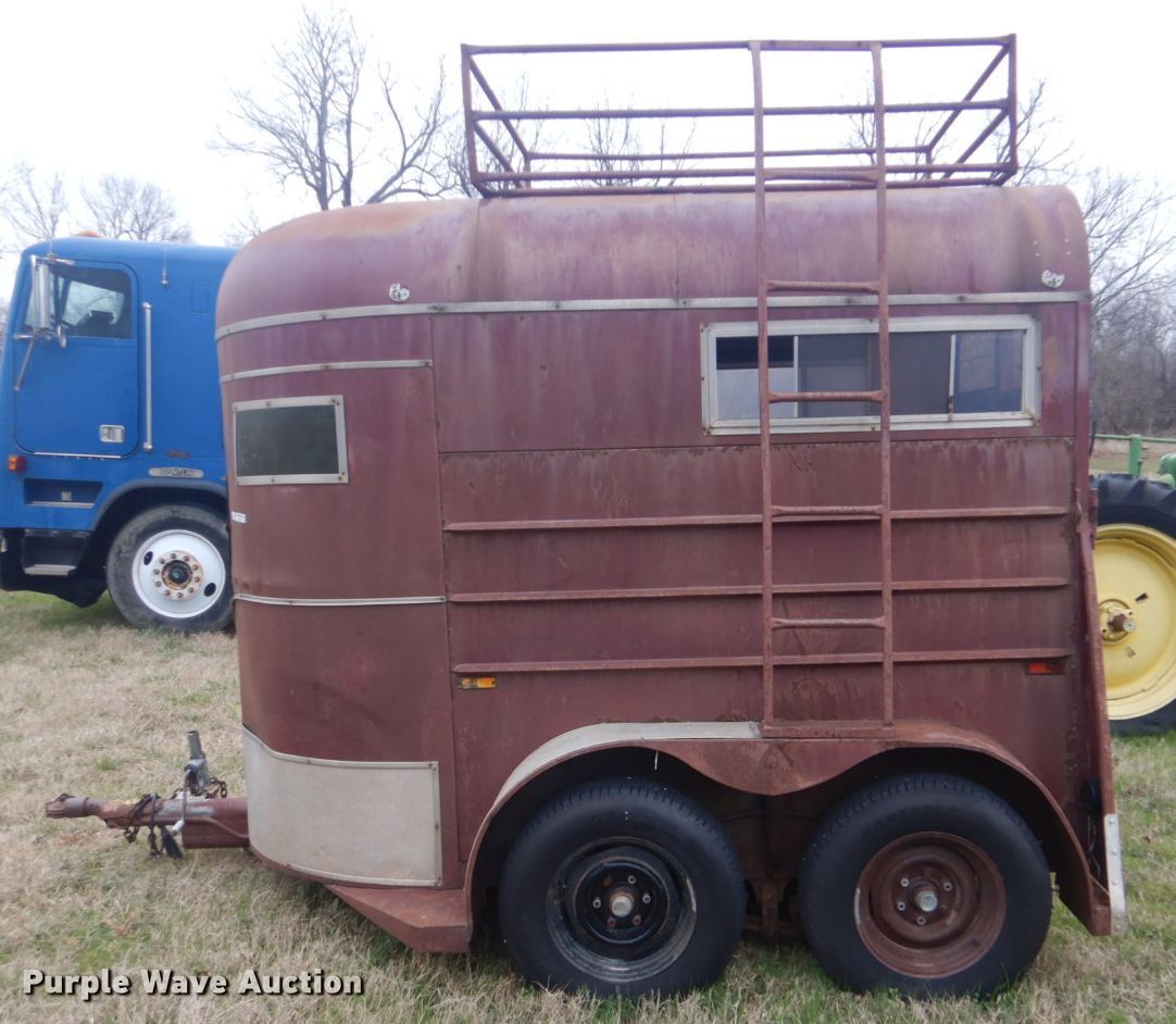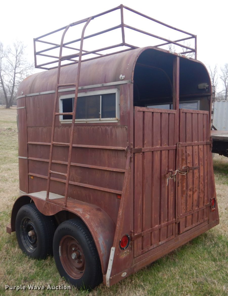 Purple Wave is selling a used Livestock Trailer in Oklahoma. This item is a Shop built horse trailer with the following: 10'L overall, 8'L x 5'W body, Two horse capacity, Center gate, Ground load, Rubber floor mat, Spring suspension, Electric brakes, Tandem axle, ST205/75R15 tires, Unknown operating condition