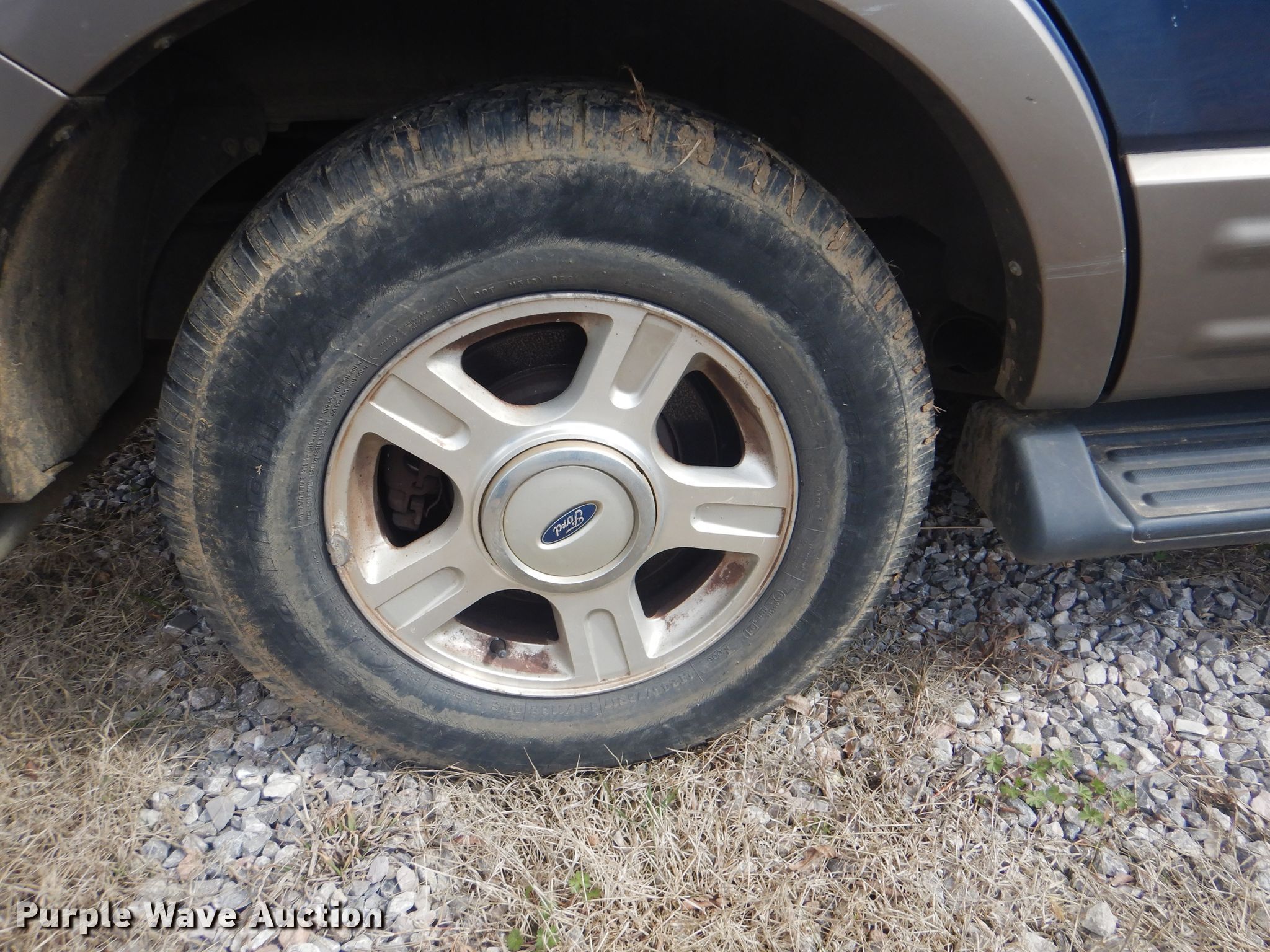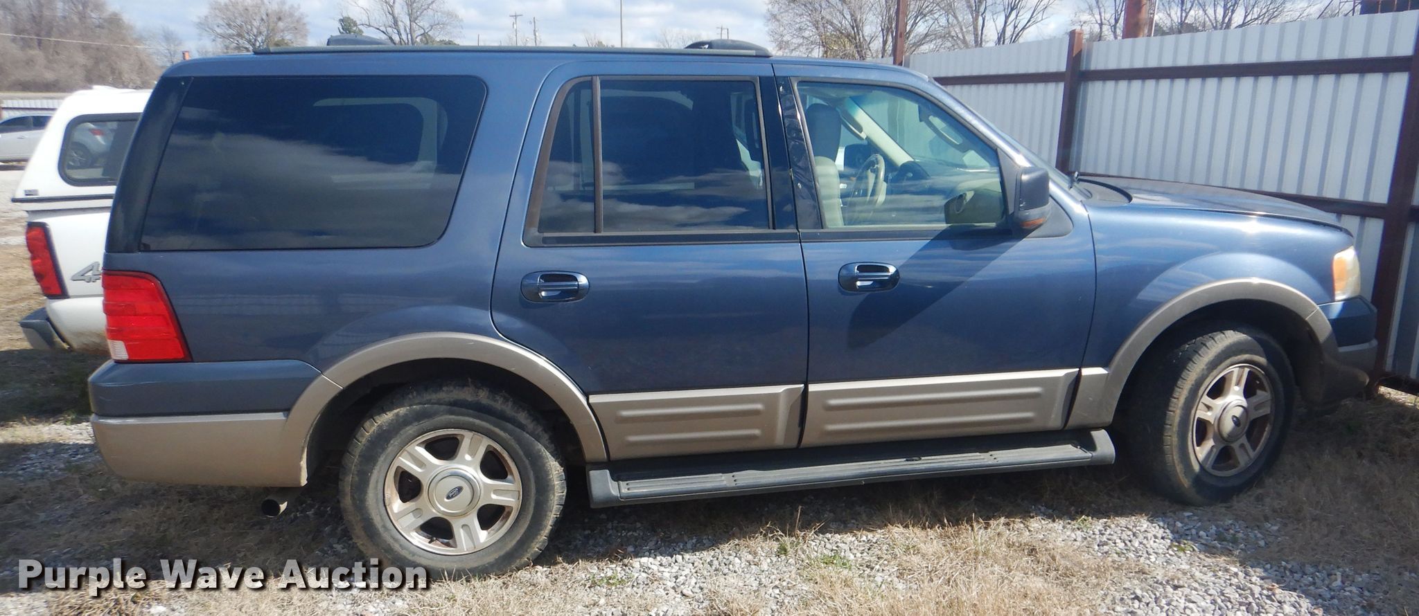 Purple Wave is selling a used Passenger Vehicle in Oklahoma. This item is a 2003 Ford Expedition Eddie Bauer SUV with the following: Unknown miles on odometer, 5.4L V8 SOHC 16V gas engine, Automatic transmission, Four wheel drive, AC and heat, Cruise, Power windows, locks, and seat, LT245/75R17 tires, Drivers side mirror broken