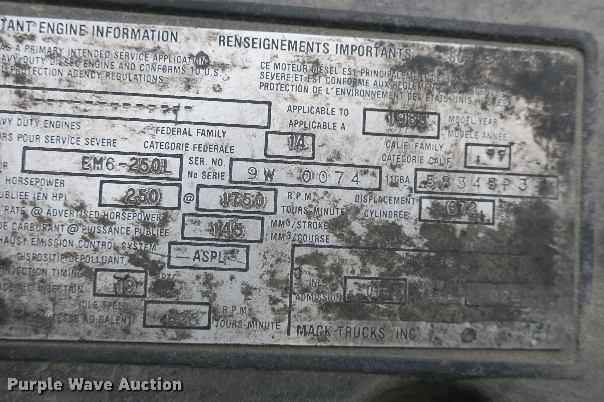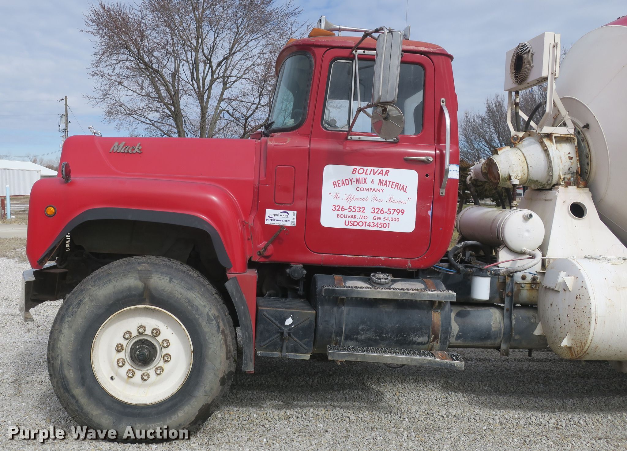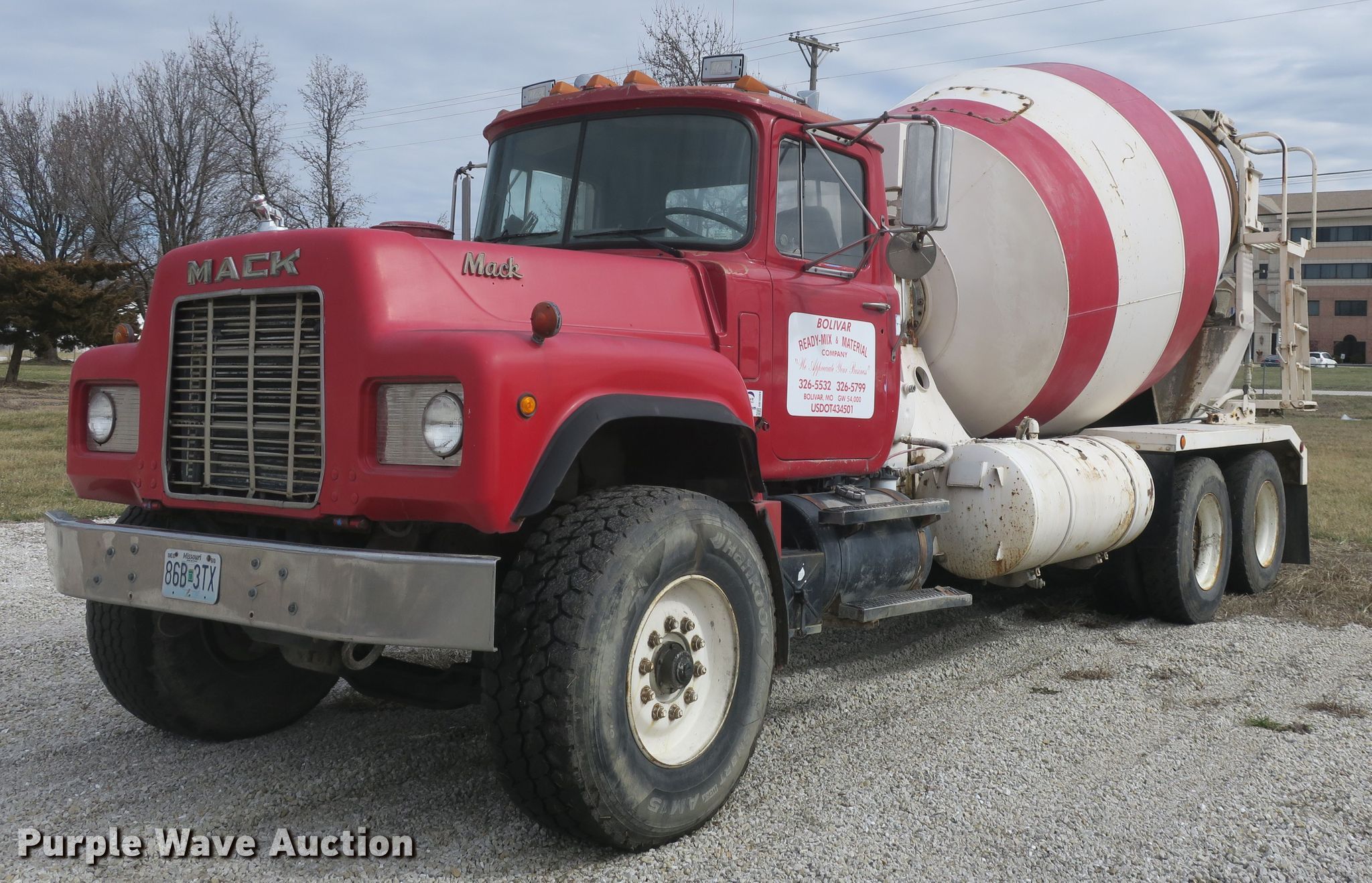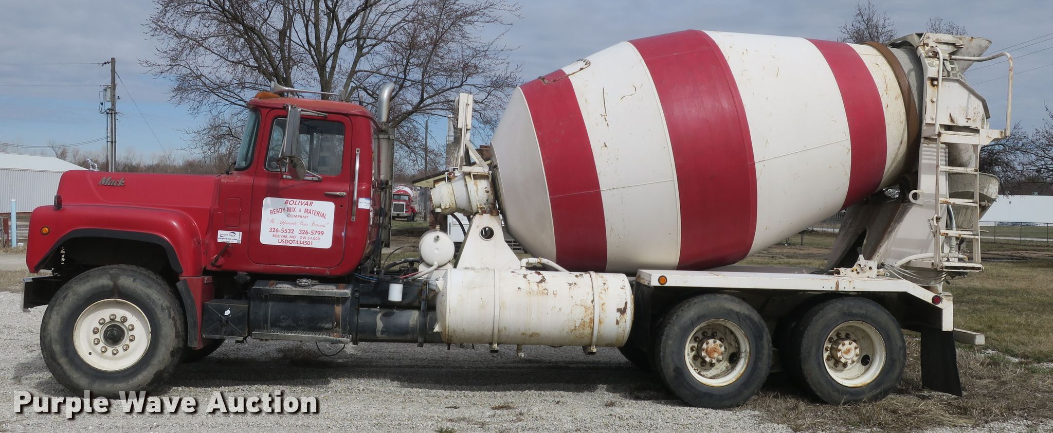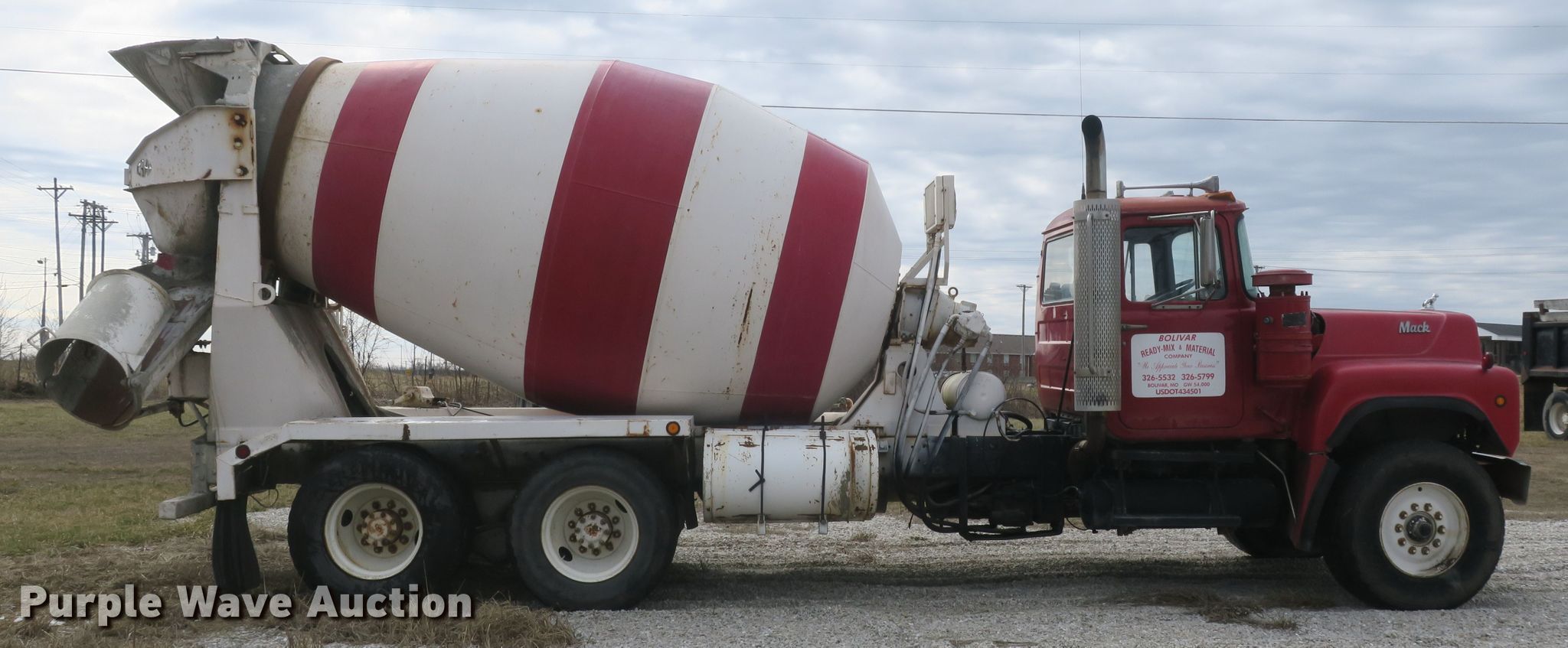 Purple Wave is selling a used Ready Mix or Pump Truck in Missouri. This item is a 1990 Mack RD690S ready mix truck with the following: 121,840 miles on odometer, 1,939 hours on meter, Mack EM6250L 11.0L L6 diesel engine, 250 HP, Maxitorque eight speed manual transmission, Tandem axle, Heat, CBMW mixer bed, 10.5 cu.yd. capacity, In-cab controls, 125 gallon water tank, Rear drum controls, Rear discharge, (3) steel chute extensions, Double frame, Walking beam suspension, Air brakes, 425/65R22.5 front tires, 11R22.5 rear tires