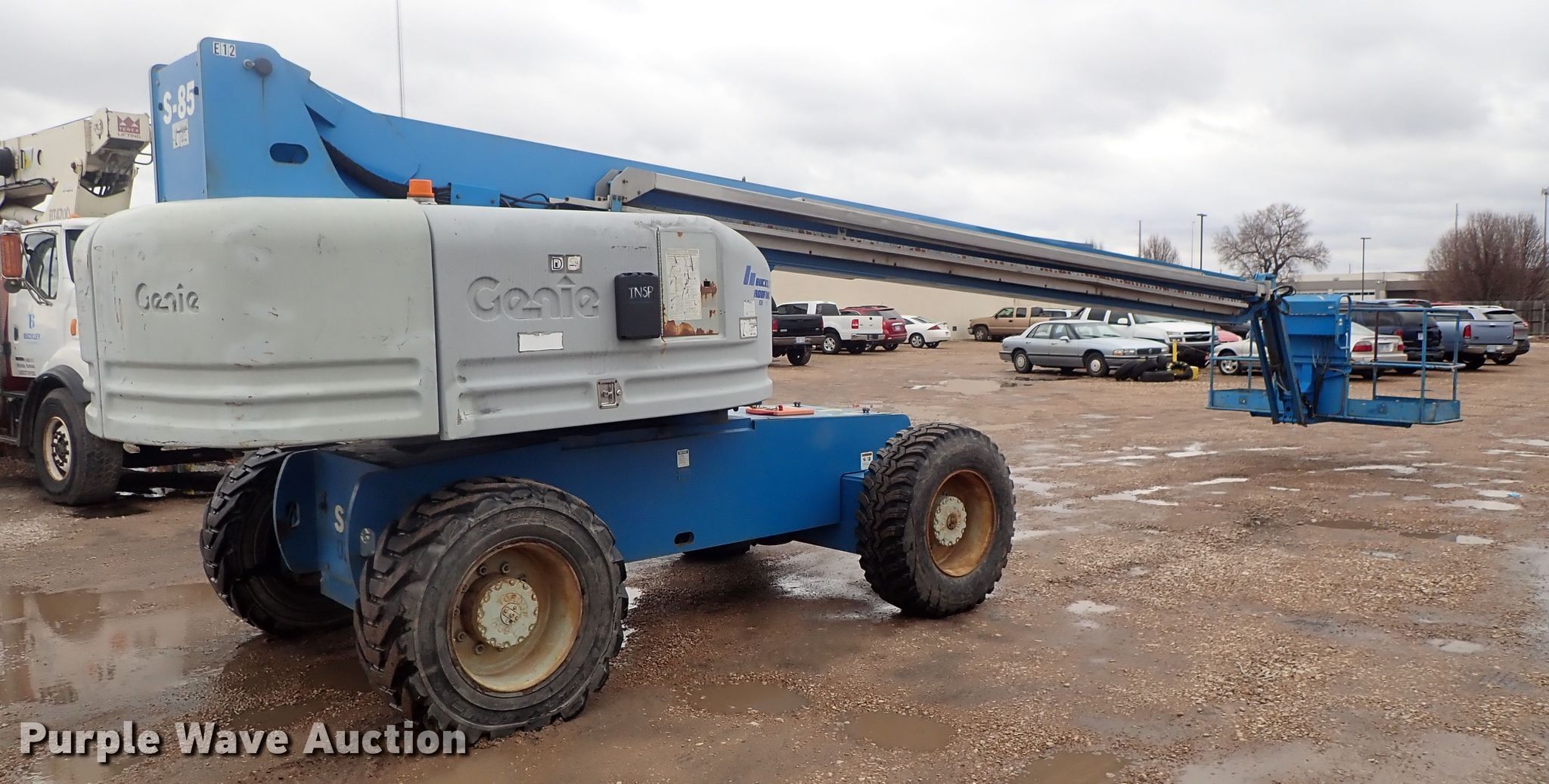 Purple Wave is selling a used Boom Lift in Kansas. This item is a 2002 Genie S80 boom lift with the following: 6,406 hours on meter, Diesel engine, Four wheel drive, 500 lbs maximum lift capacity, 85' maximum lift height, 77' maximum reach, 93"L x 33"W platform, Platform and ground controls, Hydraulic platform rotation, 15-22.5 tires, 385/65D22.5 tires, Serial S80-2964
