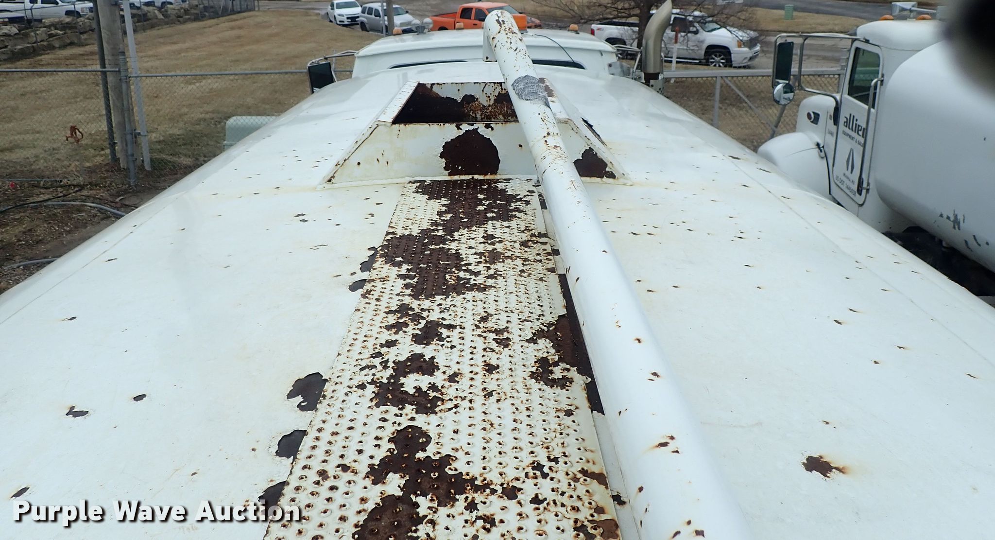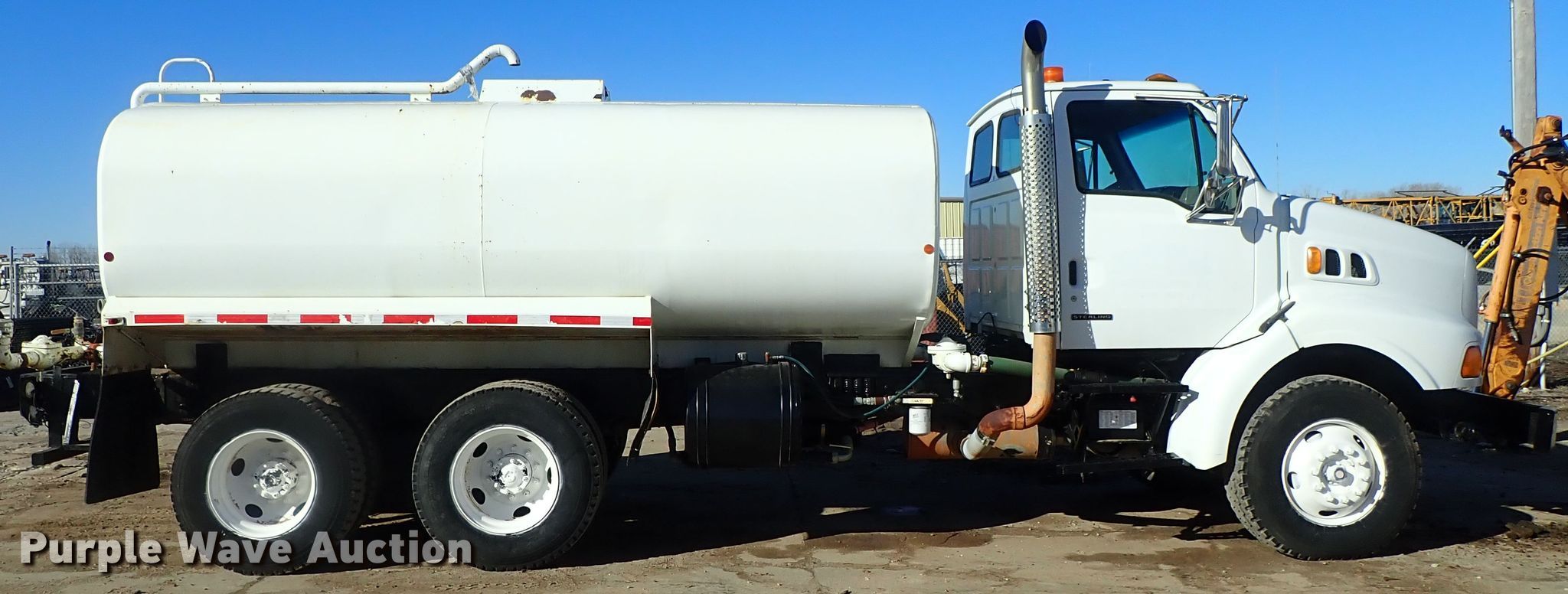 Purple Wave is selling a used Tank Truck or Water Truck in Kansas. This item is a 2000 Sterling L-Line water truck with the following: 104,208 miles on odometer, 12,224 hours on meter, 3,722 PTO hours on meter, Caterpillar 3126 7.2L L6 diesel engine, Automatic transmission, Tandem axle, AC and heat, Cruise, PTO, Klein K-400 steel tank, 15'L x 8'W, Side discharge, Top fill, 3" diameter rear drain, 4" diameter rear outlet, Spring supsnesion, Air brakes, 11R22.5 tires, GVWR 53,220 lbs
