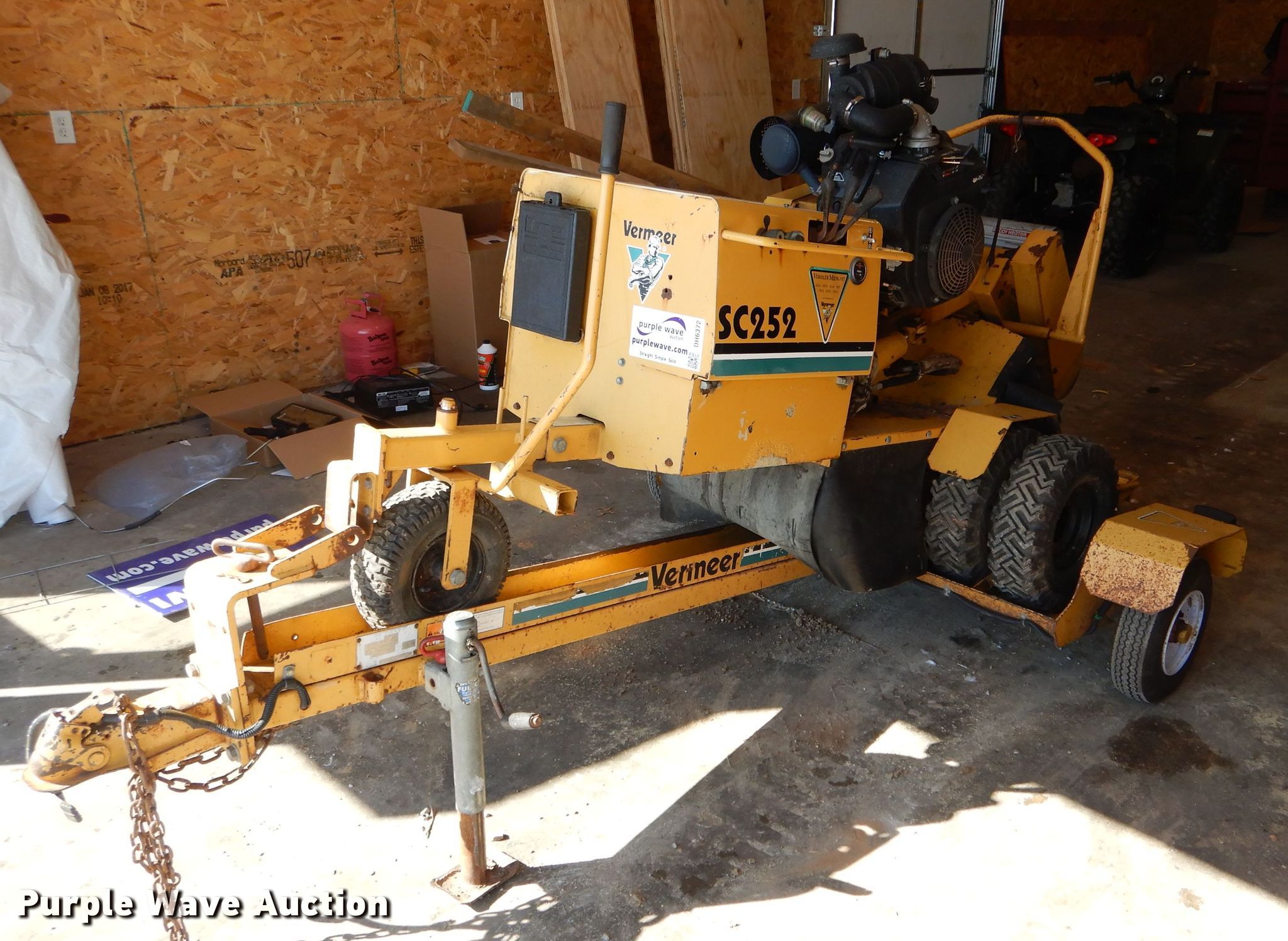 Purple Wave is selling a used Wood Chipper or Stump Grinder in Missouri. This item is a 2003 Vermeer SC252 stump grinder with the following: 1,540 hours on meter, Kohler Command Pro two cylinder gas engine, 25 HP, 17" diameter cutting head, 13 x 5.00- front tries, 5.70-8 rear tires, Trailer model TLR25, Jack stand, 2" ball hitch, 4.80-8 tires, Serial 1VRN071F831007391