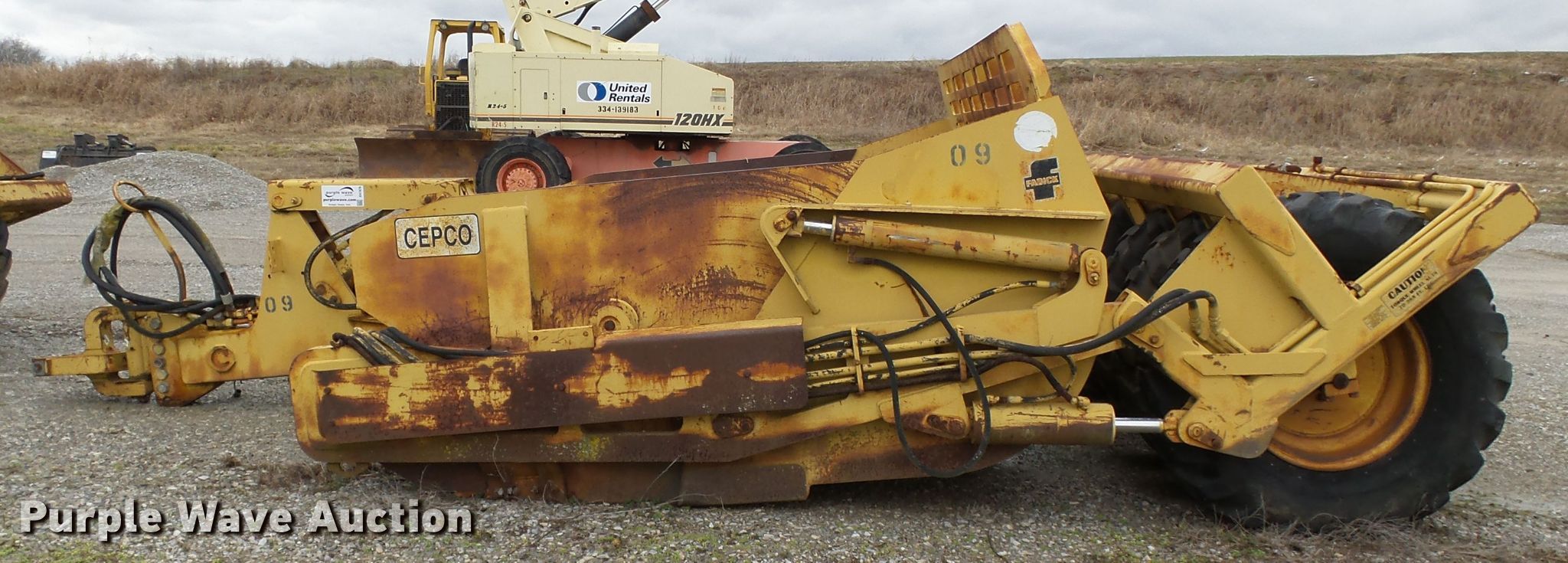 Purple Wave is selling a used Pull Type Scraper in Illinois. This item is a Cepco SP14Y scraper with the following: 9'9" cutting width, 14 cu.yd. capacity, Reversible cutting edge, Hydraulic lift, Rear scraper hitch, 13.00-24 tires, Serial SP14Y000C018, Unit# 09