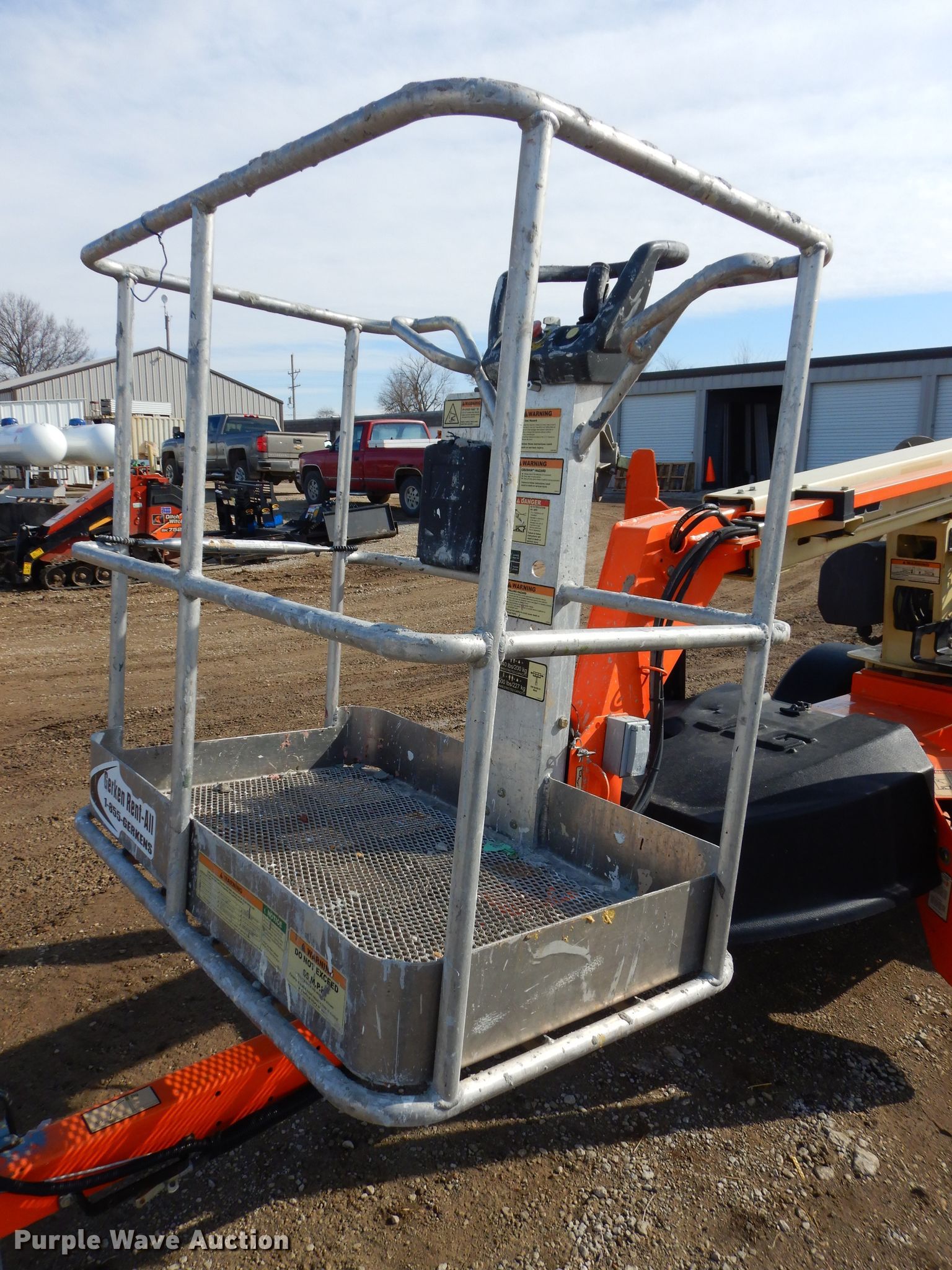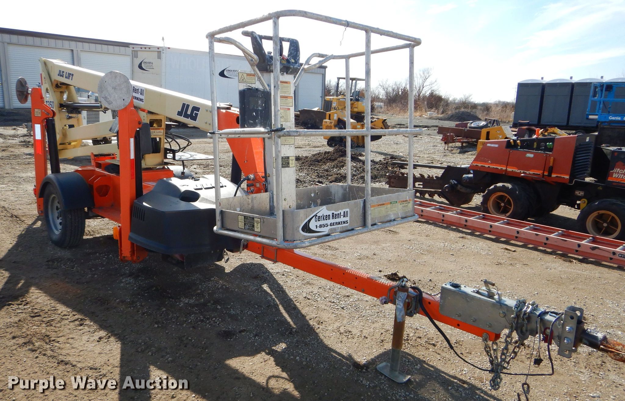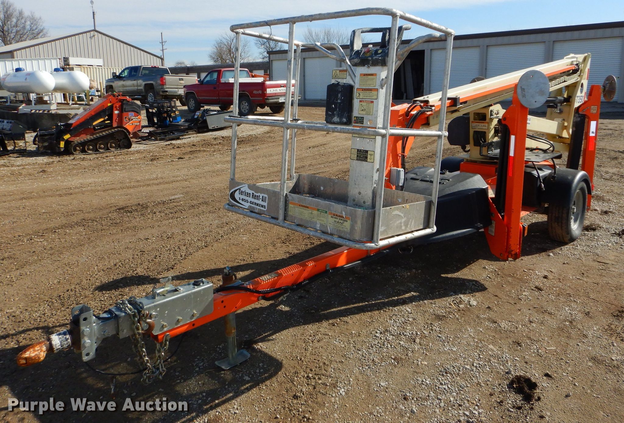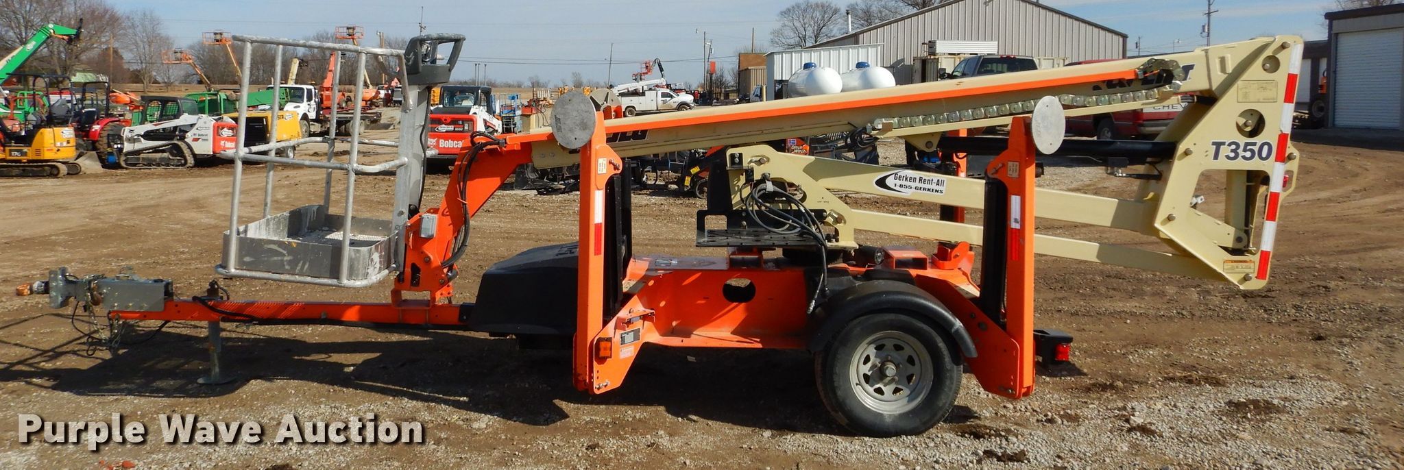 2015 JLG T350 boom lift. 497 hours on meter, Honda single cylinder gas engine, 440 lbs max lift capacity, 35' max lift height, Hydraulic extendable jib, 2.5'L x 4'W platform AC power outlet, Platform air, Platform and ground controls, Hydraulic outriggers, 215/75R14 pneumatic tires, Serial 0030006509. This is worksite support equipment and will not come with a title. Transfer of ownership documentation will be a bill of sale. 5DYACC1J2FP006509. Gerken Rent-all. 31600 Old KC Rd. Paola, KS 66071