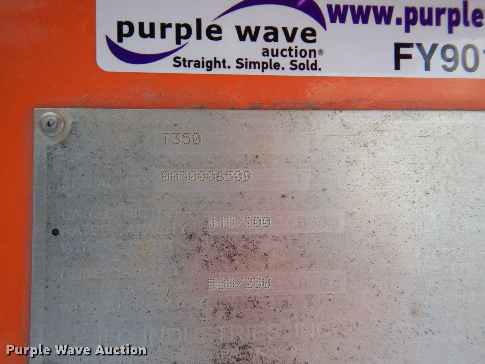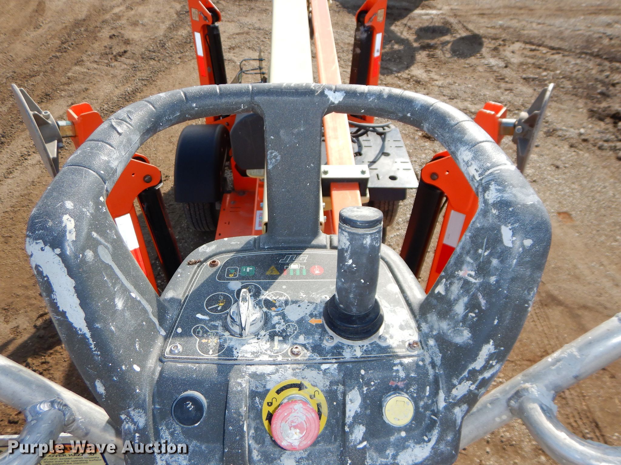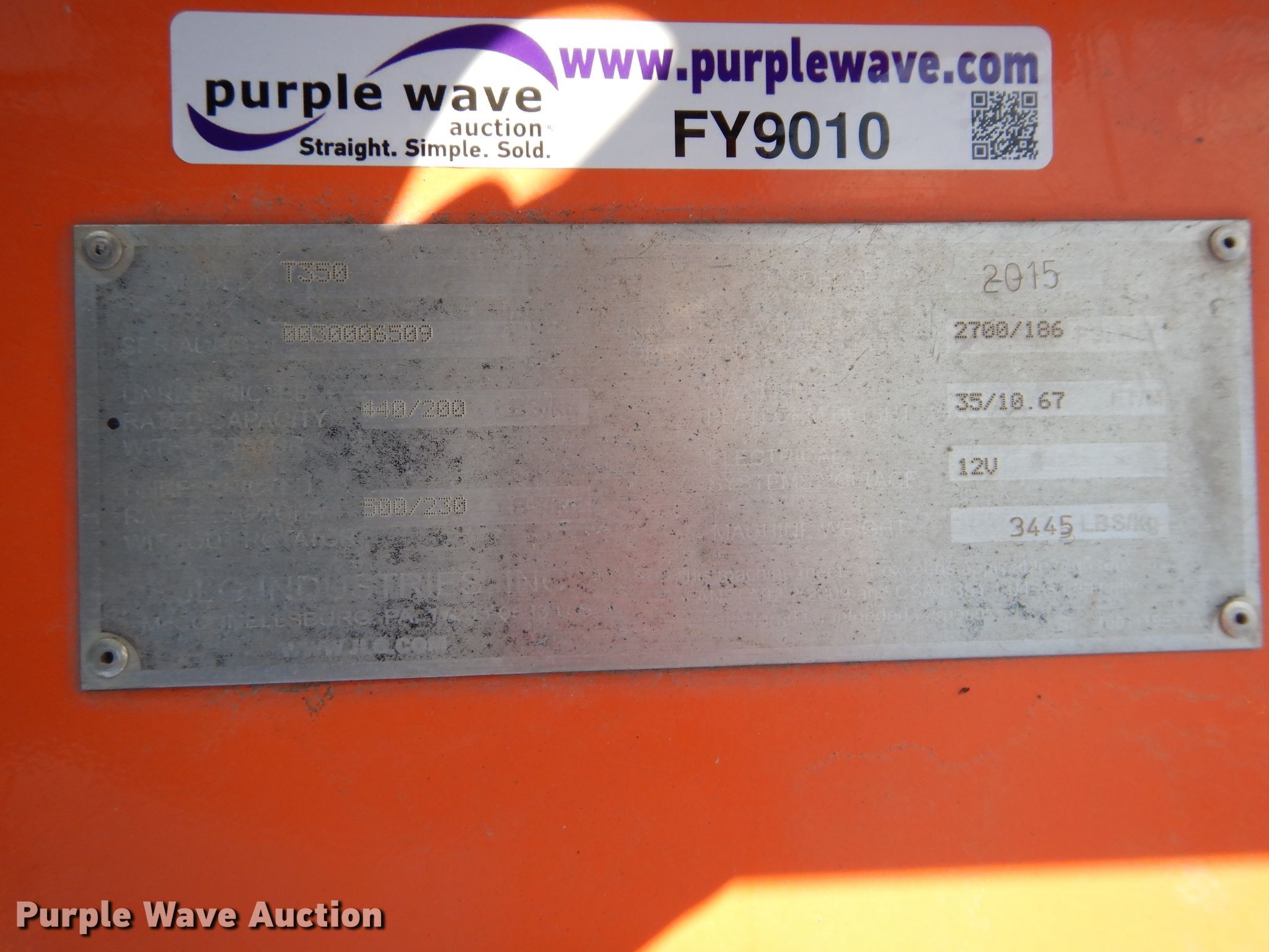Purple Wave is selling a used Boom Lift in Kansas. This item is a 2015 JLG T350 boom lift with the following: 497 hours on meter, Honda single cylinder gas engine, 440 lbs max lift capacity, 35' max lift height, Hydraulic extendable jib, 2.5'L x 4'W platform, AC power outlet, Platform air, Platform and ground controls, Hydraulic outriggers, 215/75R14 pneumatic tires, Serial 0030006509