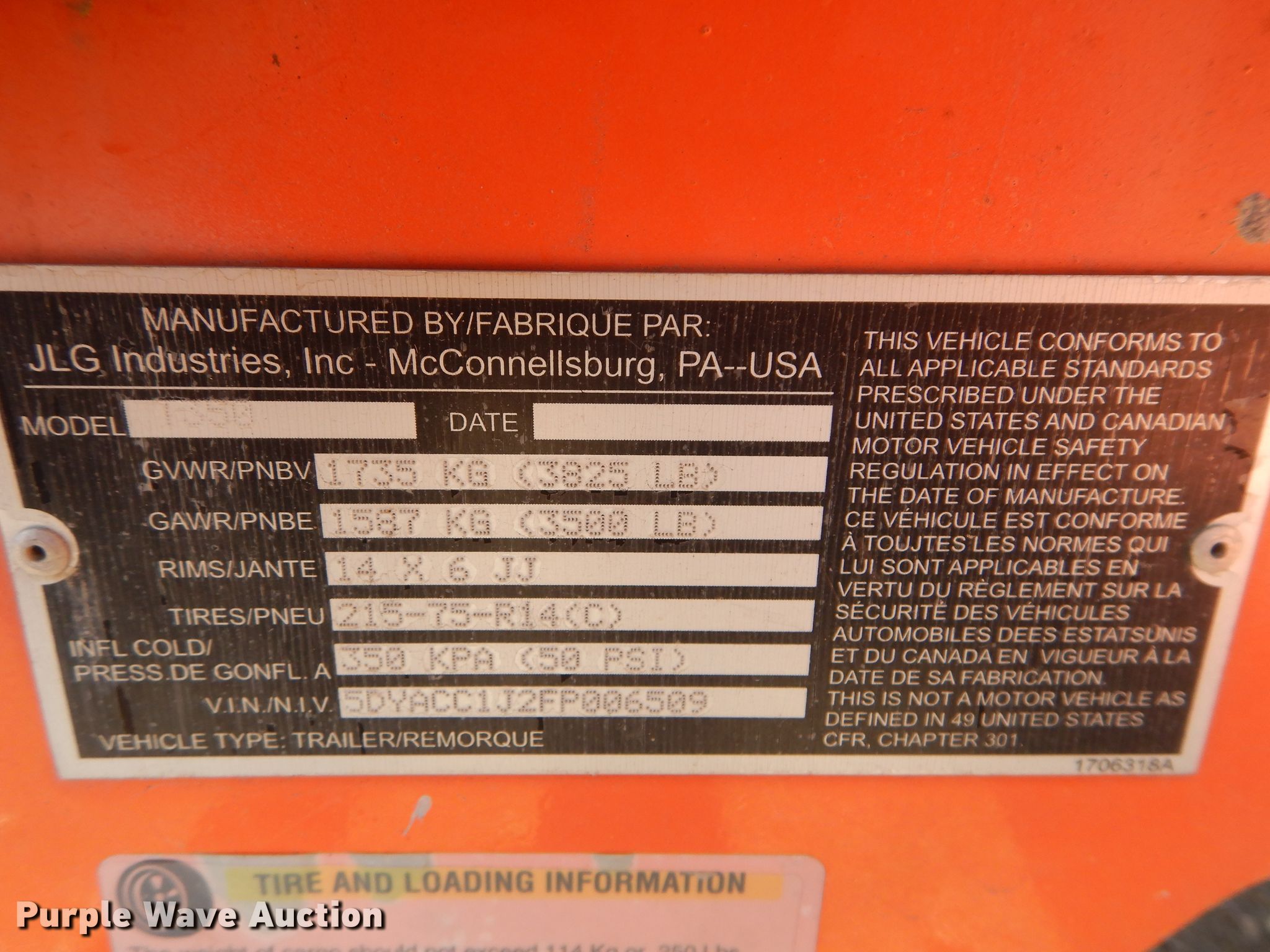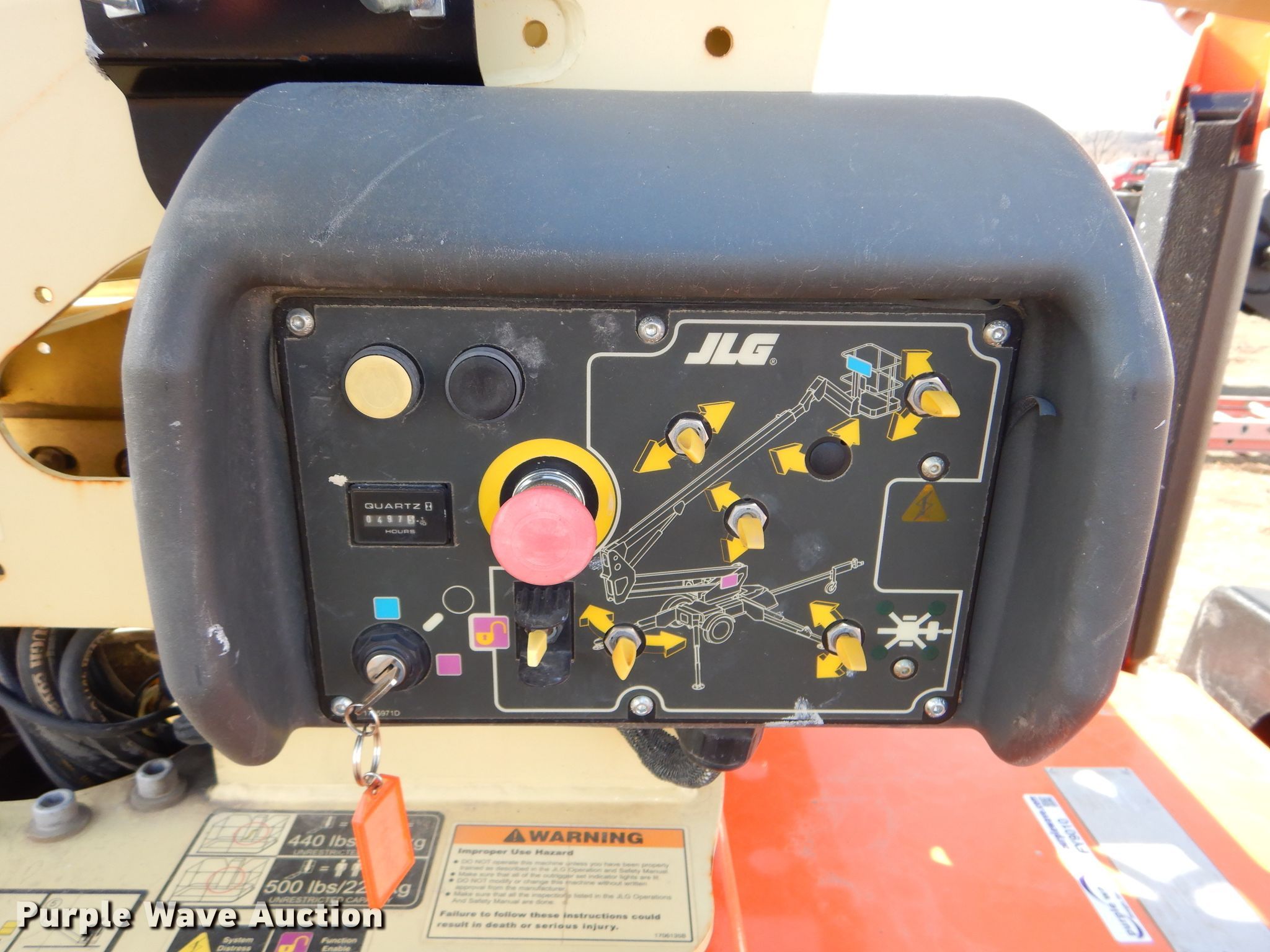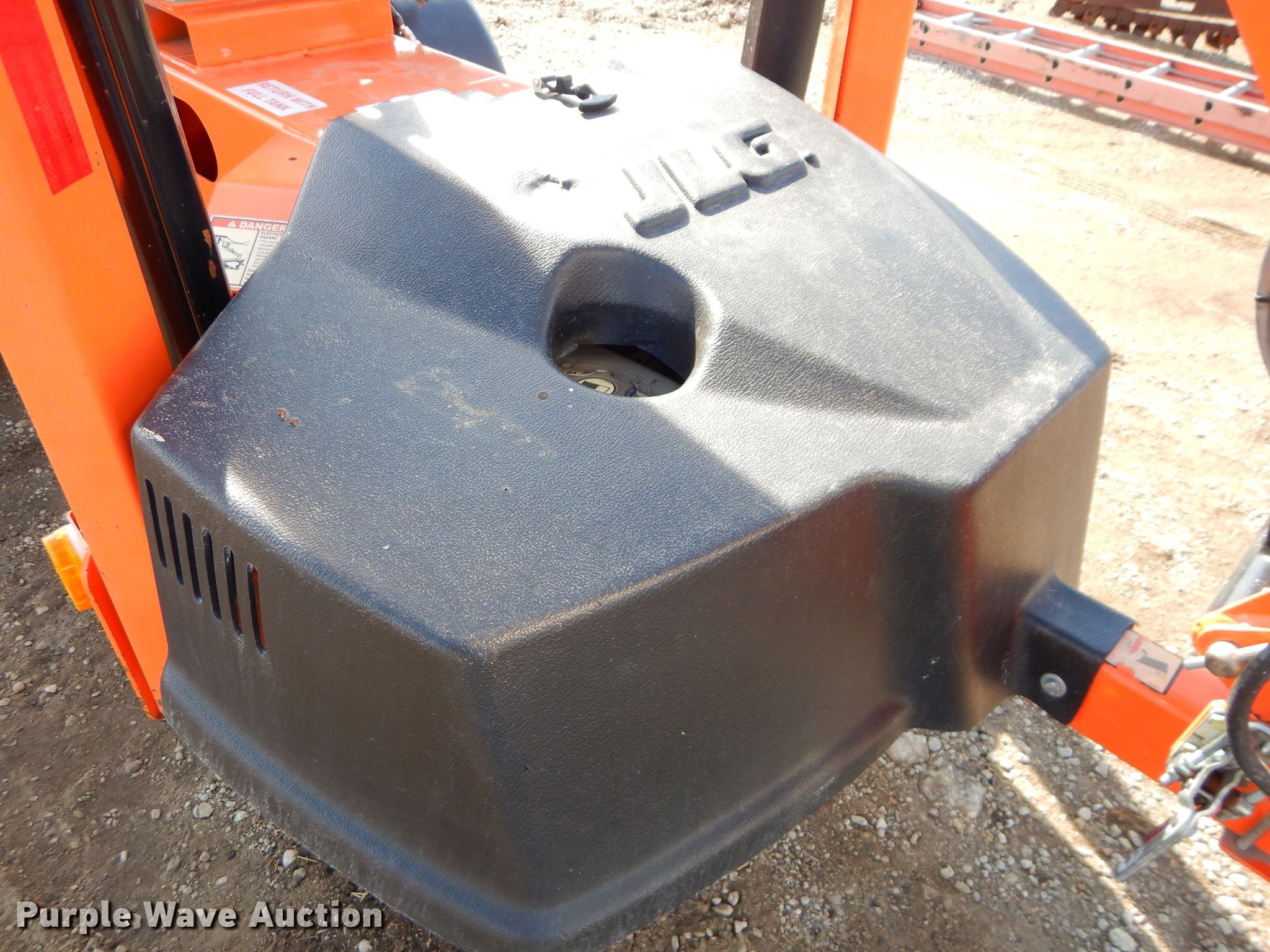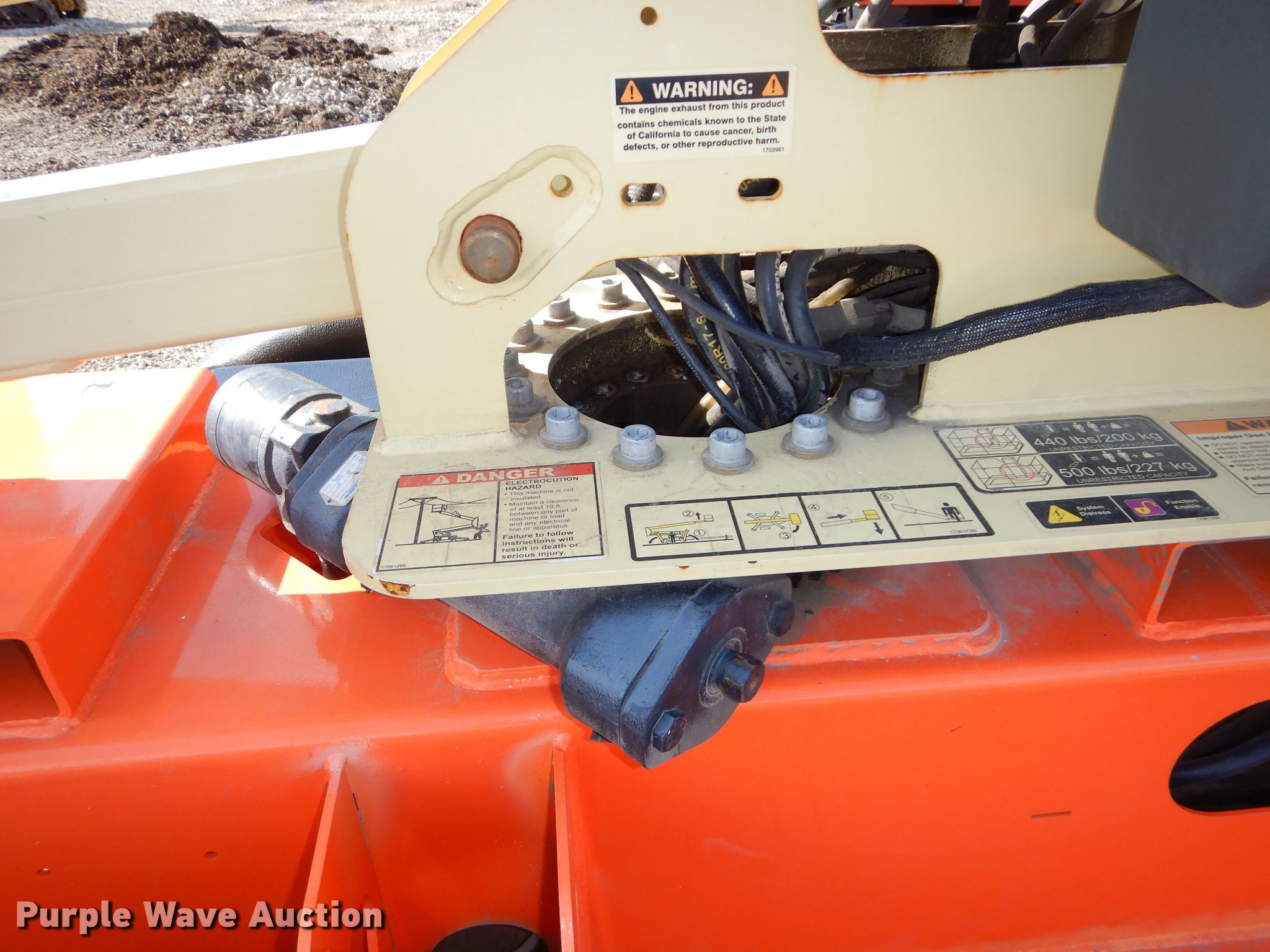 Purple Wave is selling a used Boom Lift in Kansas. This item is a 2015 JLG T350 boom lift with the following: 497 hours on meter, Honda single cylinder gas engine, 440 lbs max lift capacity, 35' max lift height, Hydraulic extendable jib, 2.5'L x 4'W platform, AC power outlet, Platform air, Platform and ground controls, Hydraulic outriggers, 215/75R14 pneumatic tires, Serial 0030006509