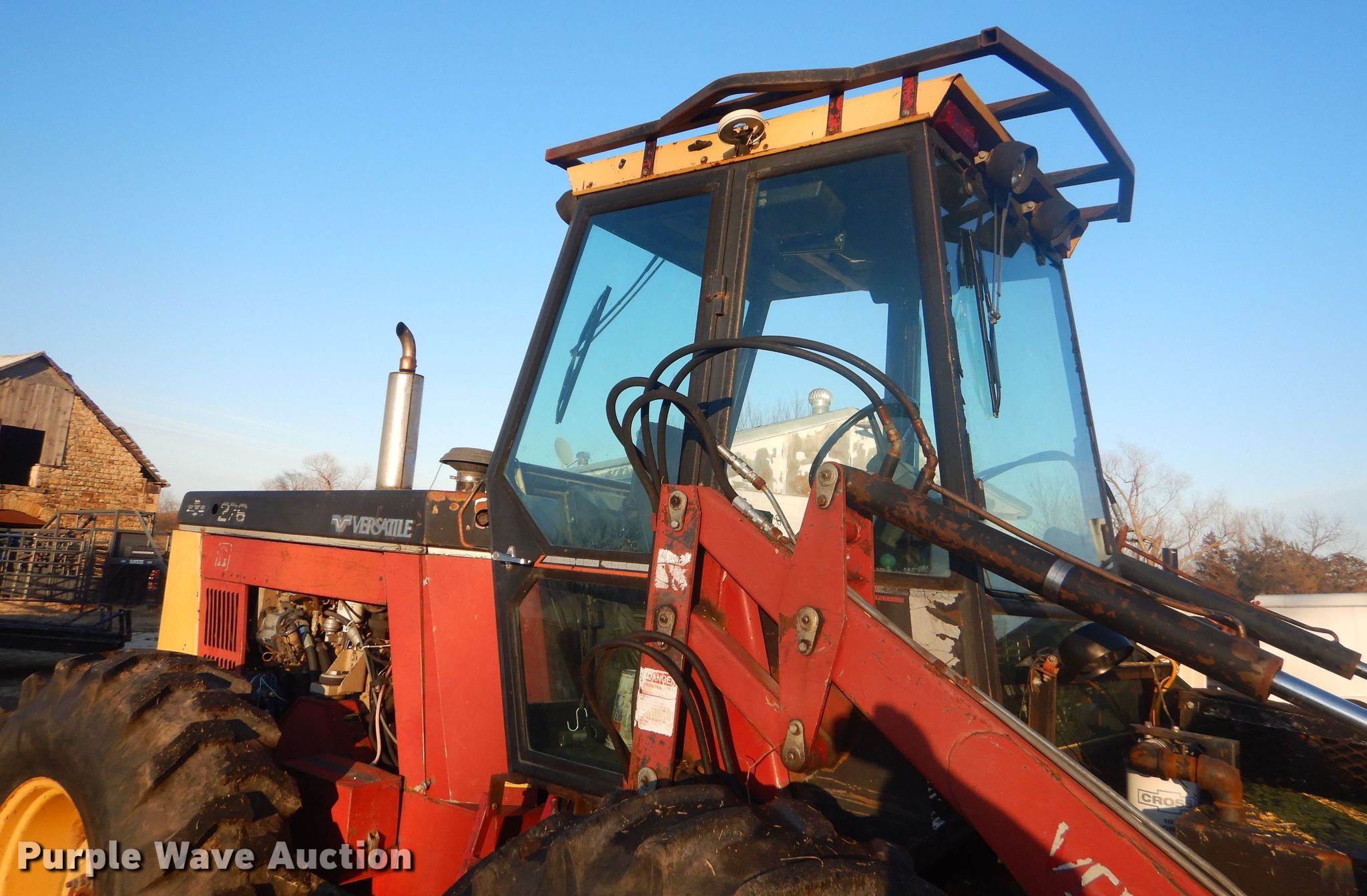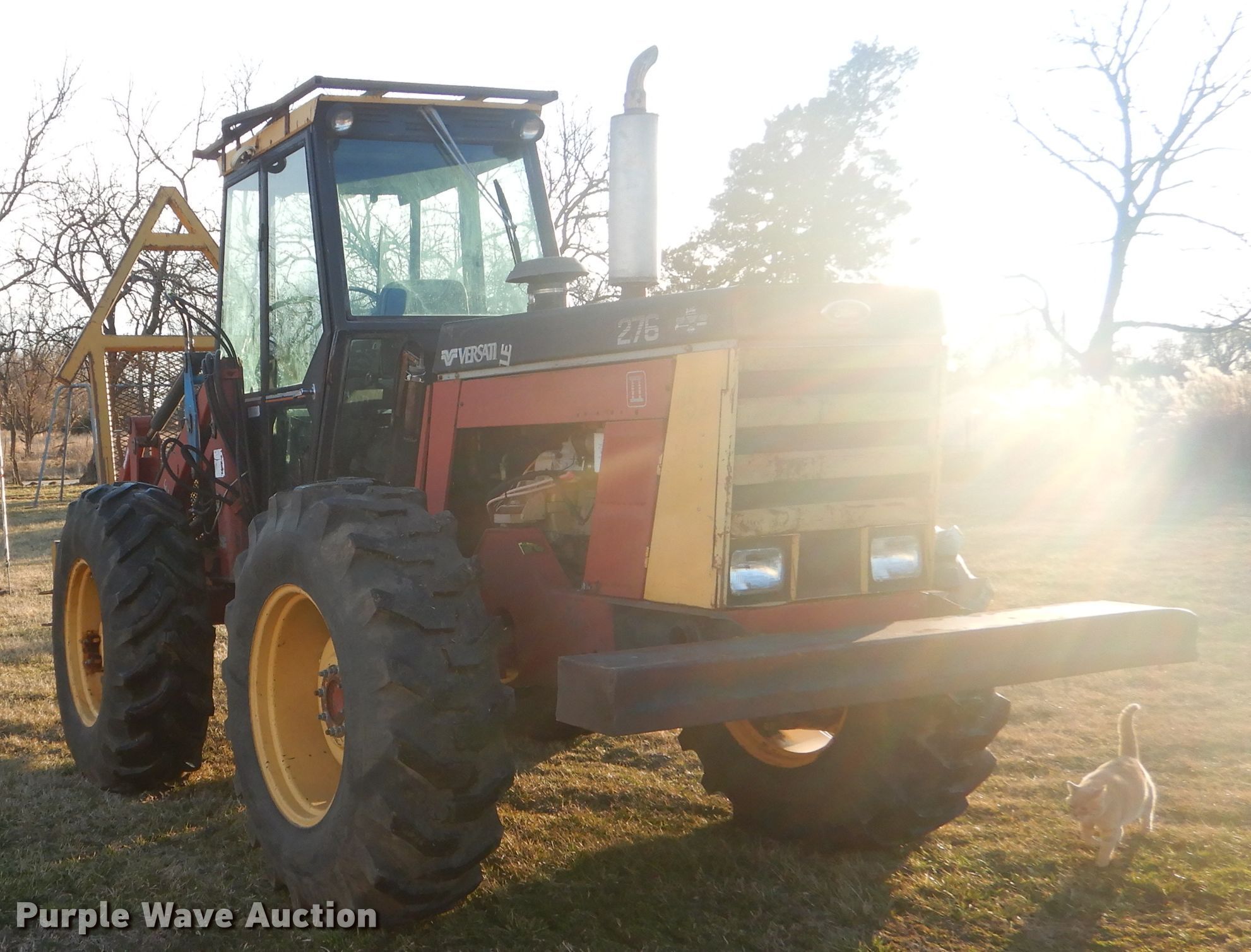 Purple Wave is selling a used Tractor in Kansas. This item is a Ford 276 Versatile bi-directional 4WD tractor with the following: 6,243 hours on meter, Four cylinder diesel engine, 150 HP, Hydrostatic transmission, 3F, AC and heat, Three point, 540/1000 PTO, 40 gpm capacity, 16.9-28 tires, Tree saw not included