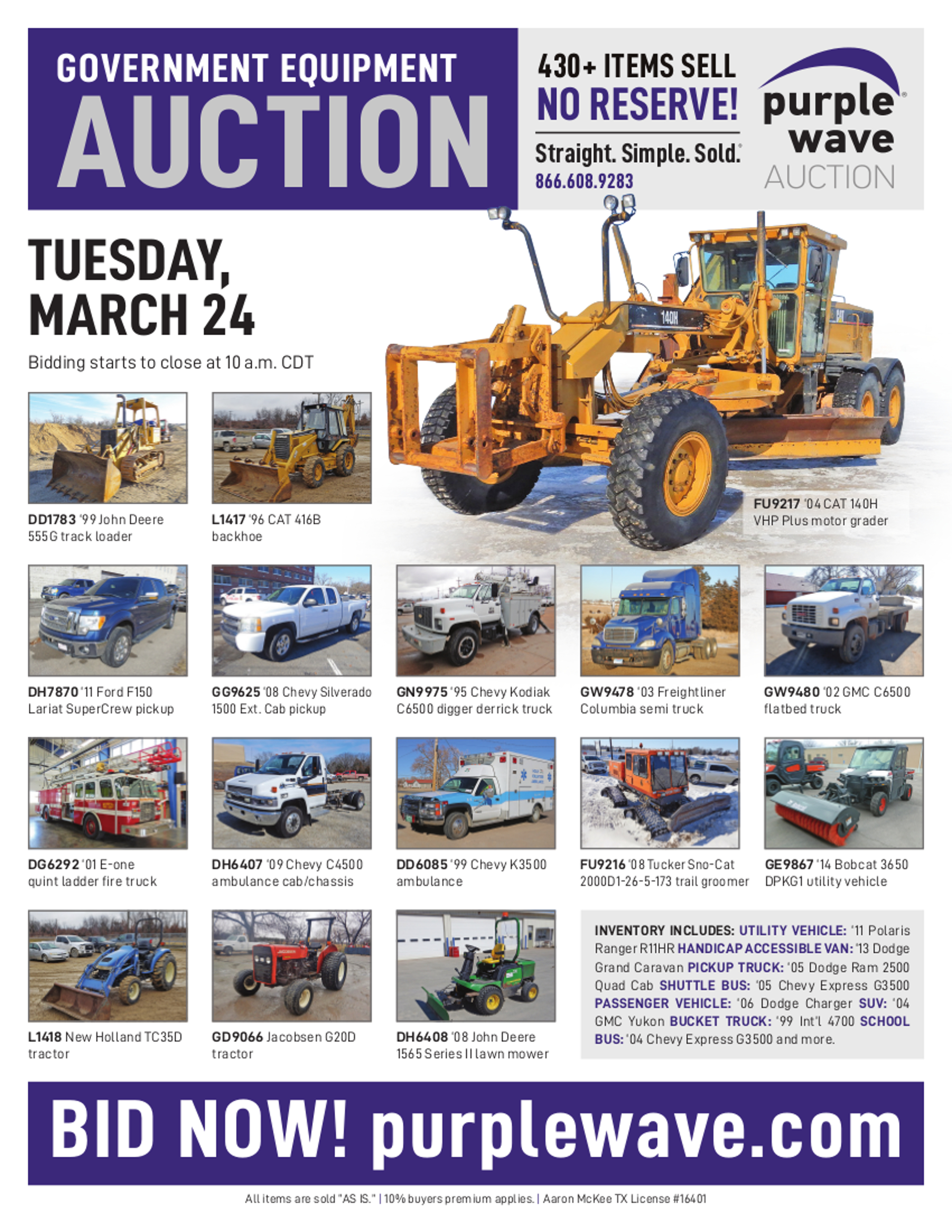 This auction is conducted by Purple Wave, Inc., whose home office is 825 Levee Drive, Manhattan, Kansas. Aaron McKee, Texas auctioneer license # 16401, operates Purple Wave, Inc. Complaints against us may be directed to the Texas Department of Licensing and Regulation, P.O. Box 12157, Austin, Texas 78711, (512) 463-6599. For additional required information, see the attached document.