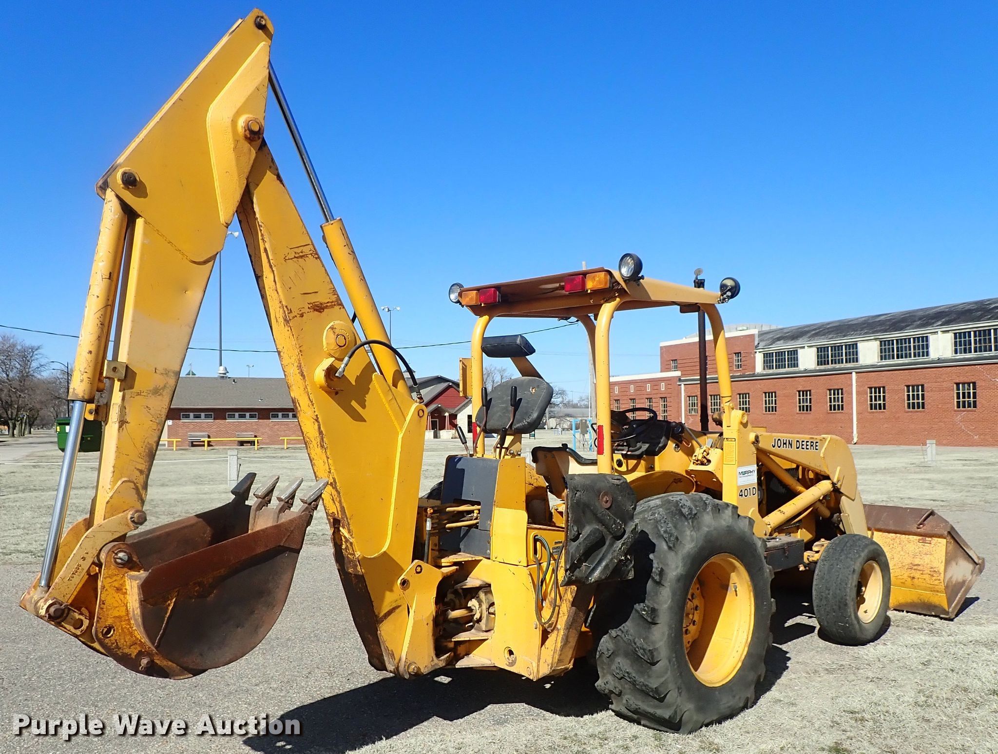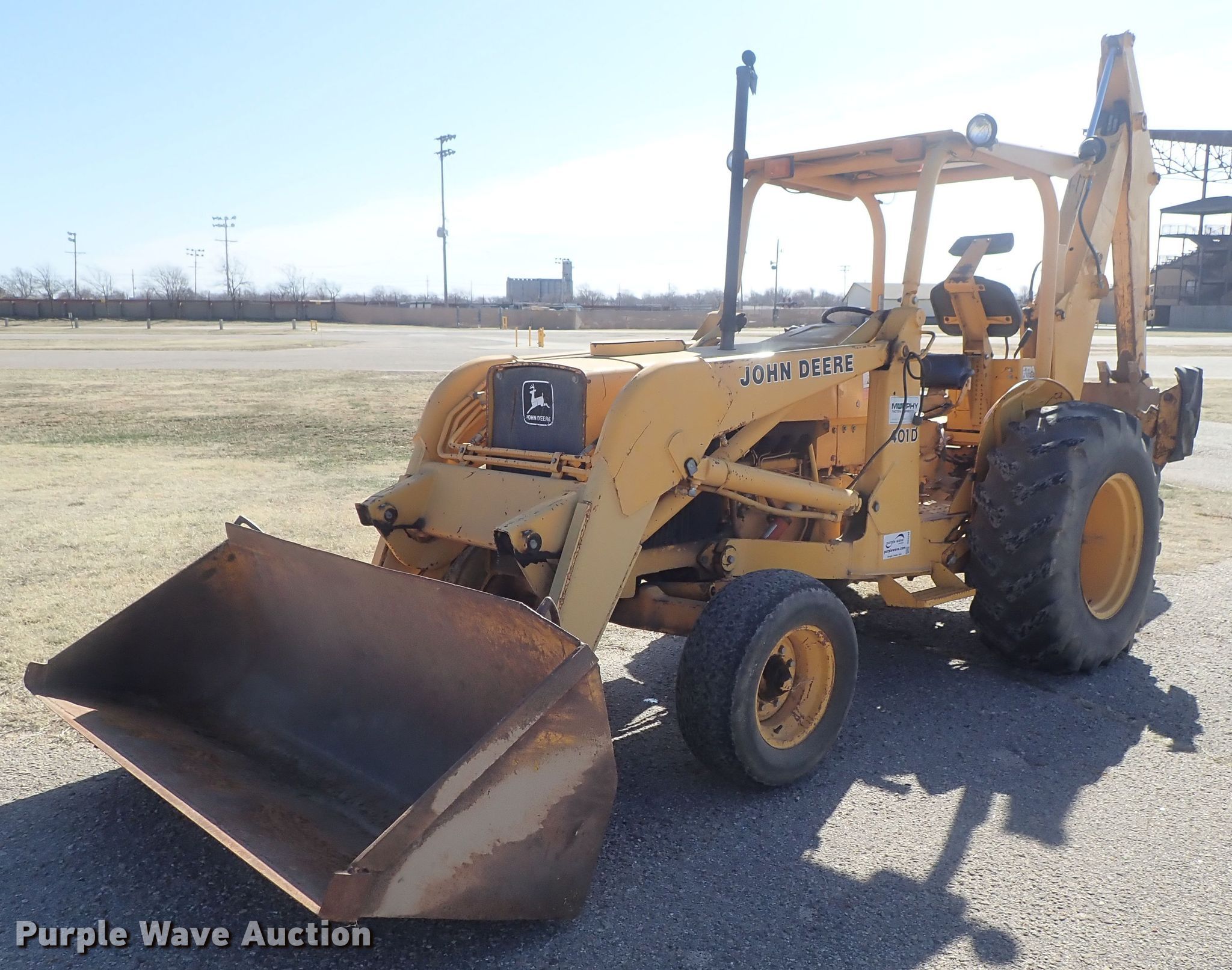 Purple Wave is selling a used Tractor Loader Backhoe in Kansas. This item is a 1985 John Deere 401D backhoe with the following: 2,629 hours on meter, John Deere four cylinder diesel engine, Shuttle shift transmission, 8F-8R geras, Canopy, Wobble stick backhoe controls, 80"W loader bucket, Weld-on cutting edge, 24"W backhoe bucket, Weld-on cutting edge, (4) teeth, Auxiliary hydraulics, 11L-15 front tires, 16.9-24 rear tires, Serial T0401DE716152