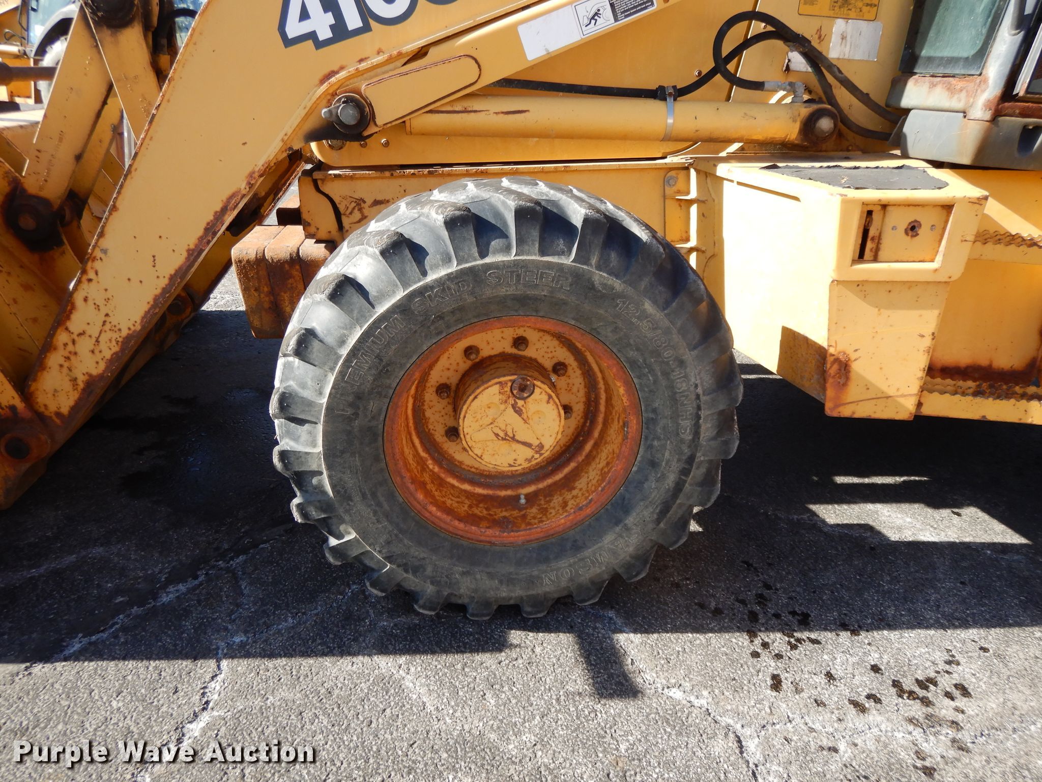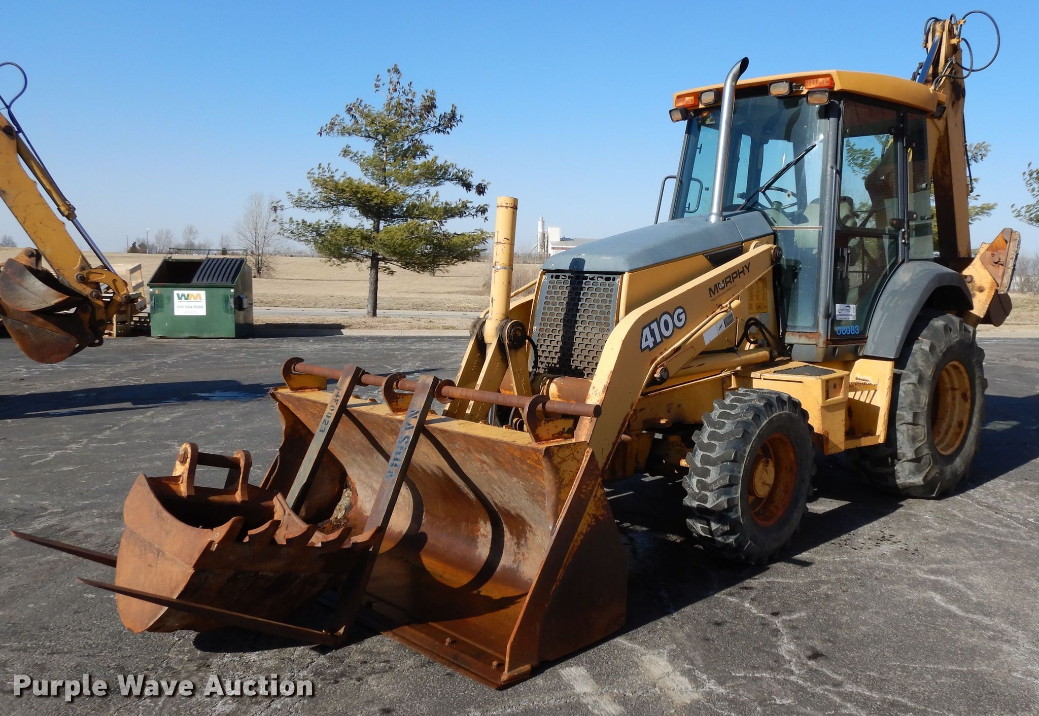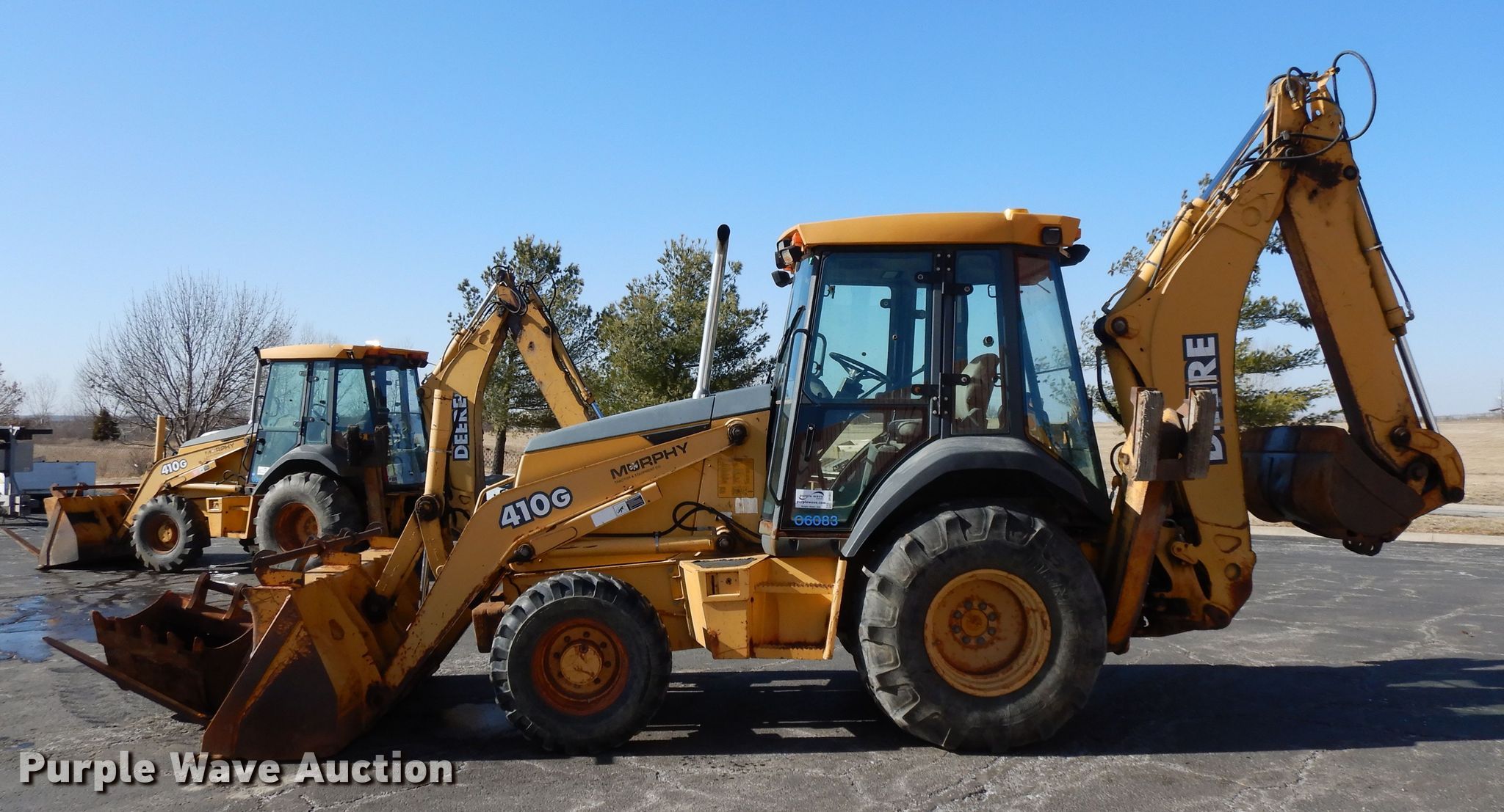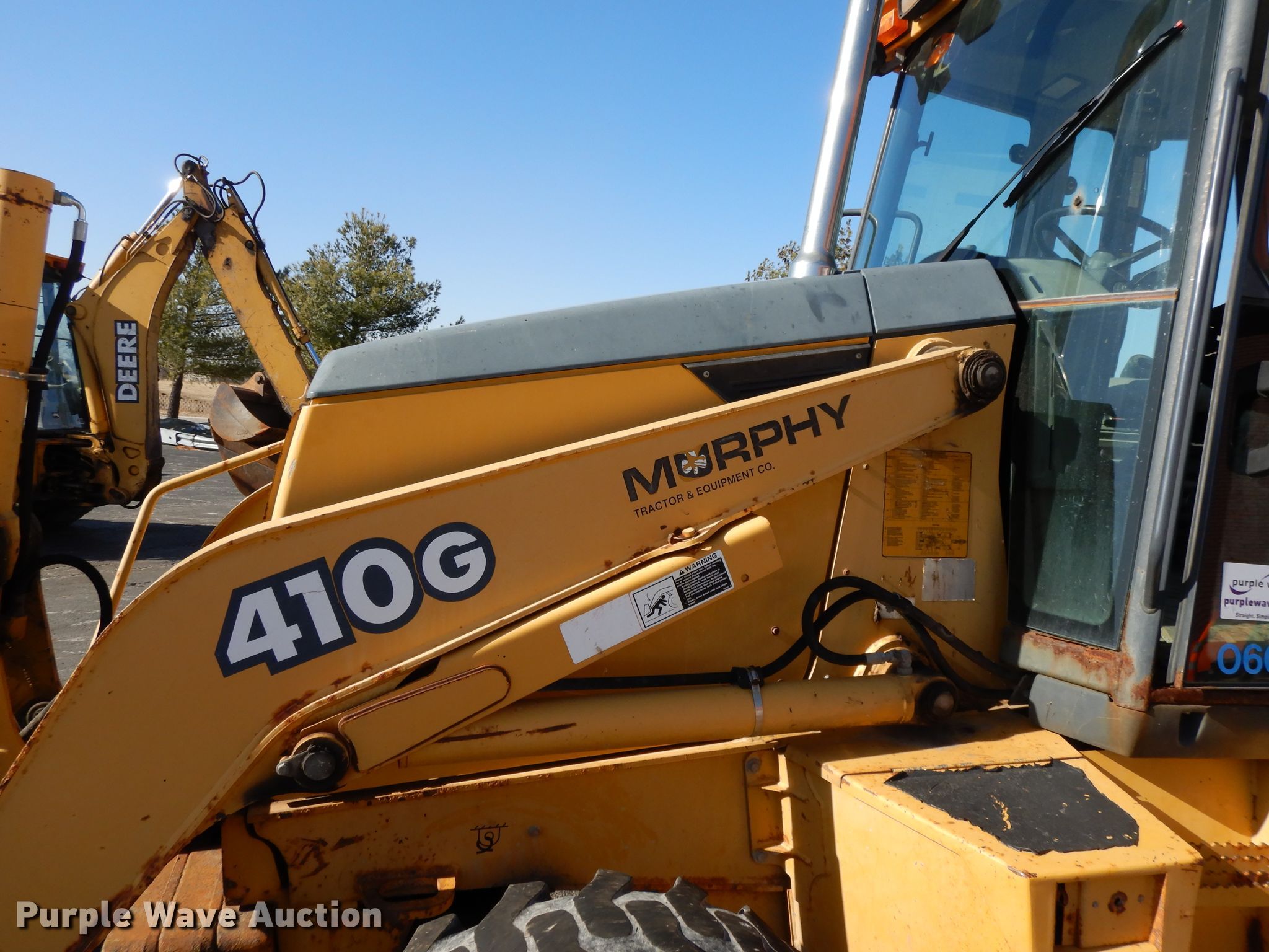 Purple Wave is selling a used Tractor Loader Backhoe in Missouri. This item is a 2003 John Deere 410G backhoe with the following: 3,741 hours on meter, Six cylinder diesel engine, Shuttle shift transmission, 4F-4R gears, Four wheel drive, EROPS, AC and heat, Two stick backhoe controls, 92"W loader bucket, Bolt-on cutting edge, 42"L pallet forks, 48"W backhoe bucket, Weld-on cutting edge, 24"W backhoe bucket, (5) teeth, 7.5 cu.ft. capacity, 12.5/80-18 front tires, 21L-24 rear tires, Front tire leaks, Serial T0410GX918292, MODOT ID 06083