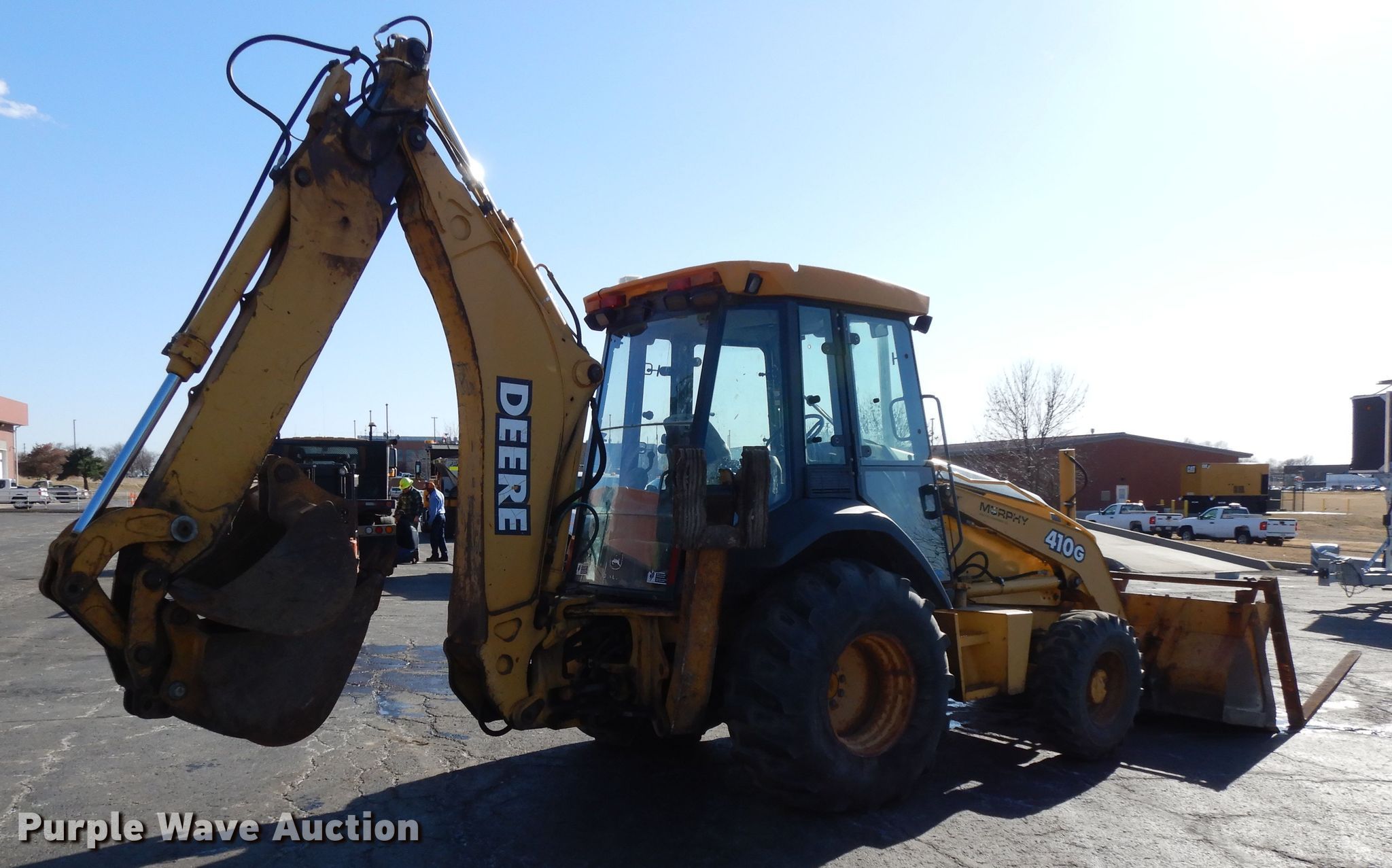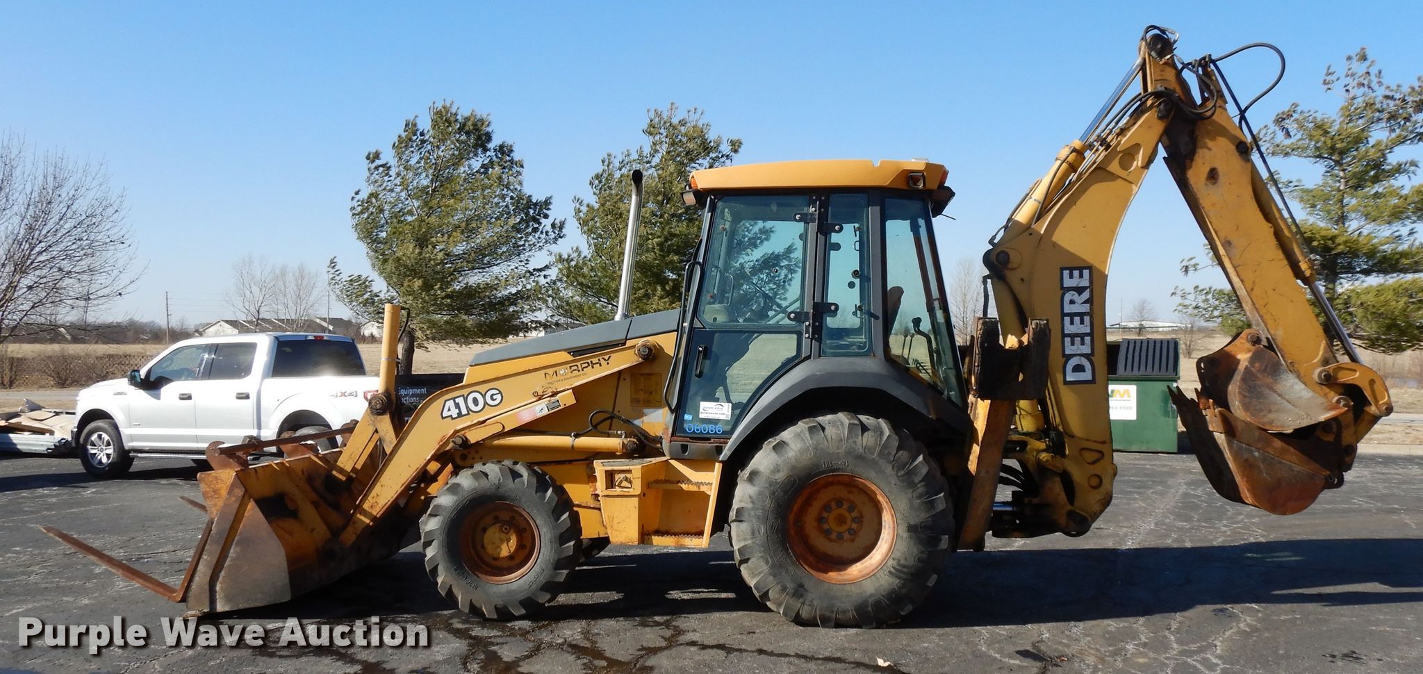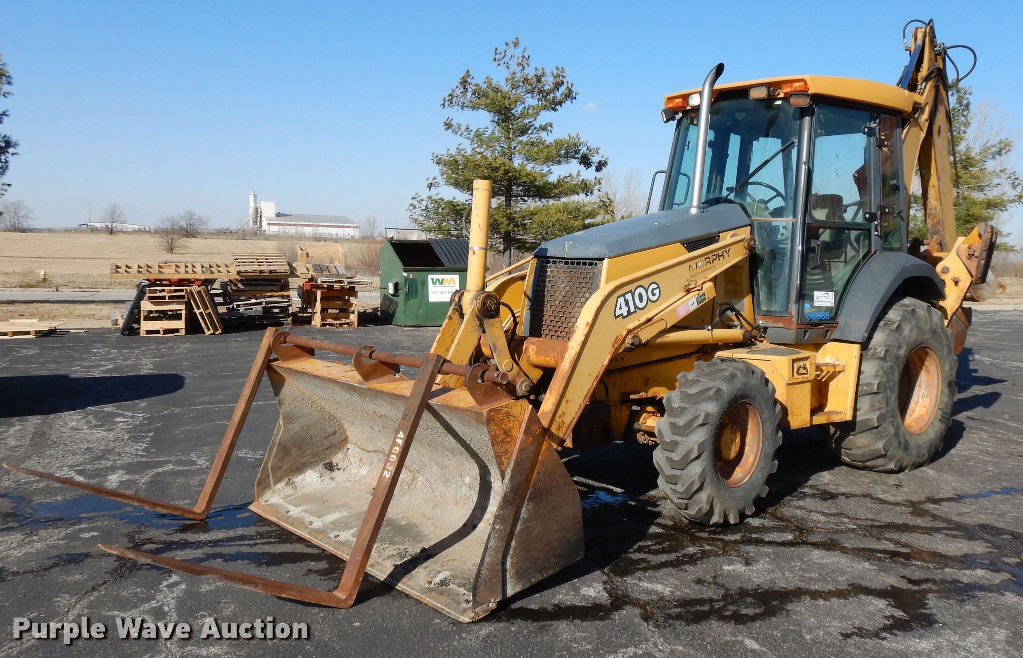 Purple Wave is selling a used Tractor Loader Backhoe in Missouri. This item is a 2003 John Deere 410G backhoe with the following: 4,002 hours on meter, Six cylinder diesel engine, Shuttle shift transmission, 4F-4R gears, Four wheel drive, EROPS, AC and heat, Two stick backhoe controls, 92"W loader bucket, Bolt-on cutting edge, 42"L pallet forks, 24"W backhoe bucket, Weld-on cutting edge, (4) teeth, 48"W backhoe bucket, Weld-on cutting edge, 12.5/80-18 front tires, 21L-24 rear tires, Stop buzzer comes on while moving, Serial T0410GX918607, MODOT ID 06086