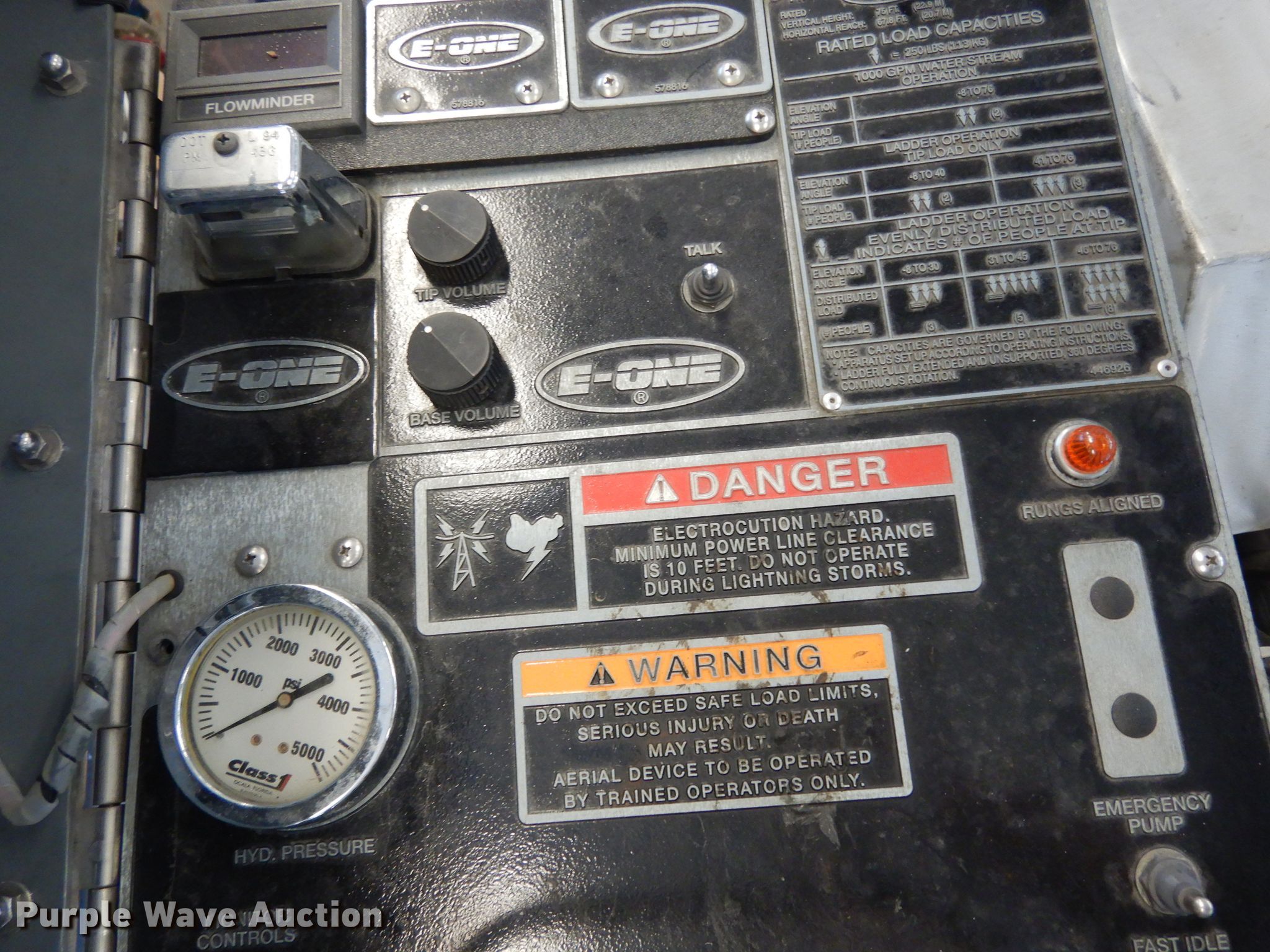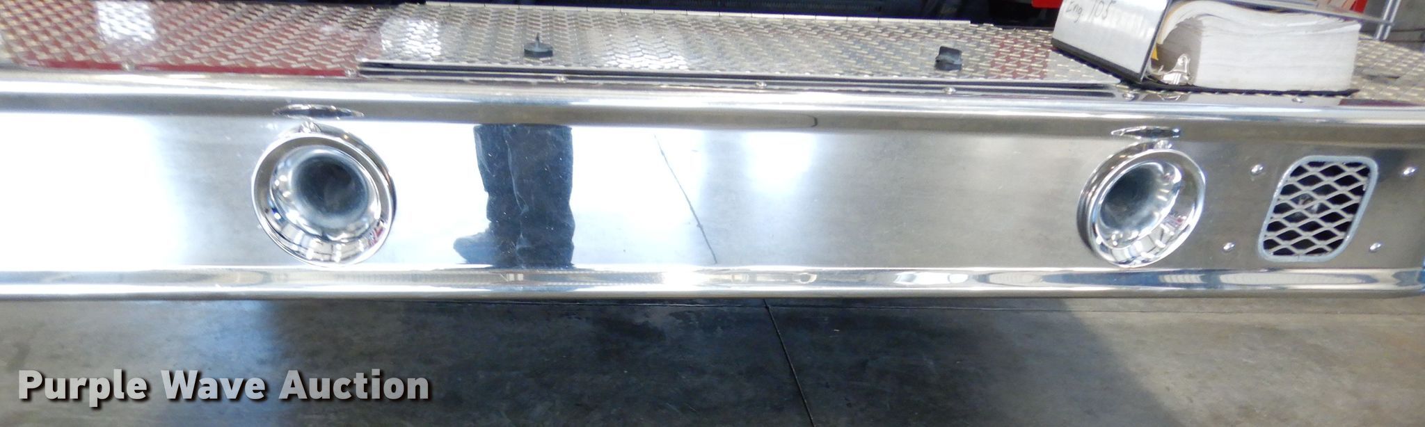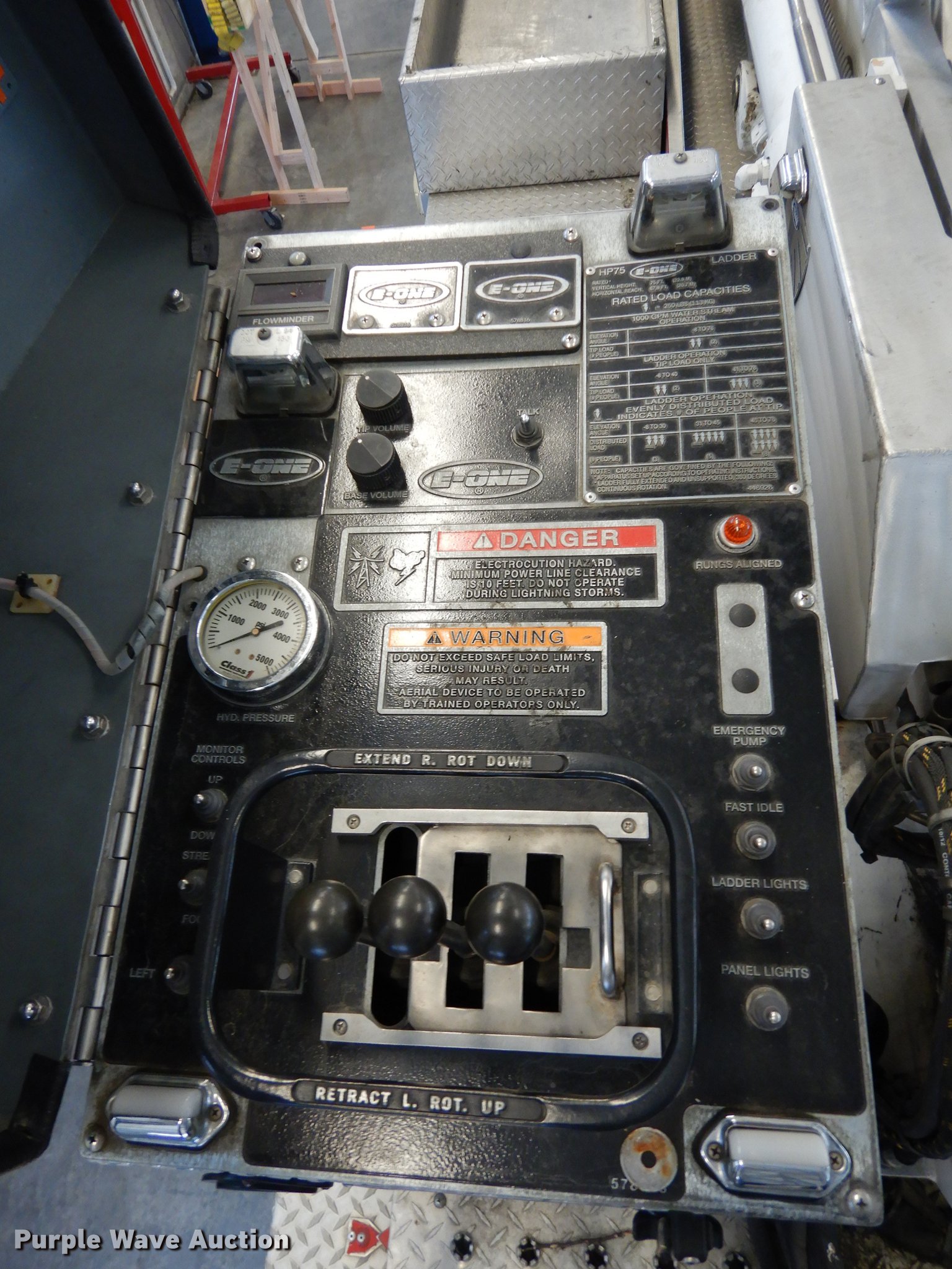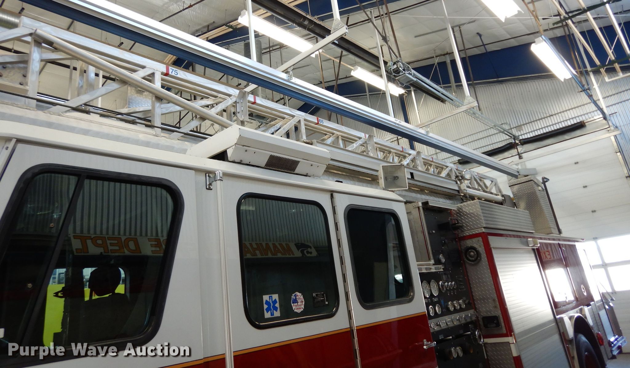 Purple Wave is selling a used Fire Truck or Emergency Vehicle in Kansas. This item is a 2001 E-one quint ladder fire truck with the following: 103,534 miles on odometer, 10,349 hours on meter, Cummins ISMC 10.8L L6 diesel engine, 450 HP, Allison automatic transmission, Single axle, AC and heat, E-One HP75 Cyclone II Sidestacker 75 aerial platform, 75' max lift height, Akromatic ladder gun, 1,000 gpm, Hale 1,500 gpm pump, 500 gallon water tank, (4) ladders, 10' attic ladder, 24' extension ladder, 35' extension ladder, 20' roof ladder, Rear stabilizers, Double frame, Spring suspension, Air brakes, 210" wheelbase, Goodyear 385/65R22.5 front tires, Goodyear 315/80R22.5 rear tires, GVWR 49,700 lbs, Owner/operator manual and CD, Dead battery, Passenger seat missing, Non-operational ladder, Swivel assembly removed, One frame cracked at driver side rear axle, Decals will be removed prior to auction