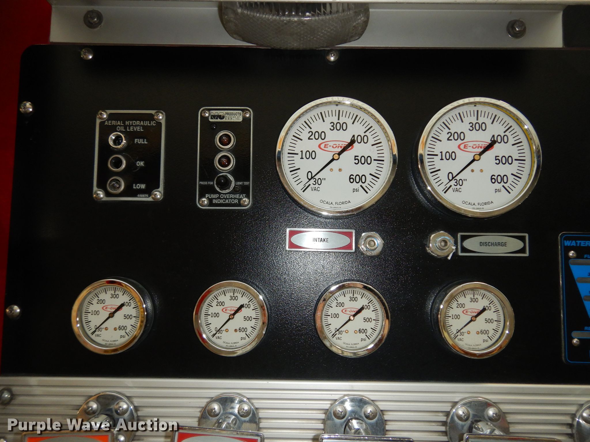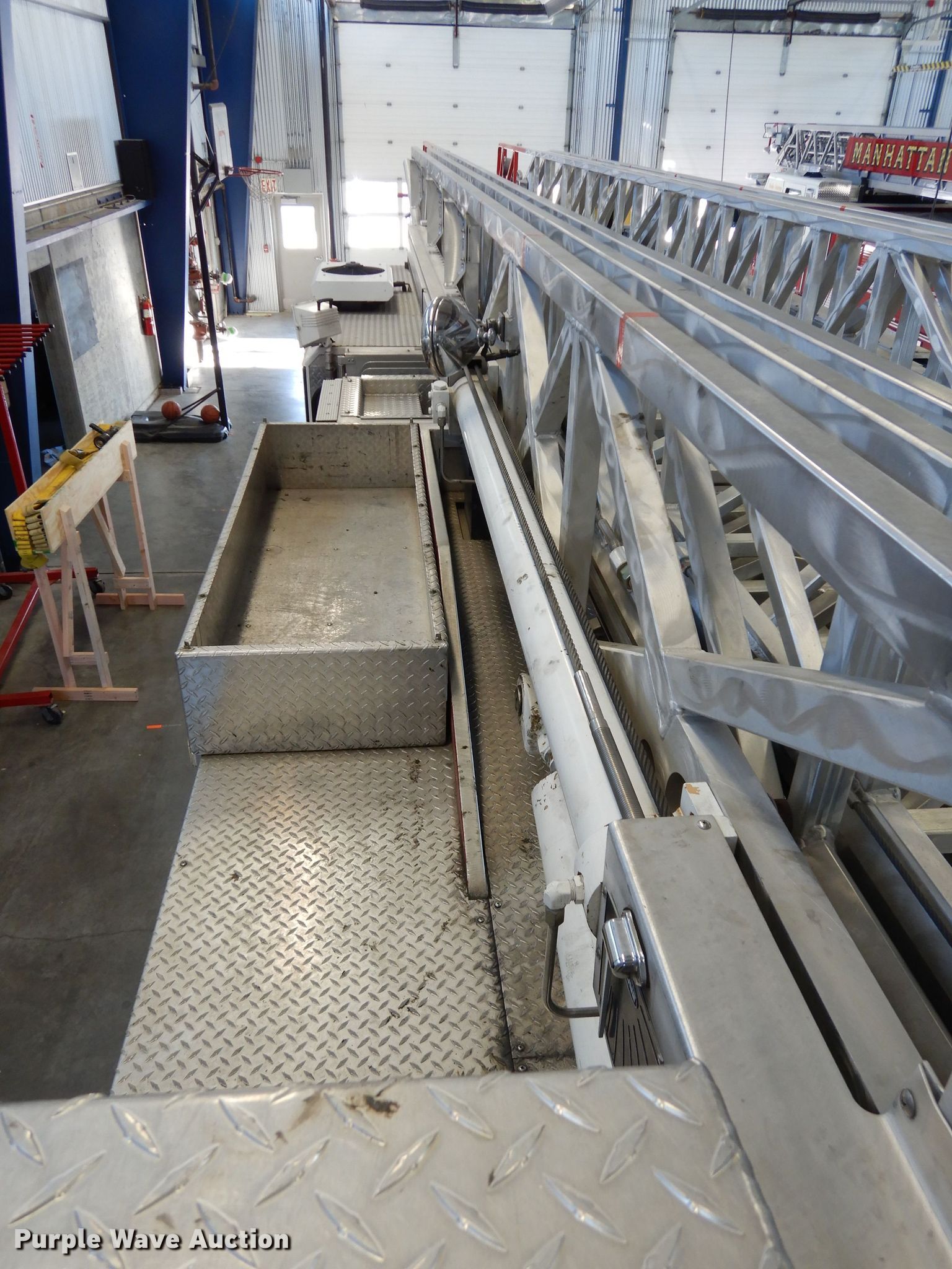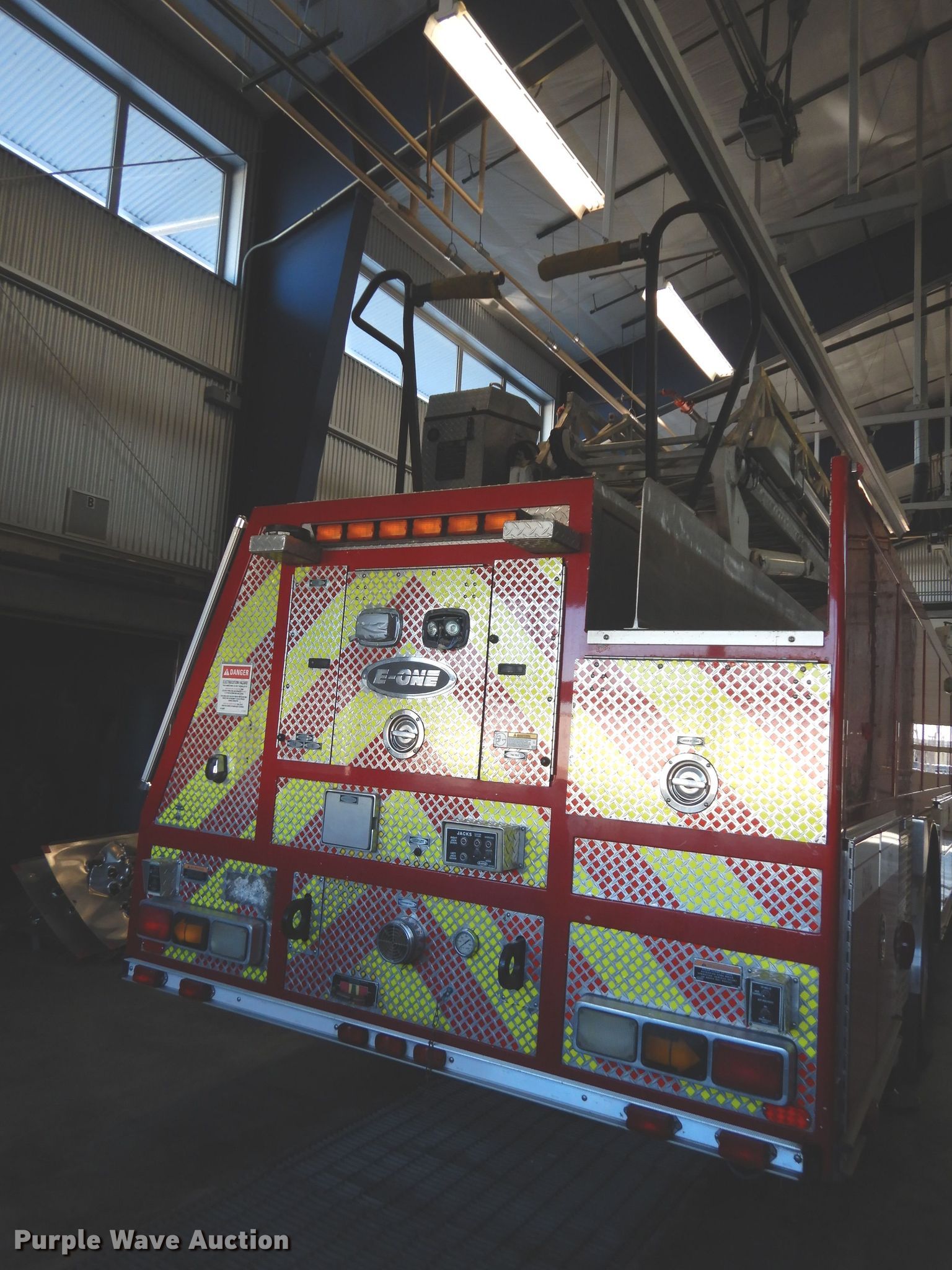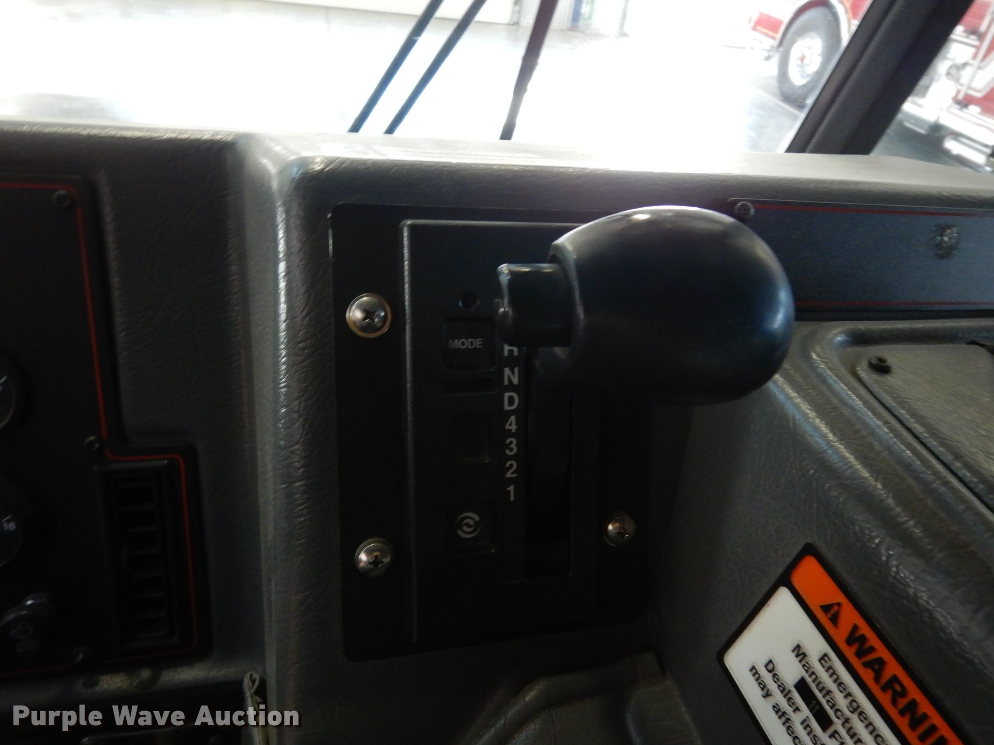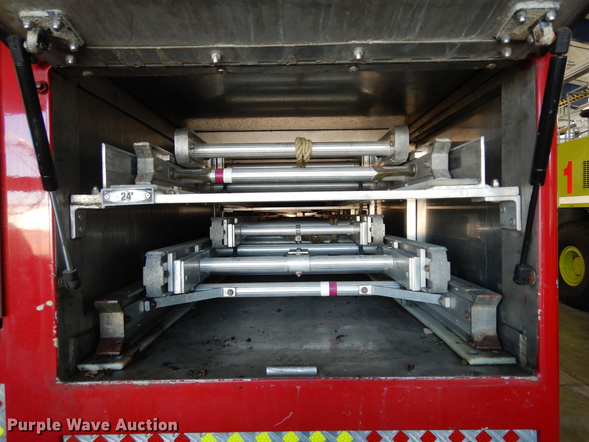 Purple Wave is selling a used Fire Truck or Emergency Vehicle in Kansas. This item is a 2001 E-one quint ladder fire truck with the following: 103,534 miles on odometer, 10,349 hours on meter, Cummins ISMC 10.8L L6 diesel engine, 450 HP, Allison automatic transmission, Single axle, AC and heat, E-One HP75 Cyclone II Sidestacker 75 aerial platform, 75' max lift height, Akromatic ladder gun, 1,000 gpm, Hale 1,500 gpm pump, 500 gallon water tank, (4) ladders, 10' attic ladder, 24' extension ladder, 35' extension ladder, 20' roof ladder, Rear stabilizers, Double frame, Spring suspension, Air brakes, 210" wheelbase, Goodyear 385/65R22.5 front tires, Goodyear 315/80R22.5 rear tires, GVWR 49,700 lbs, Owner/operator manual and CD, Dead battery, Passenger seat missing, Non-operational ladder, Swivel assembly removed, One frame cracked at driver side rear axle, Decals will be removed prior to auction