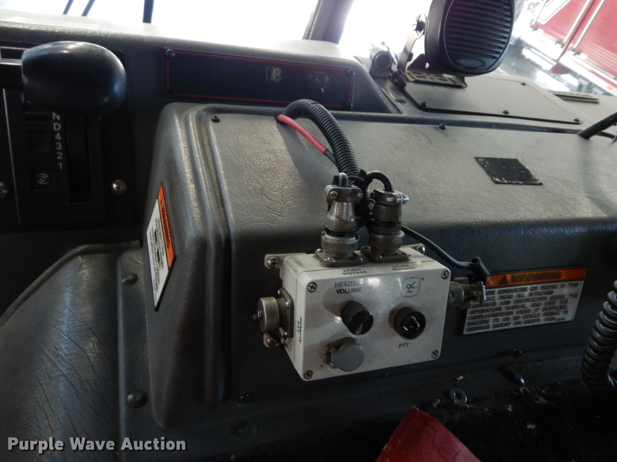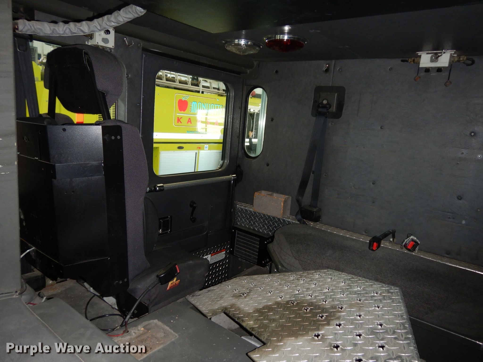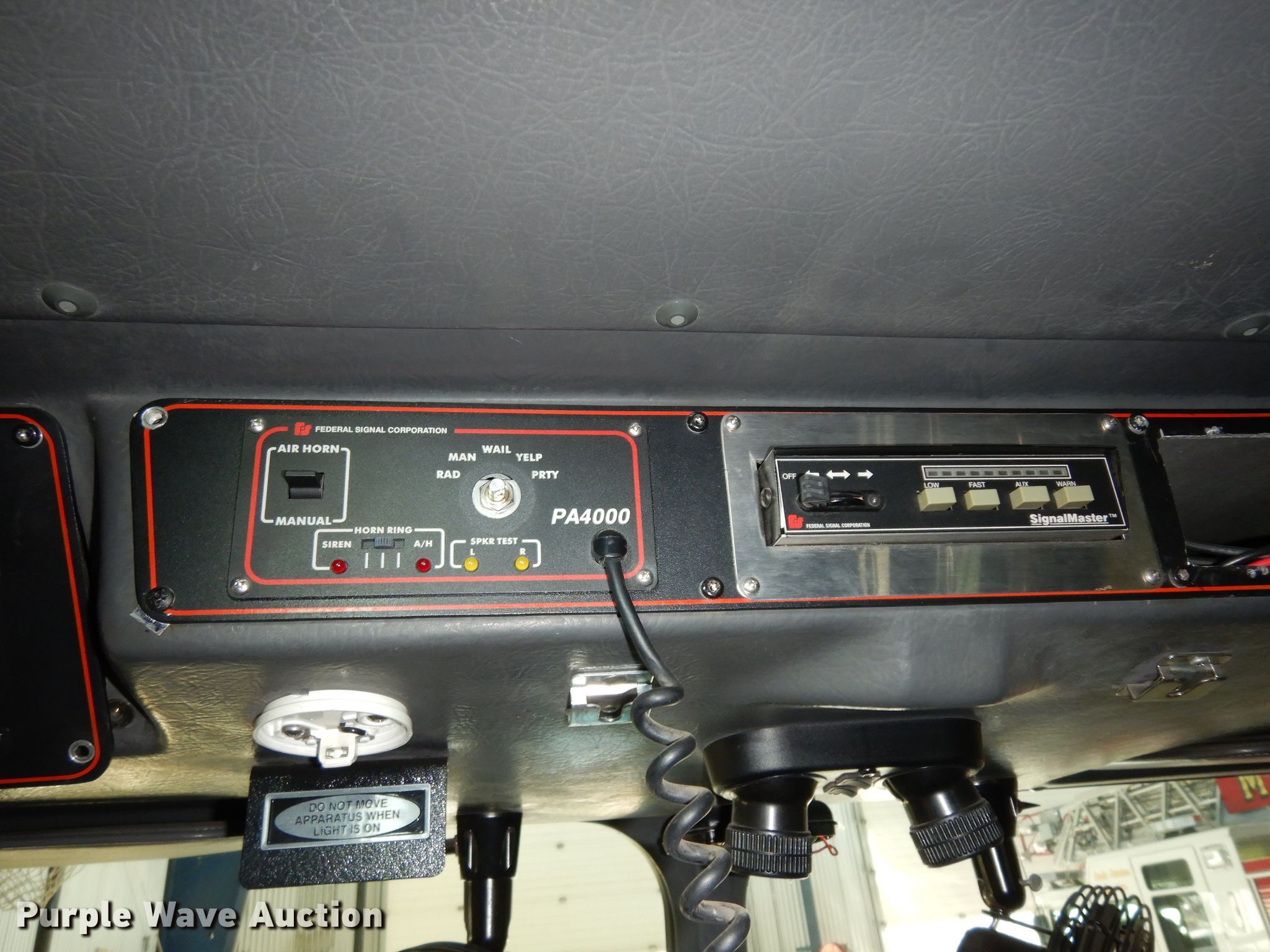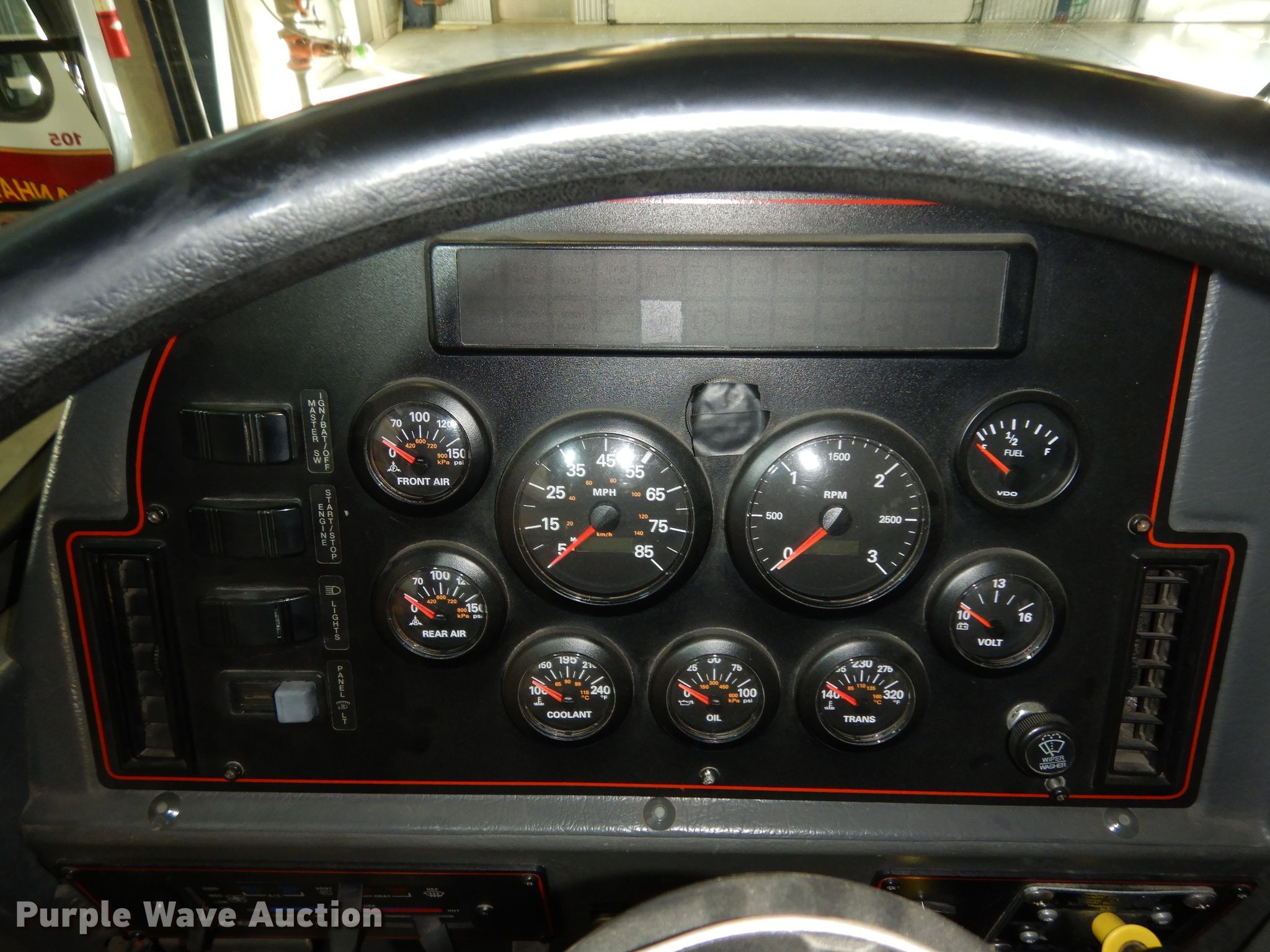 Purple Wave is selling a used Fire Truck or Emergency Vehicle in Kansas. This item is a 2001 E-one quint ladder fire truck with the following: 103,534 miles on odometer, 10,349 hours on meter, Cummins ISMC 10.8L L6 diesel engine, 450 HP, Allison automatic transmission, Single axle, AC and heat, E-One HP75 Cyclone II Sidestacker 75 aerial platform, 75' max lift height, Akromatic ladder gun, 1,000 gpm, Hale 1,500 gpm pump, 500 gallon water tank, (4) ladders, 10' attic ladder, 24' extension ladder, 35' extension ladder, 20' roof ladder, Rear stabilizers, Double frame, Spring suspension, Air brakes, 210" wheelbase, Goodyear 385/65R22.5 front tires, Goodyear 315/80R22.5 rear tires, GVWR 49,700 lbs, Owner/operator manual and CD, Dead battery, Passenger seat missing, Non-operational ladder, Swivel assembly removed, One frame cracked at driver side rear axle, Decals will be removed prior to auction