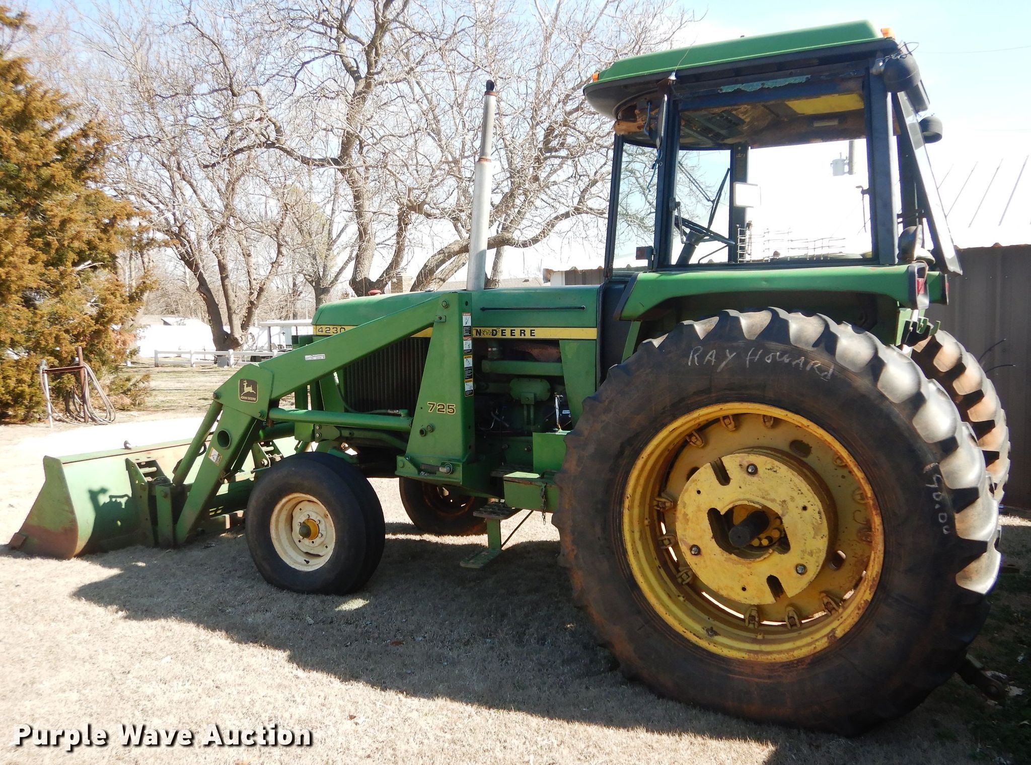 John Deere 4230 tractor. 2,991 hours on meter, John Deere six cylinder diesel engine, Quad-Range transmission 16F-4R gears, John Deere 725 loader 80"W bucket, Bale spear, Joystick controls, Three point, 540 PTO, (2) rear hydraulic remote sets, (6) wheel weights, 10.00-16 front tires, 18.4R38 rear tires, Transmission issues Some high gears inoperable, Cab and door glass broken out, Serial 039062R. 5002 OK-37. Tuttle, OK 73089