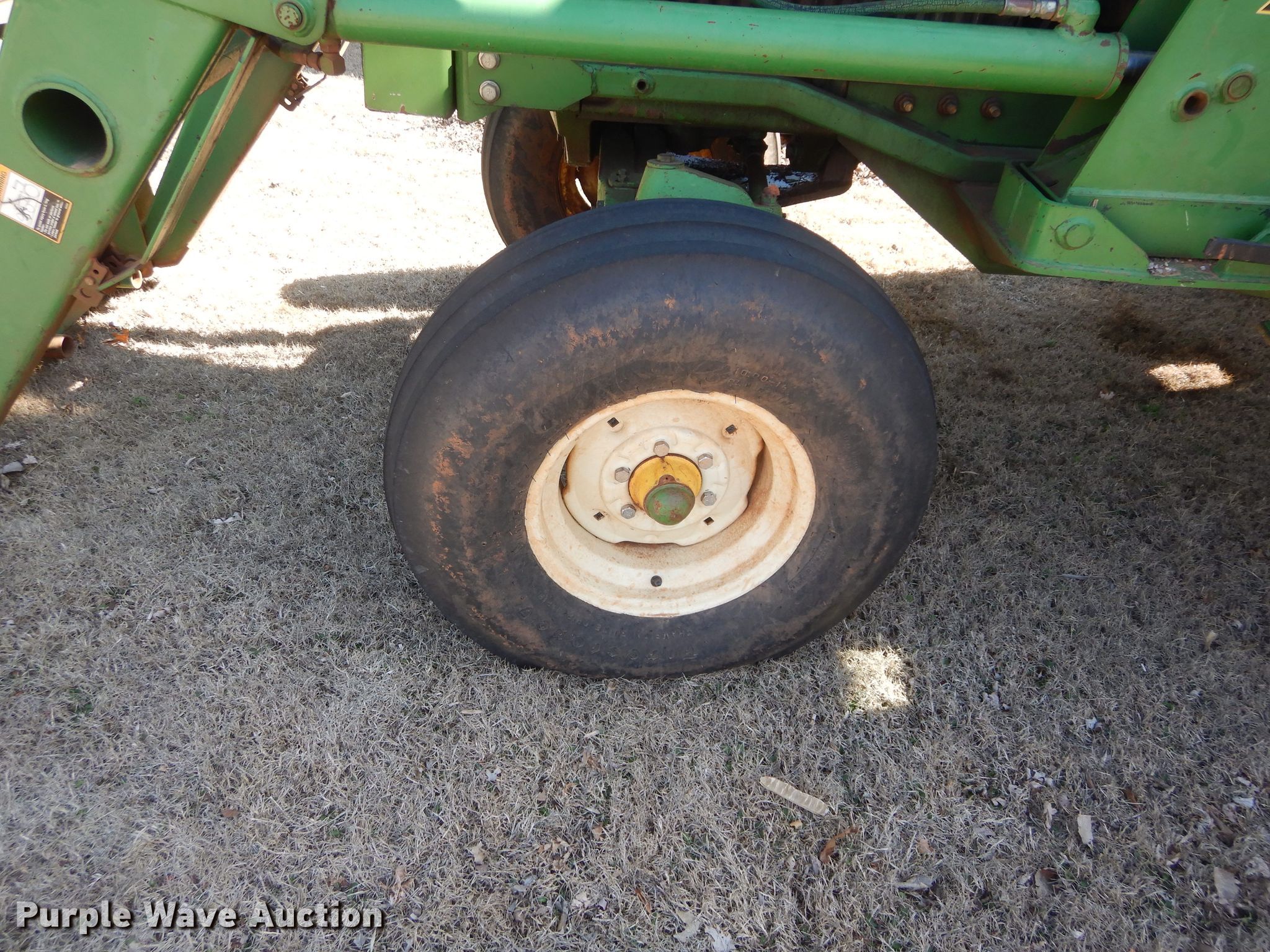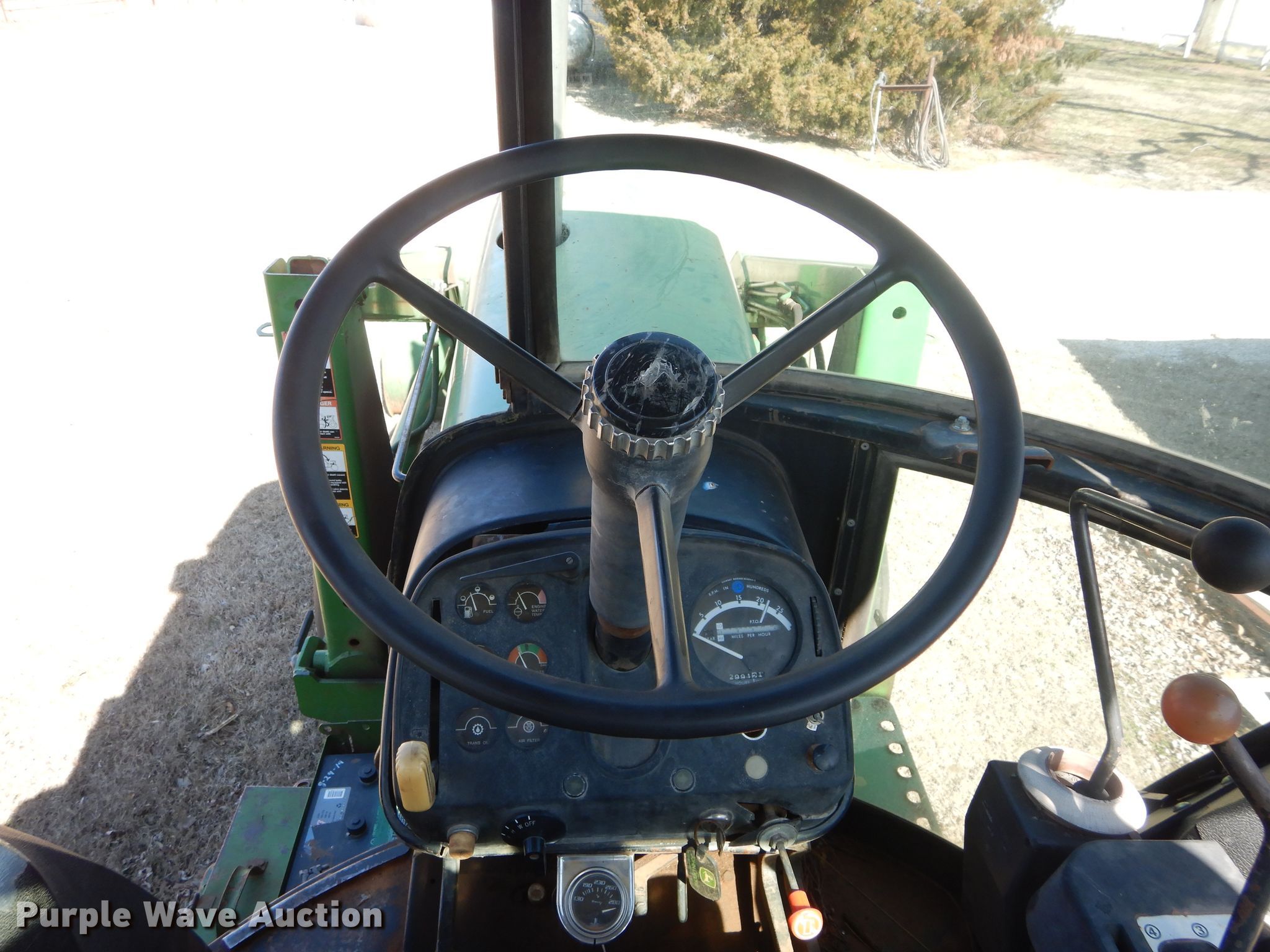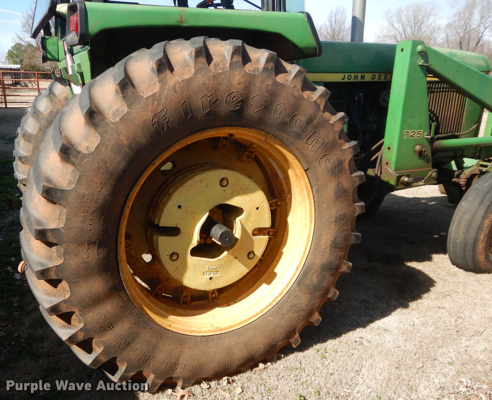 Purple Wave is selling a used Tractor in Oklahoma. This item is a John Deere 4230 tractor with the following: 2,991 hours on meter, John Deere six cylinder diesel engine, Quad-Range transmission, 16F-4R gears, John Deere 725 loader, 80"W bucket, Bale spear, Joystick controls, Three point, 540 PTO, (2) rear hydraulic remote sets, (6) wheel weights, 10.00-16 front tires, 18.4R38 rear tires, Transmission issues, Some high gears inoperable, Cab and door glass broken out, Serial 039062R
