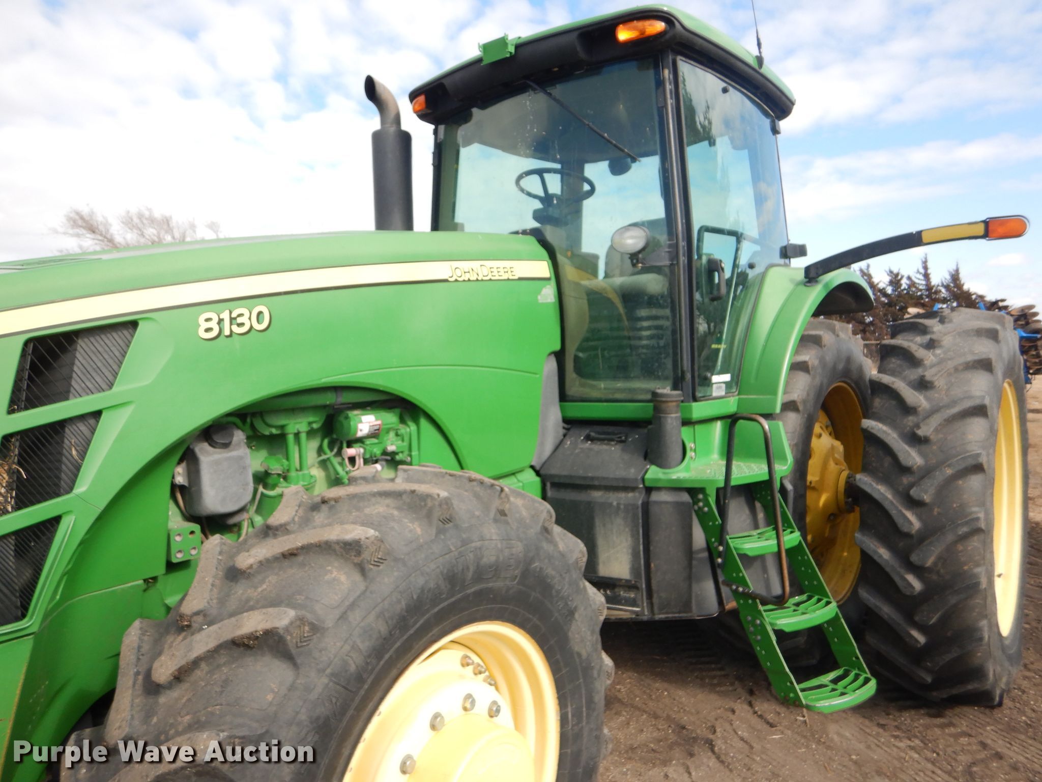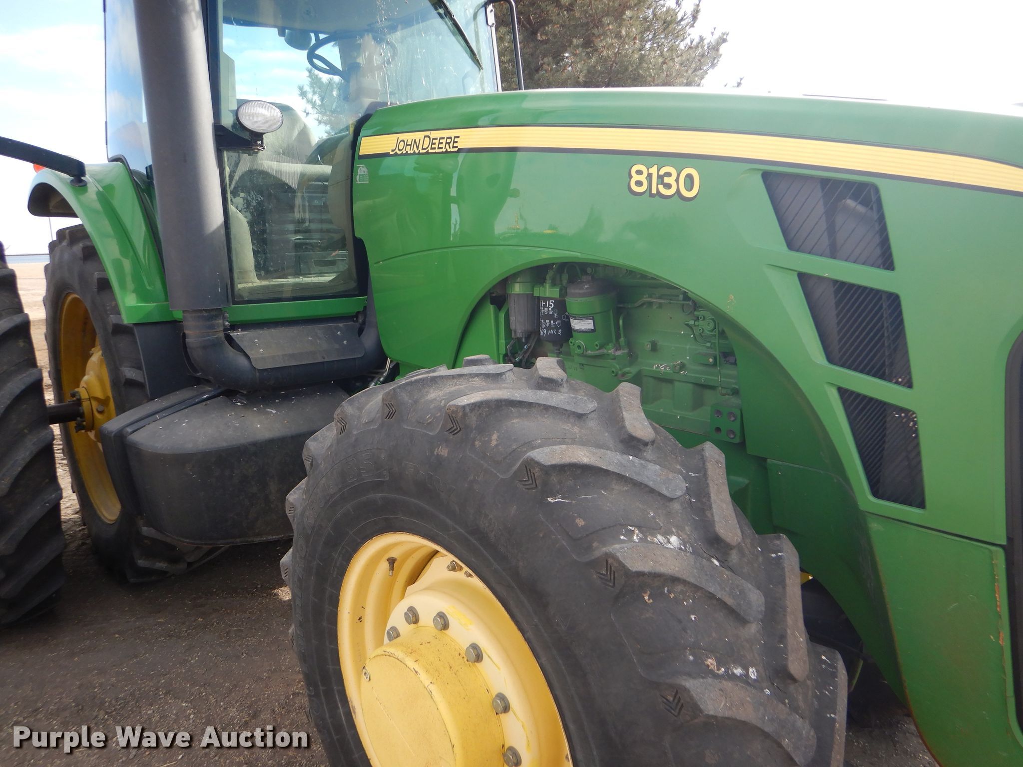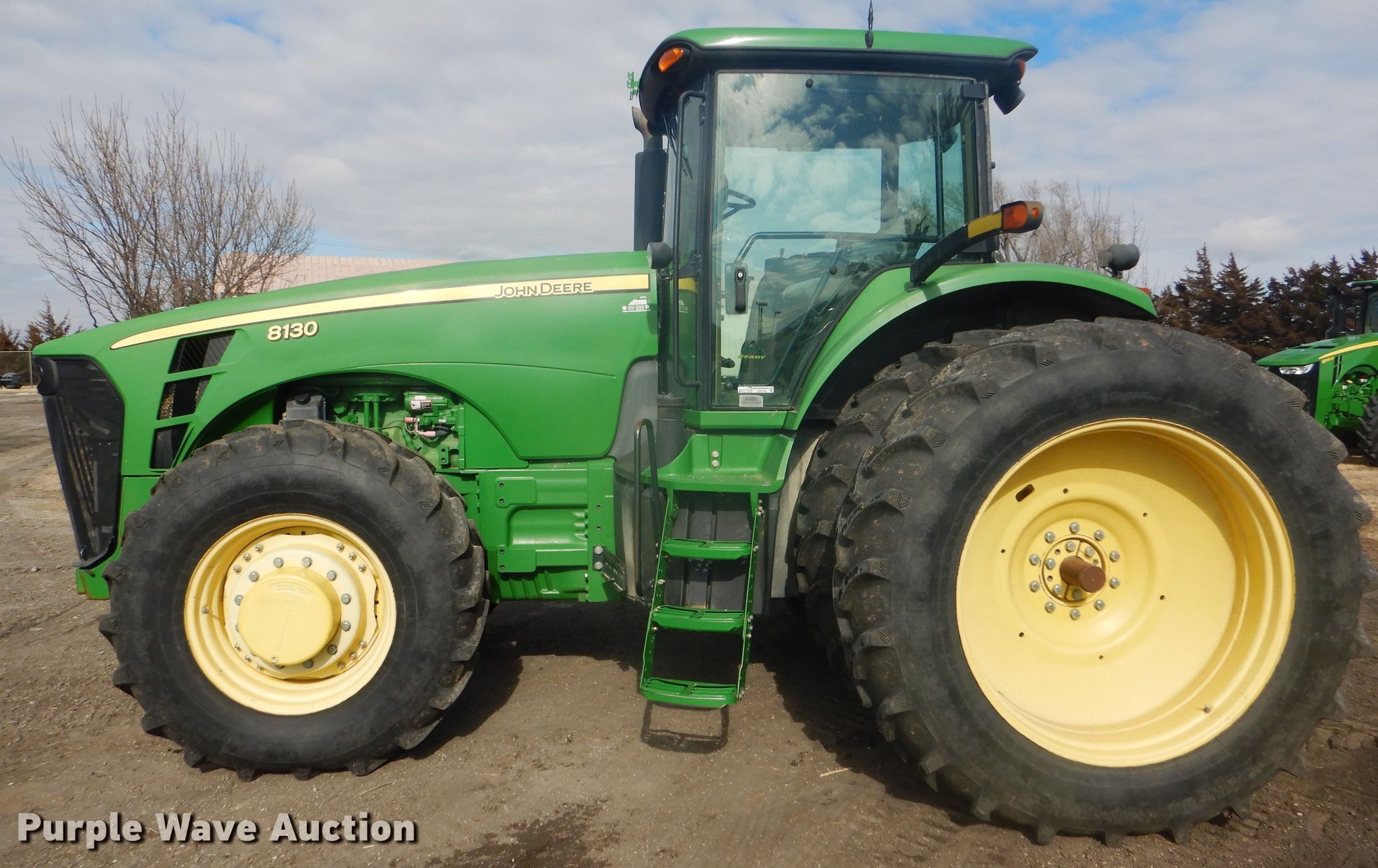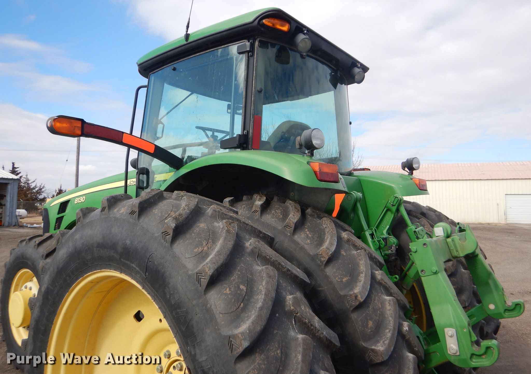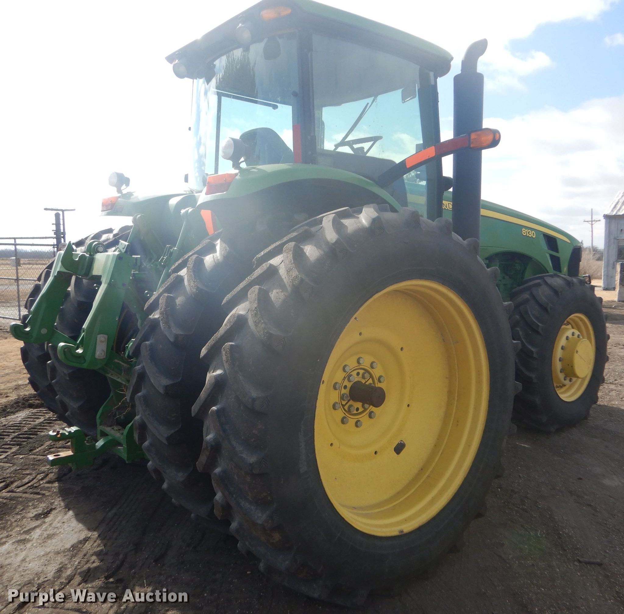 Purple Wave is selling a used Tractor in Kansas. This item is a 2008 John Deere 8130 MFWD tractor with the following: 1,552 hours on meter, John Deere 9.0L six cylinder diesel engine, Powershift transmission, 16F-4R gears, Differential lock, AC and heat, Three point, Top link, Quick attach, Seven pin outlet, Isobus outlet, Large 1000 PTO, (4) rear hydraulic remotes, 460/85R30 front tires, 480/80R46 dual rear tires, Serial RW8130P027038