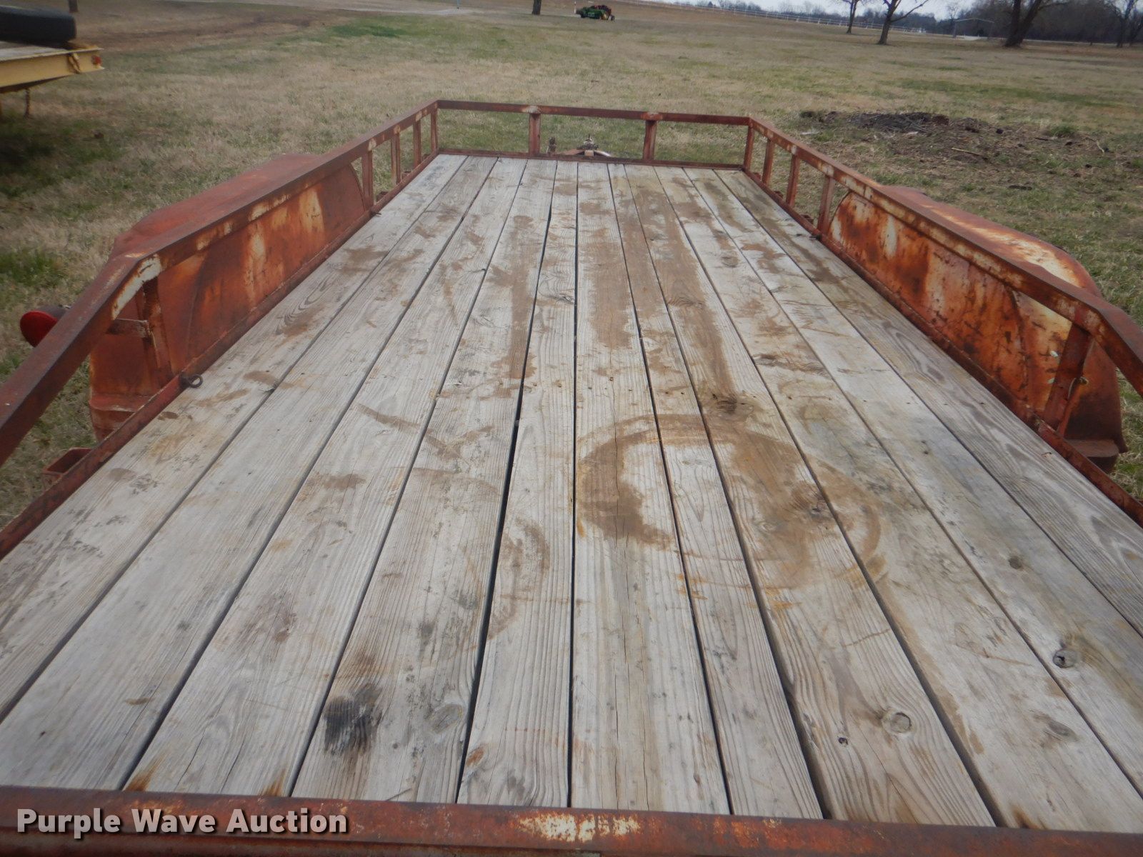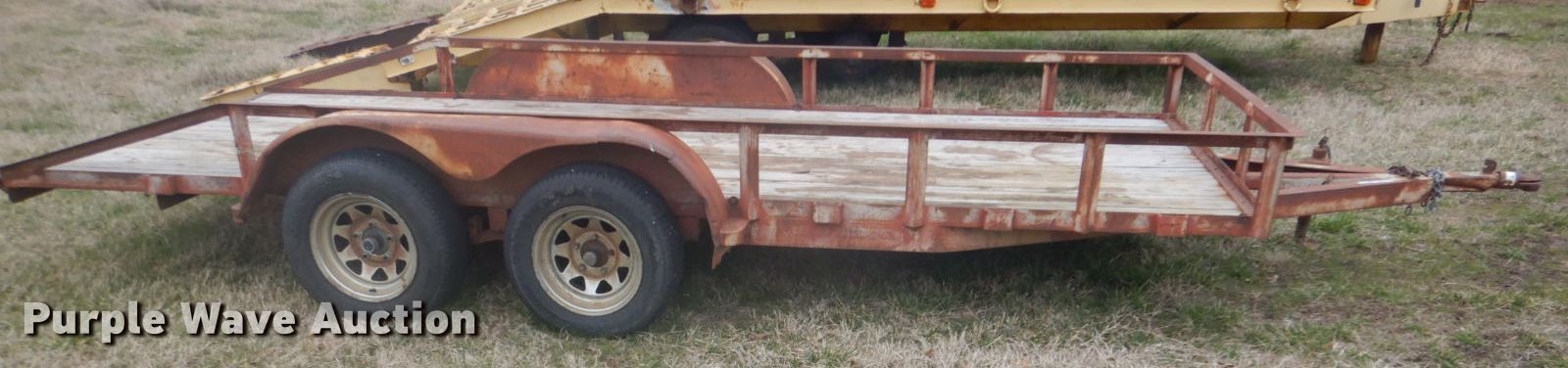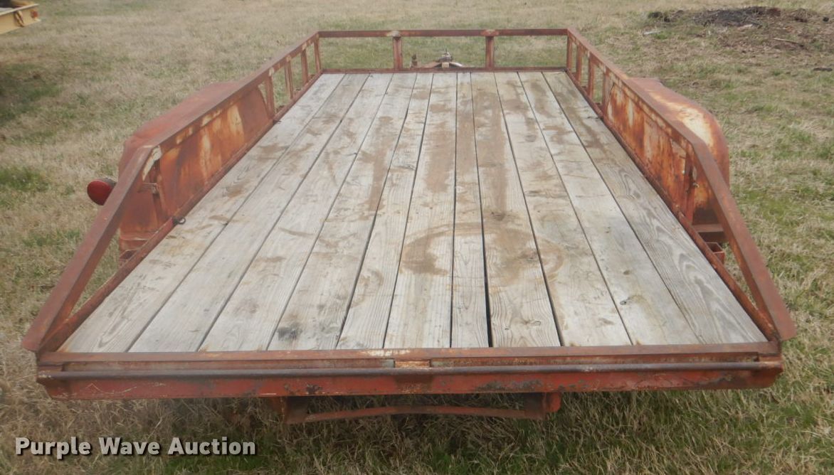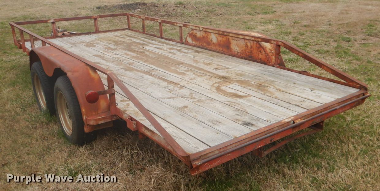 Purple Wave is selling a used Car or Utility Trailer in Oklahoma. This item is a Shop built utility trailer with the following: 18'L x 8'W overall, 16'L x 6'W deck, 12" side height, Wood deck, 2" ball hitch, Single leg landing gear, Spring suspension, Tandem axle, ST205/75D15 tires