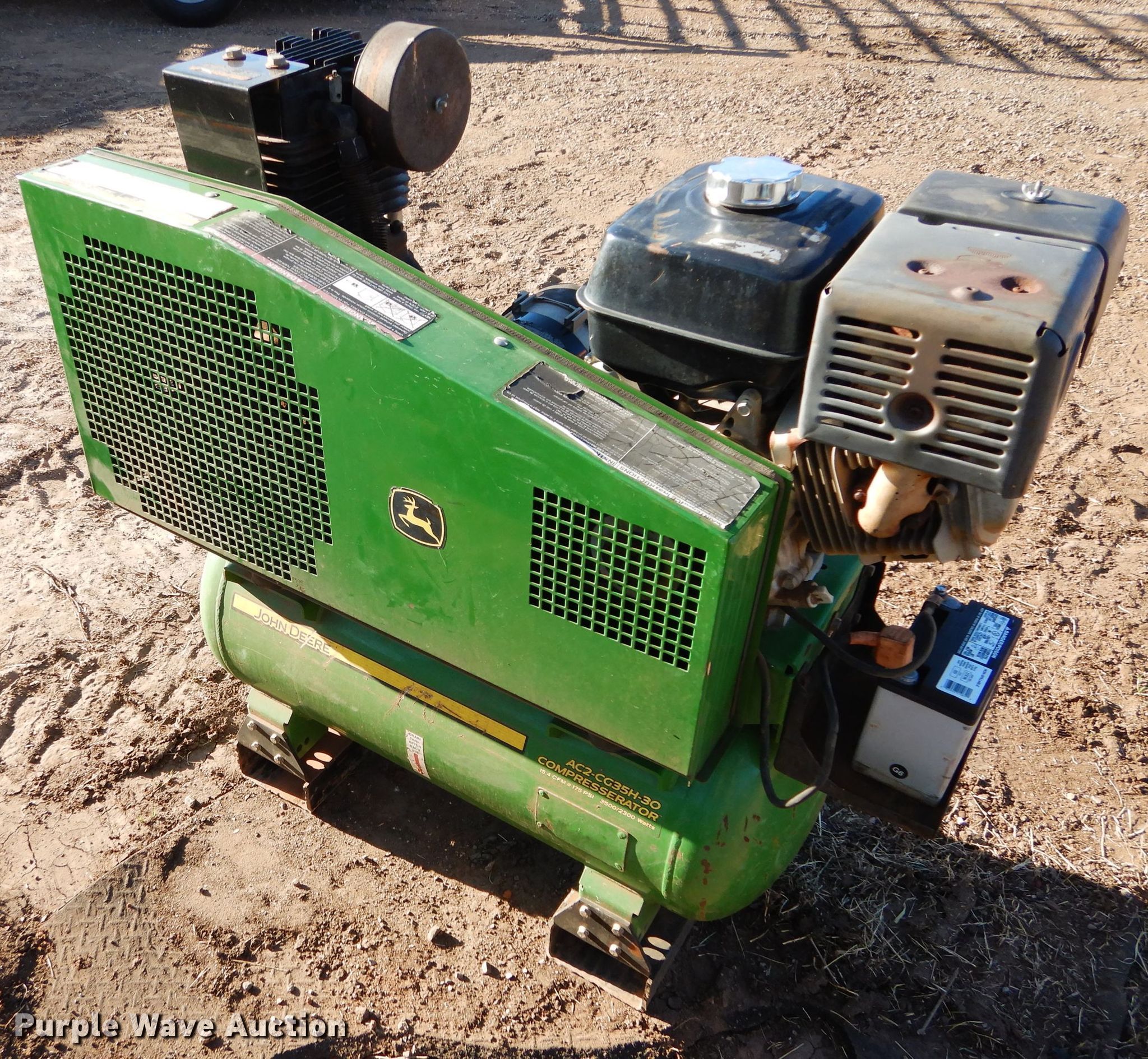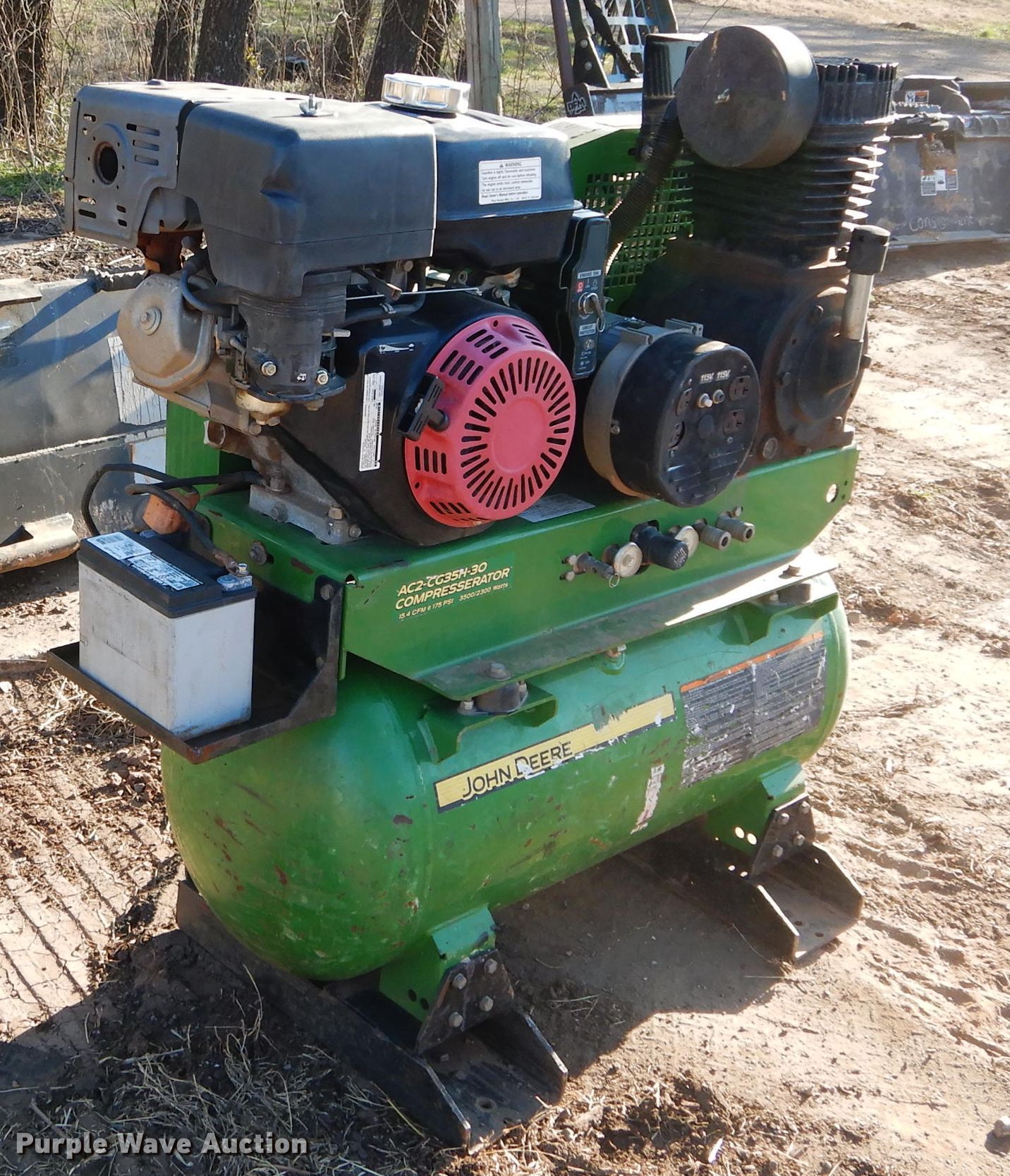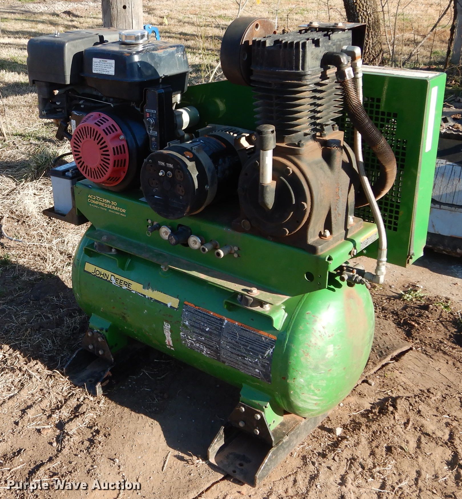 Purple Wave is selling a used Air Compressor in Oklahoma. This item is a John Deere AC2-CH35H-30 air compressor with the following: Gas engine, 15.4 CFM, 175 PSI