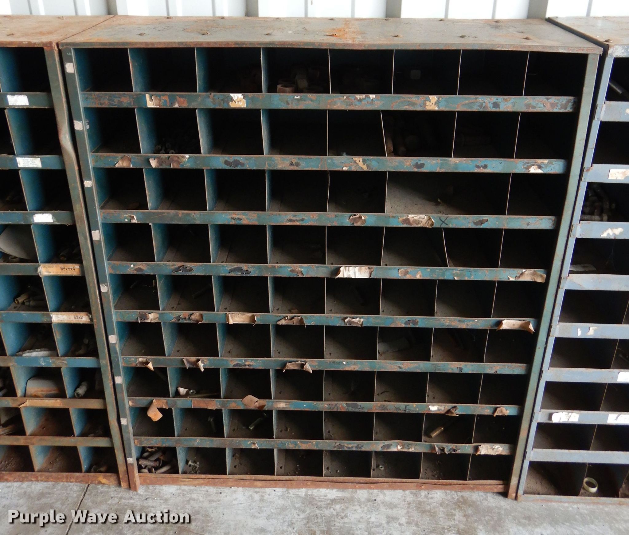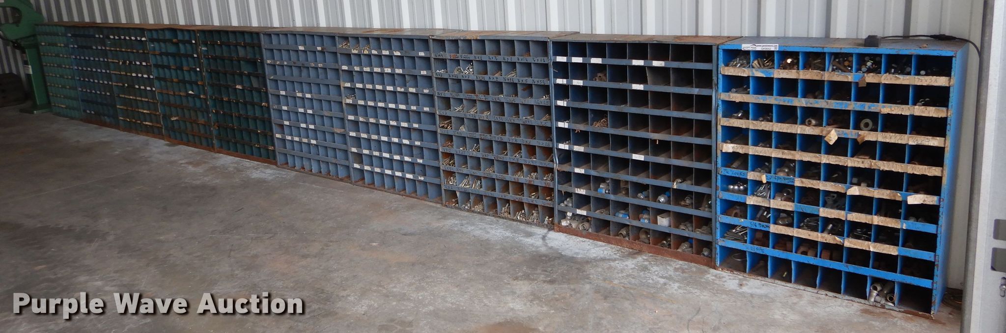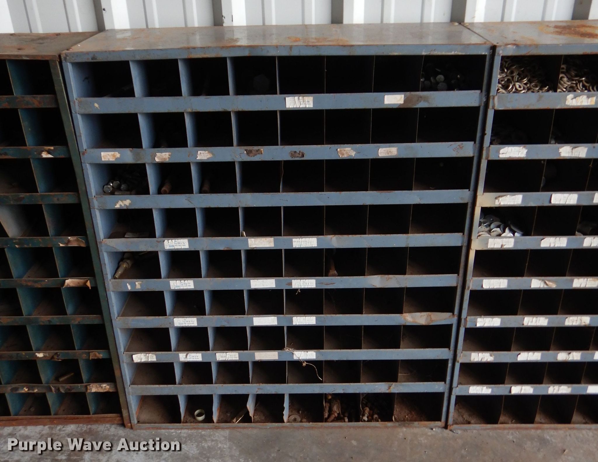 Purple Wave is selling a used Shelving and Storage in Oklahoma. This item is a Approximately 10 bolt bins with the following: 25"W x 12"D x 42"H, Contents included
