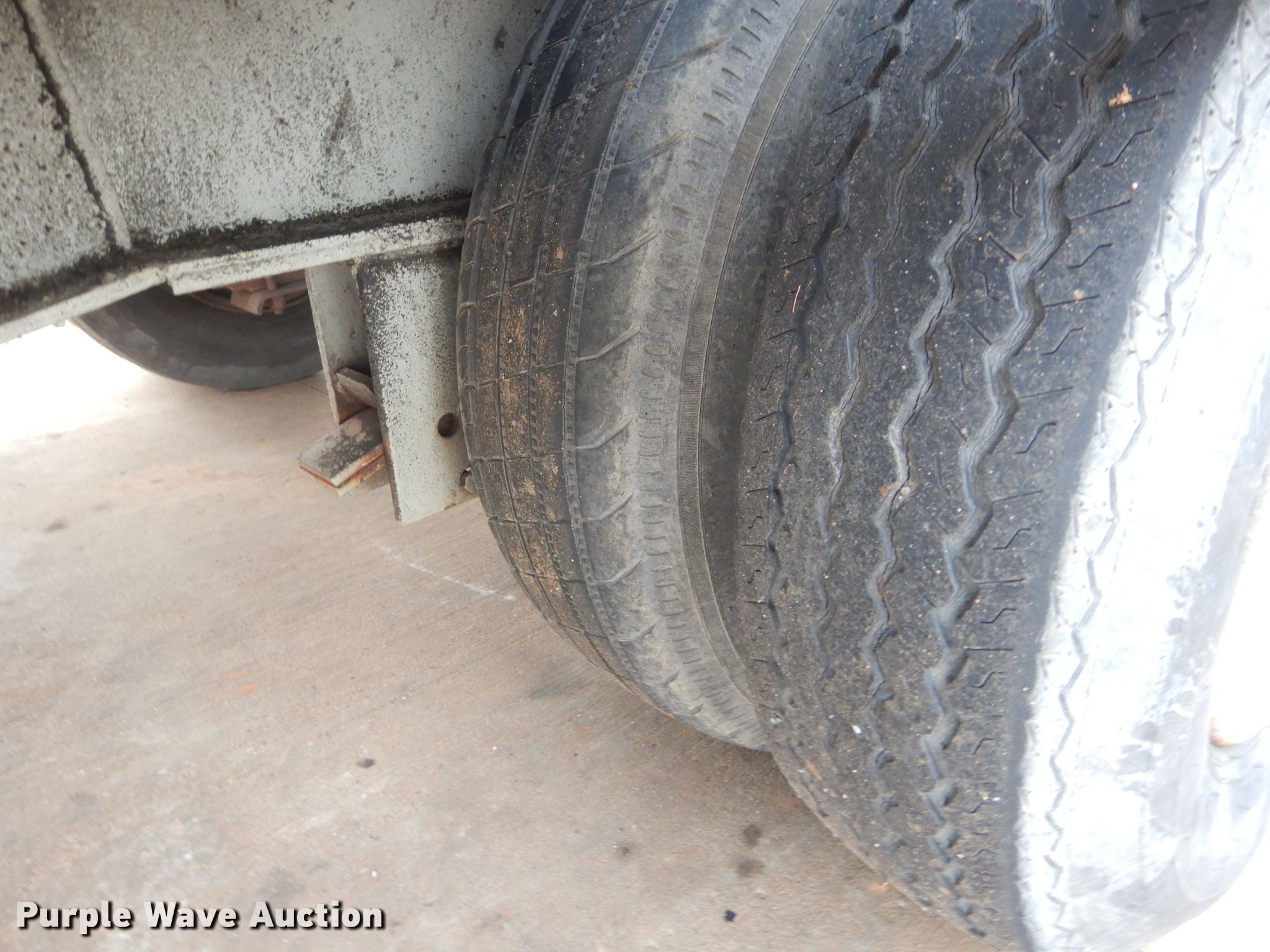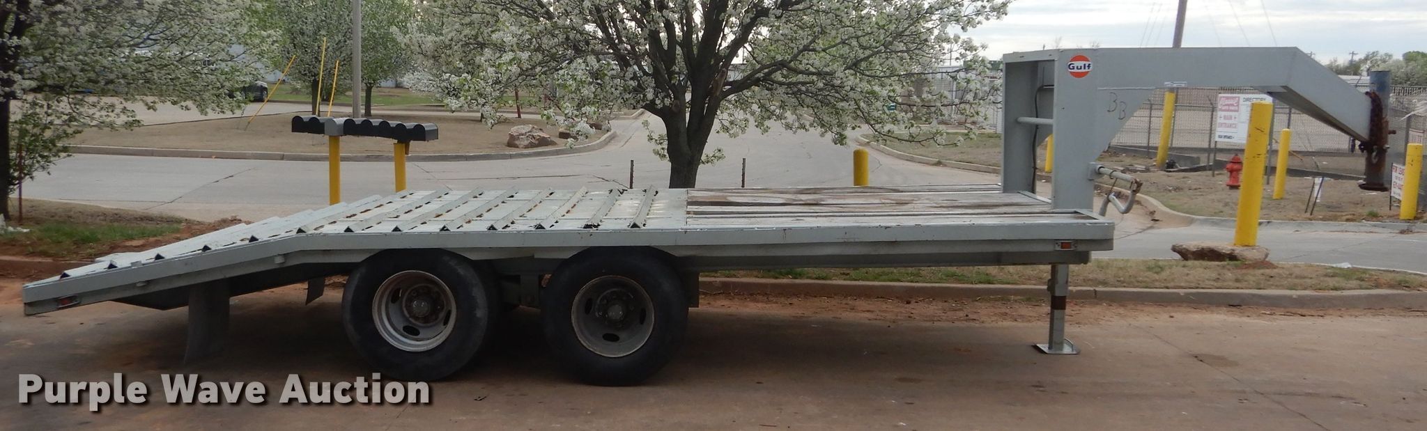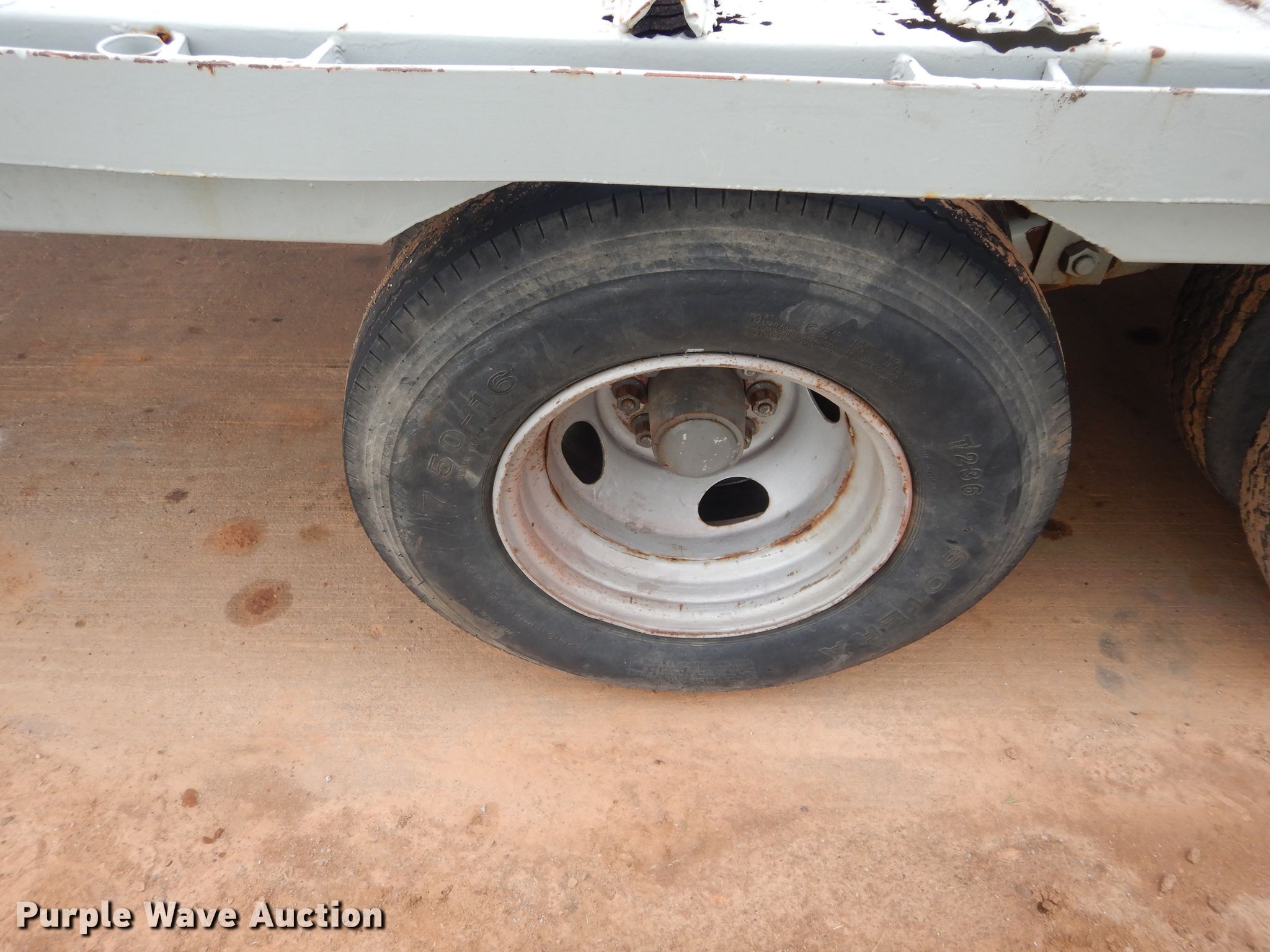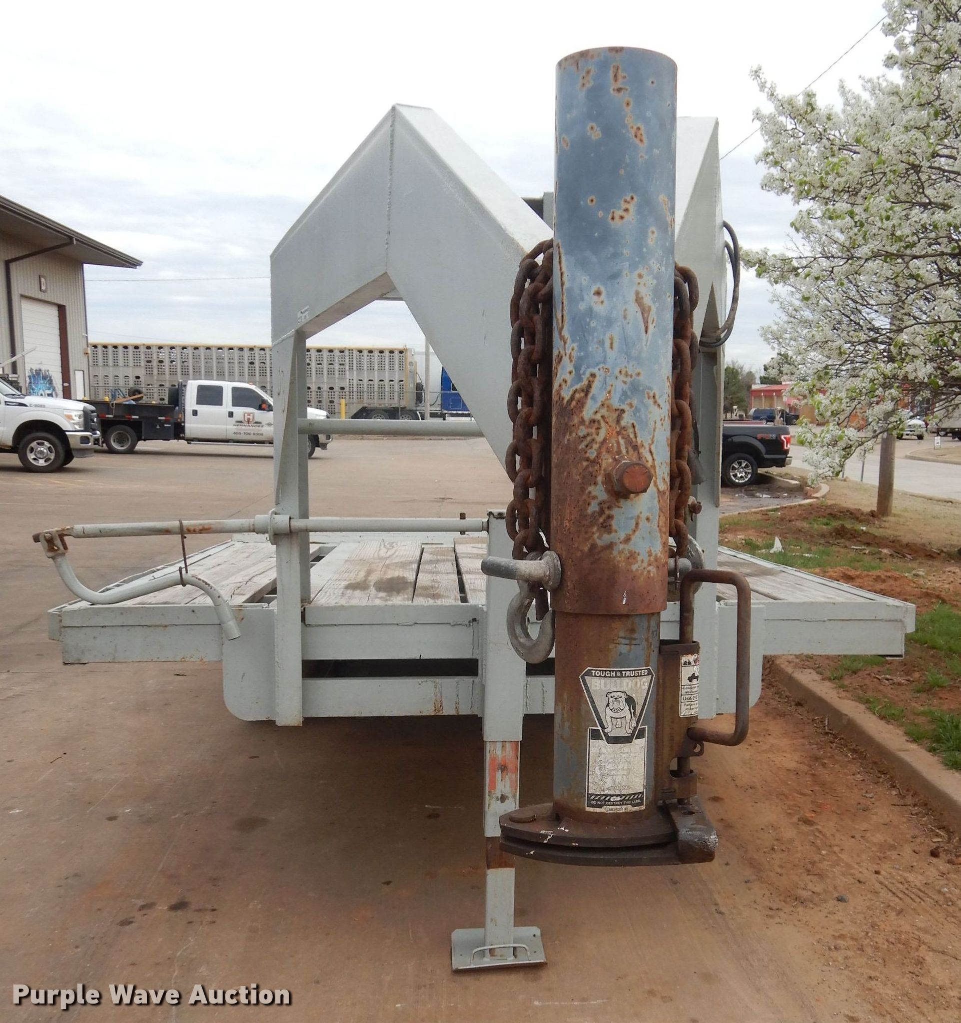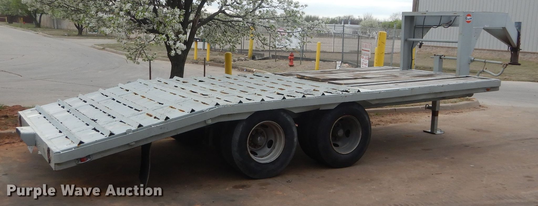 Purple Wave is selling a used Equip. Trailer in Oklahoma. This item is a Ranco equipment trailer with the following: 26'L x 94"W overall, 19'L x 94"W deck, 5' tail length, Steel and wood deck, Single leg landing gear, Spring suspension, Electric brakes, Tandem axle, 7.50-16LT tires