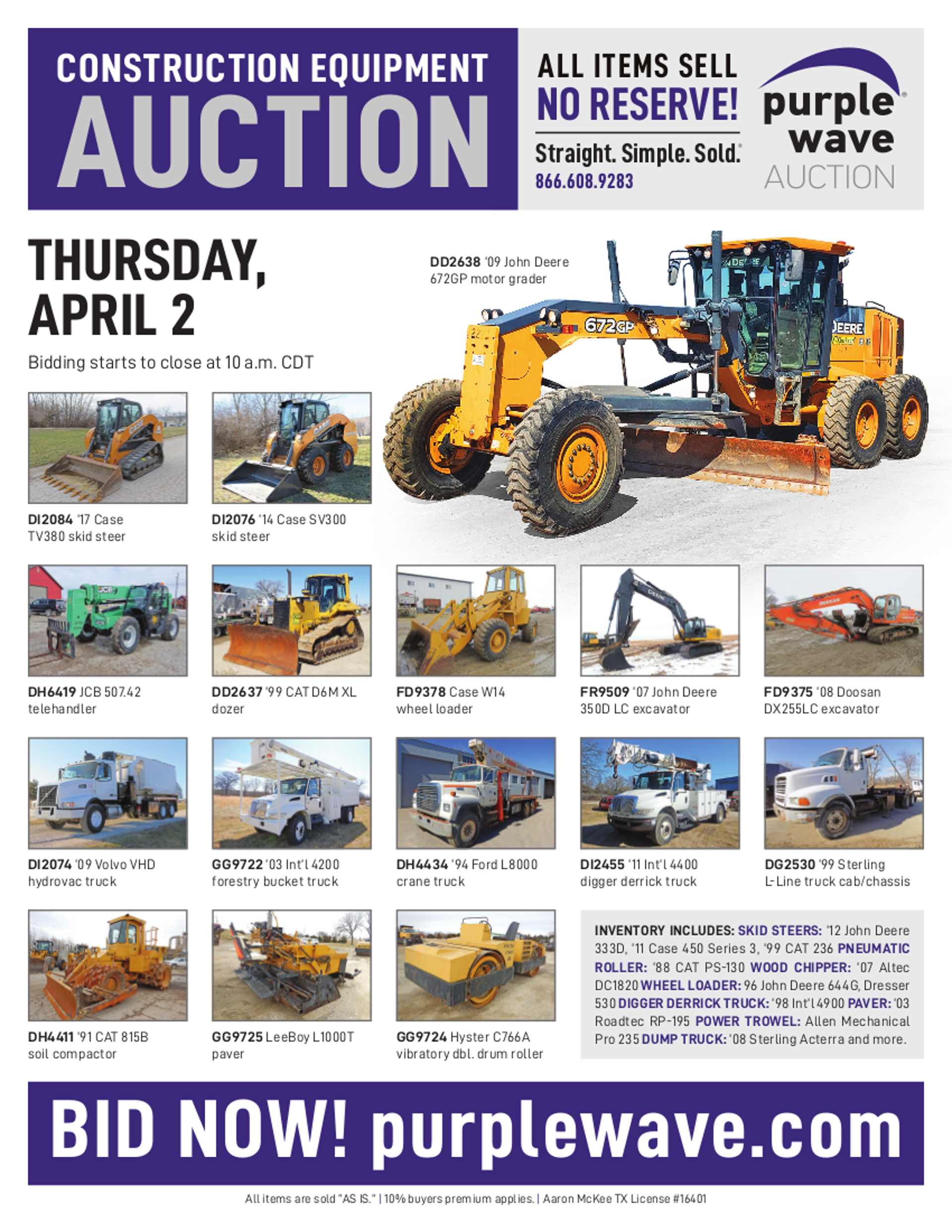 This auction is conducted by Purple Wave, Inc., whose home office is 825 Levee Drive, Manhattan, Kansas. Aaron McKee, Texas auctioneer license # 16401, operates Purple Wave, Inc. Complaints against us may be directed to the Texas Department of Licensing and Regulation, P.O. Box 12157, Austin, Texas 78711, (512) 463-6599. For additional required information, see the attached document.