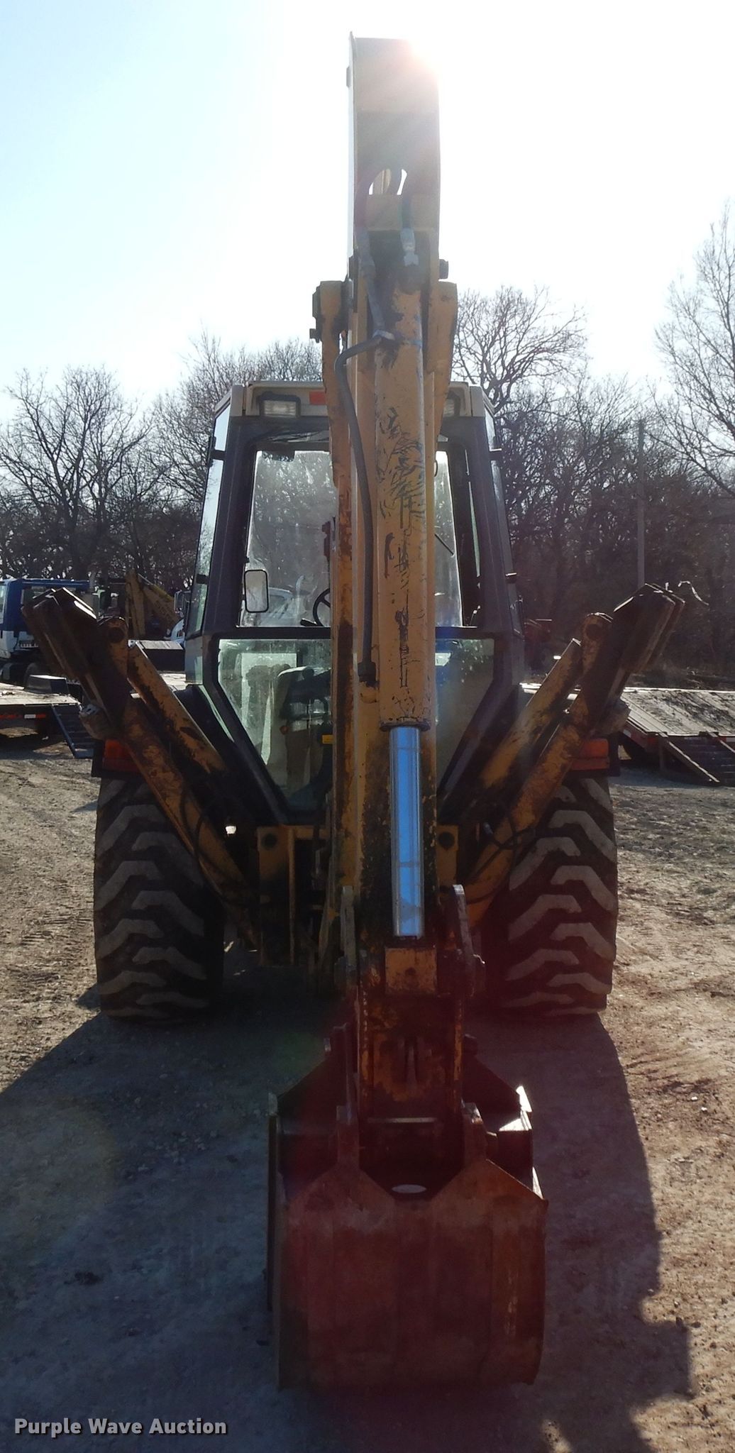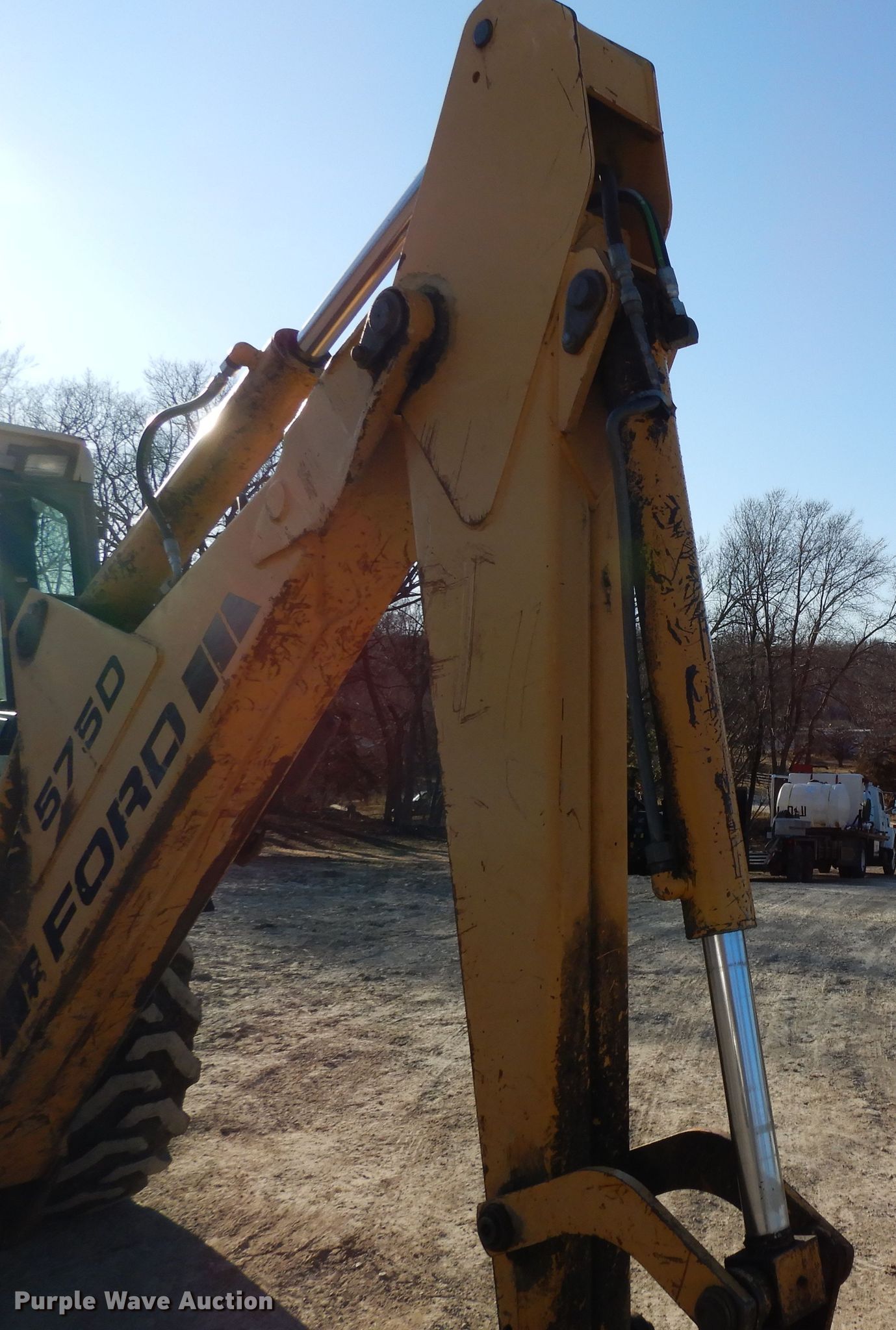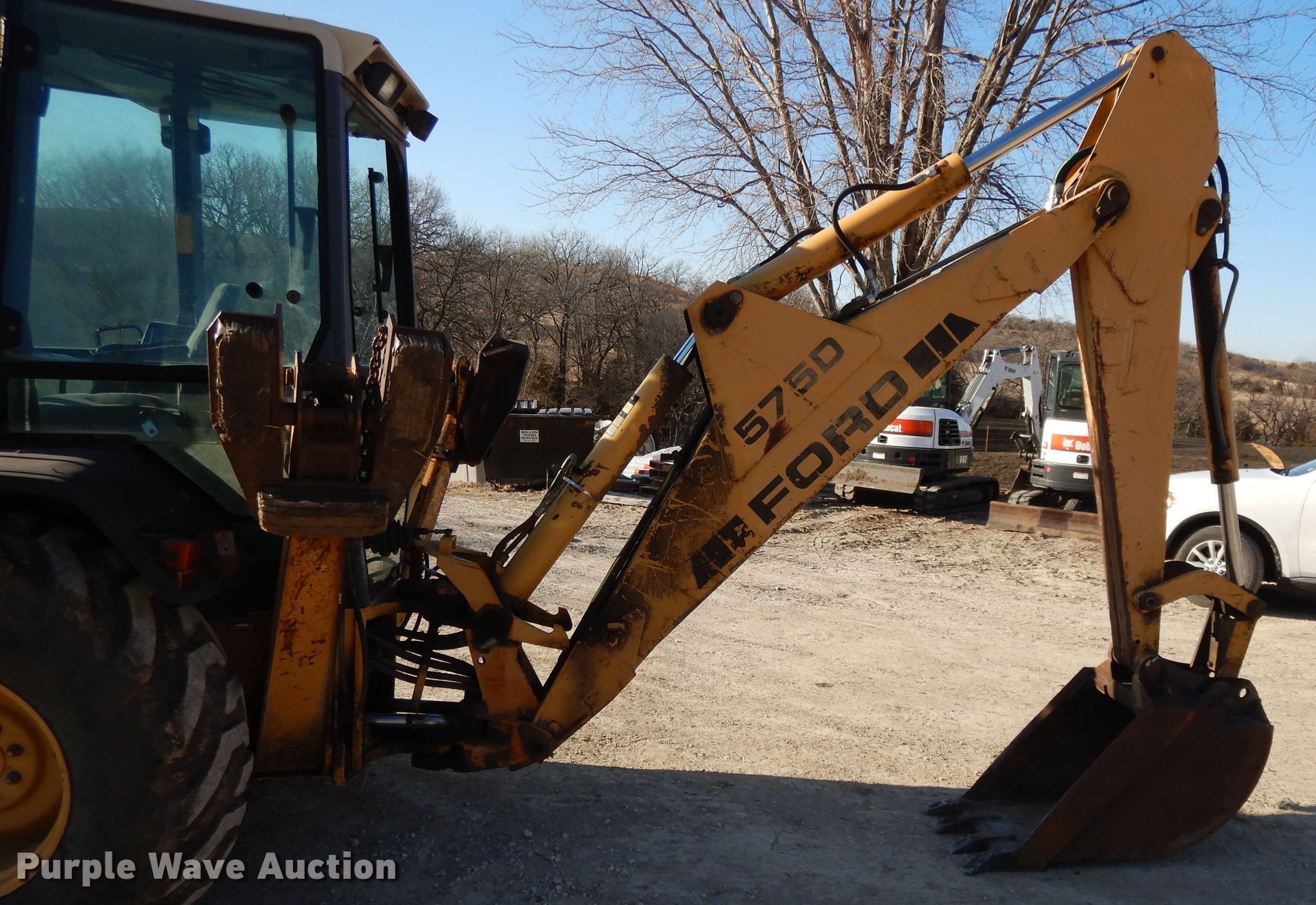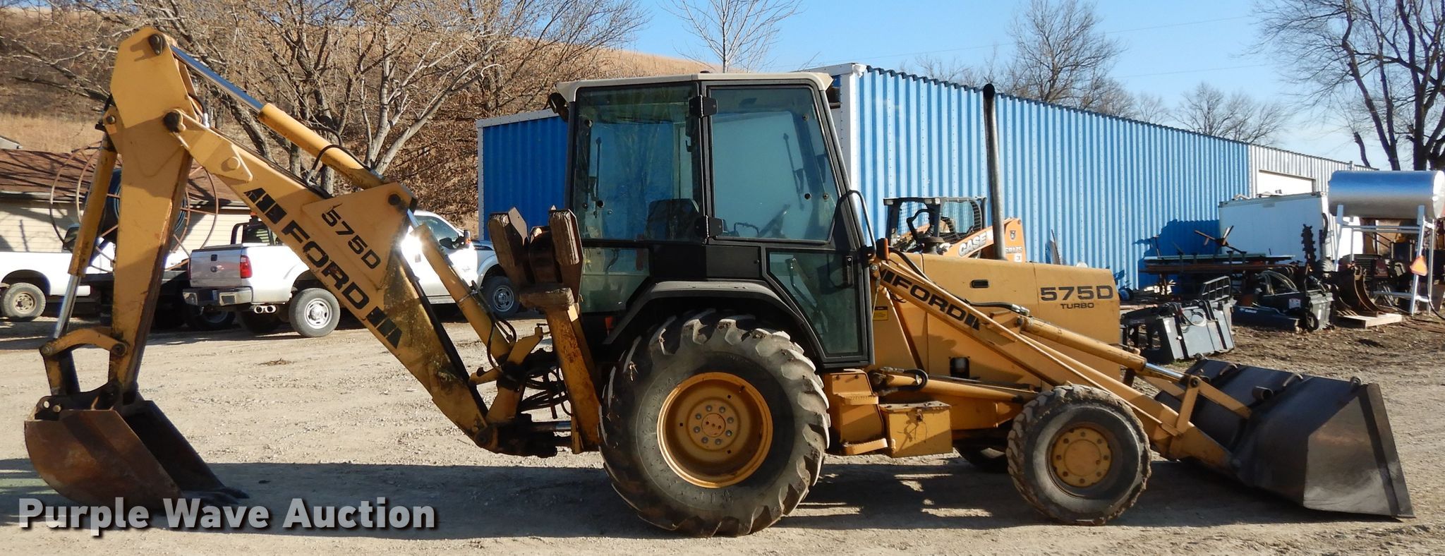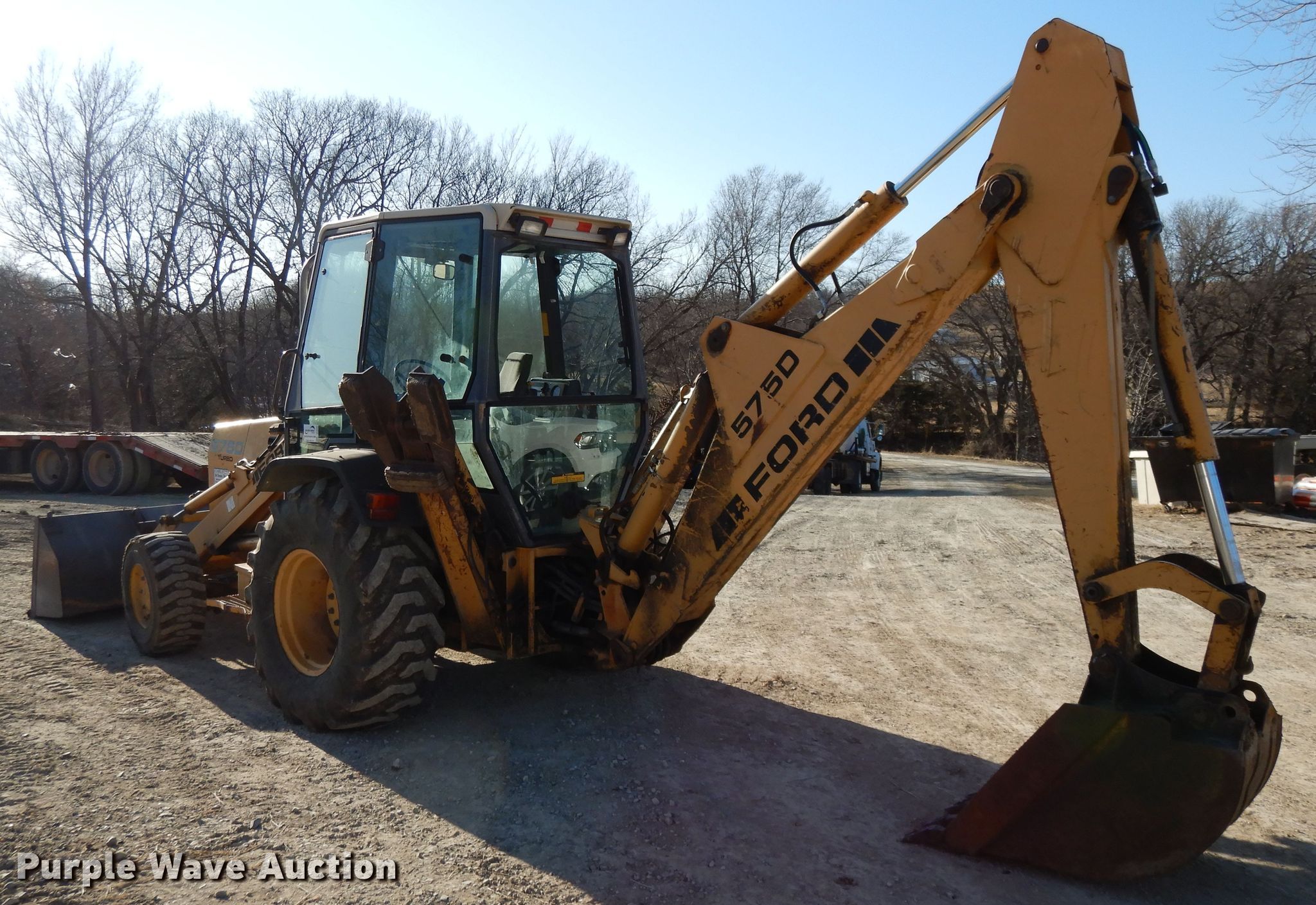 Purple Wave is selling a used Tractor Loader Backhoe in Kansas. This item is a Ford 575D backhoe with the following: 6,687 hours on meter, Four cylinder diesel engine, Shuttle shift transmission, 4F-4R gears, Four wheel drive, Differential lock, EROPS, Heat, Wobble stick backhoe control, 88"W loader bucket, Weld-on cutting edge, 24"W backhoe bucket, (4) teeth, 12-16.5 front tires, 18.4-24 rear tires, Serial AB24827