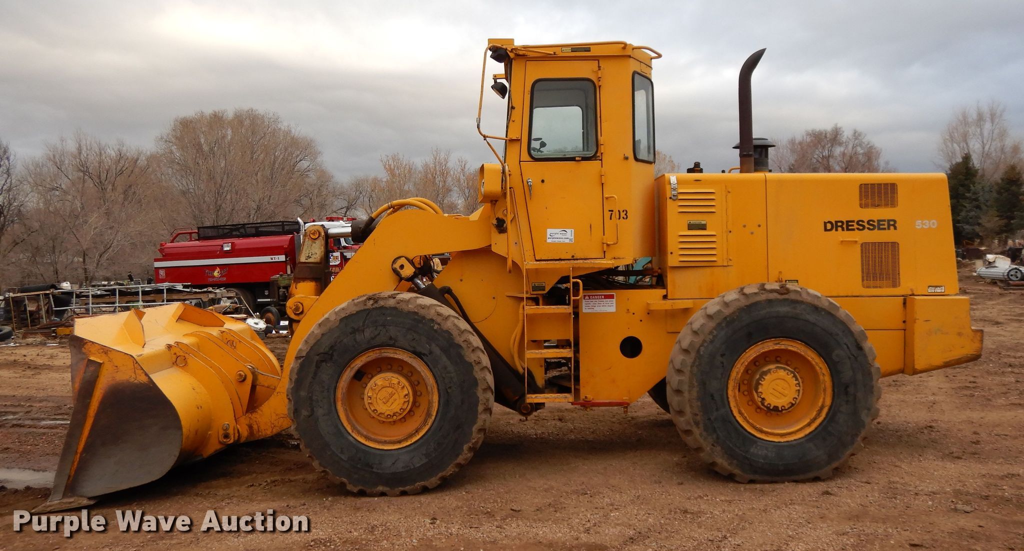 Purple Wave is selling a used Wheel Loader in Colorado. This item is a Dresser 530 wheel loader with the following: 5,955 hours on meter, Six cylinder diesel engine, Powershift transmission, 3F-3R gears, EROPS, Two-lever bucket controls, 102"W bucket, Bolt-on cutting edge, 20.5R25 tires, Serial 3470530U002038