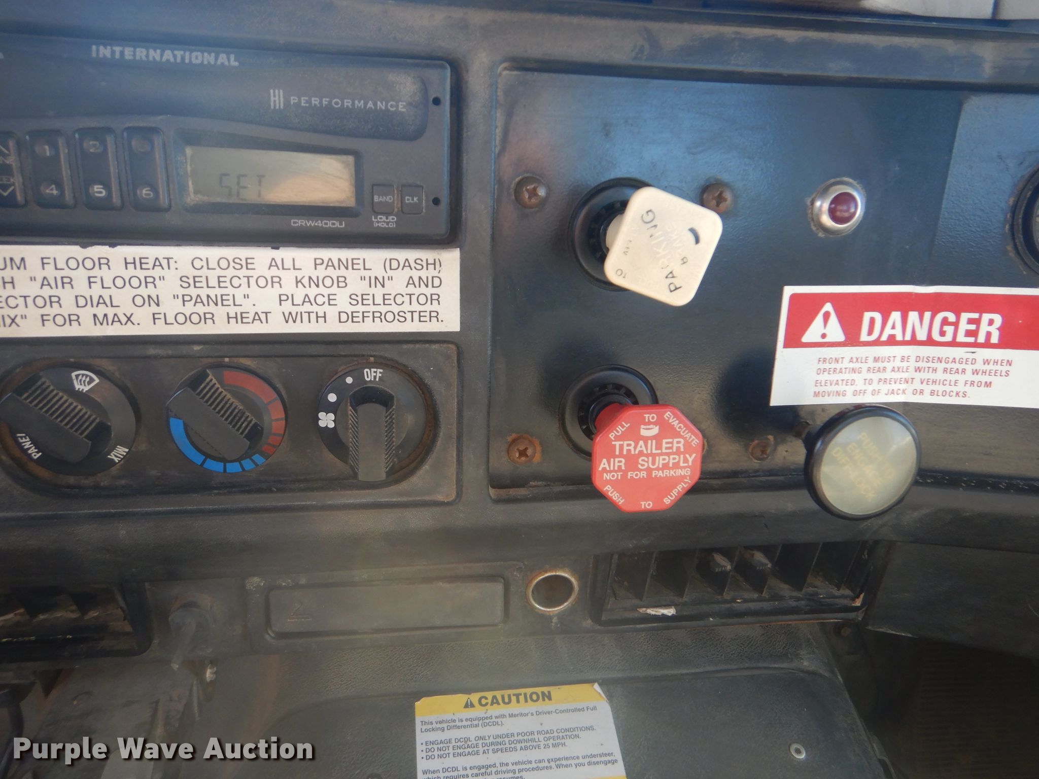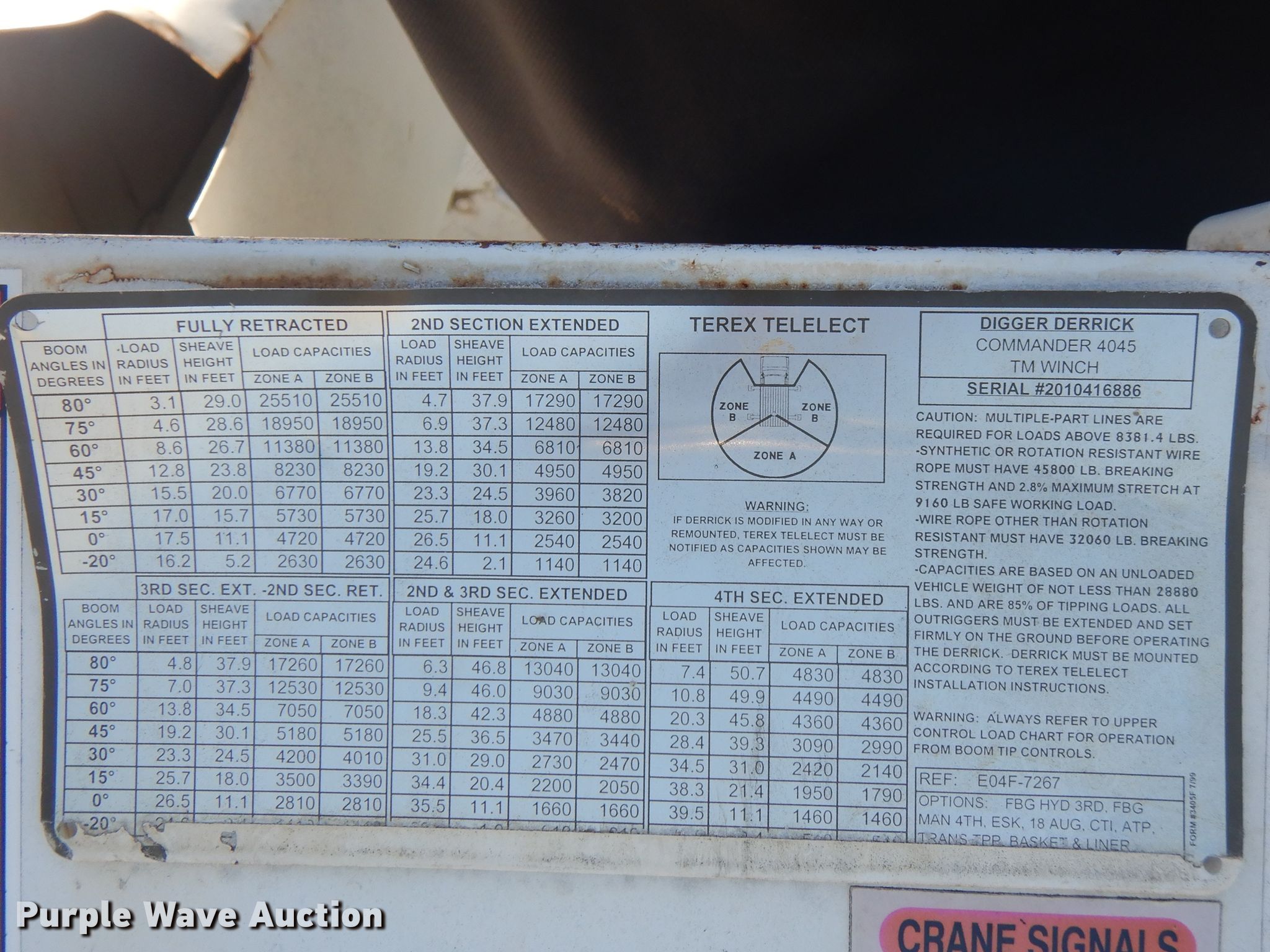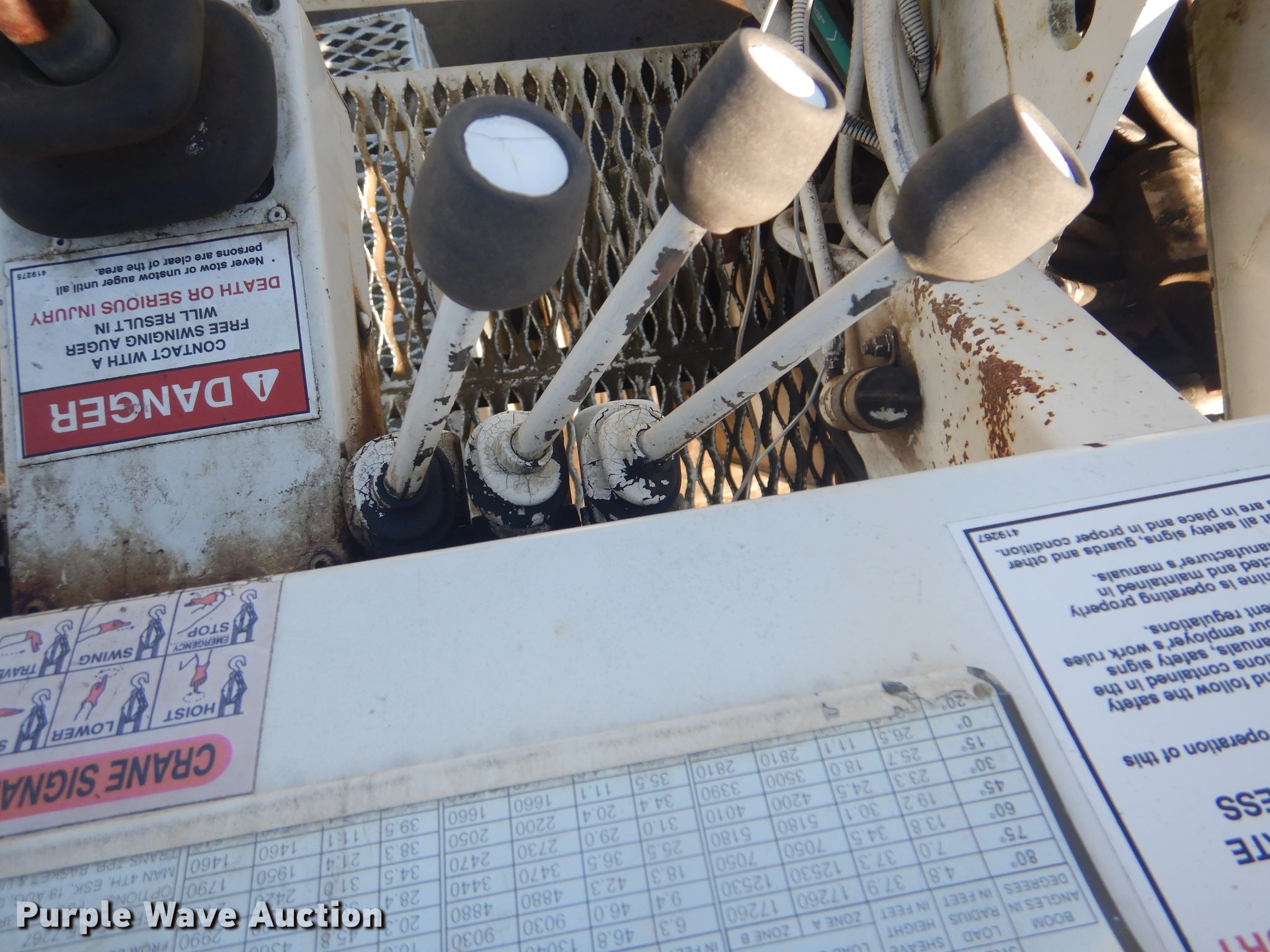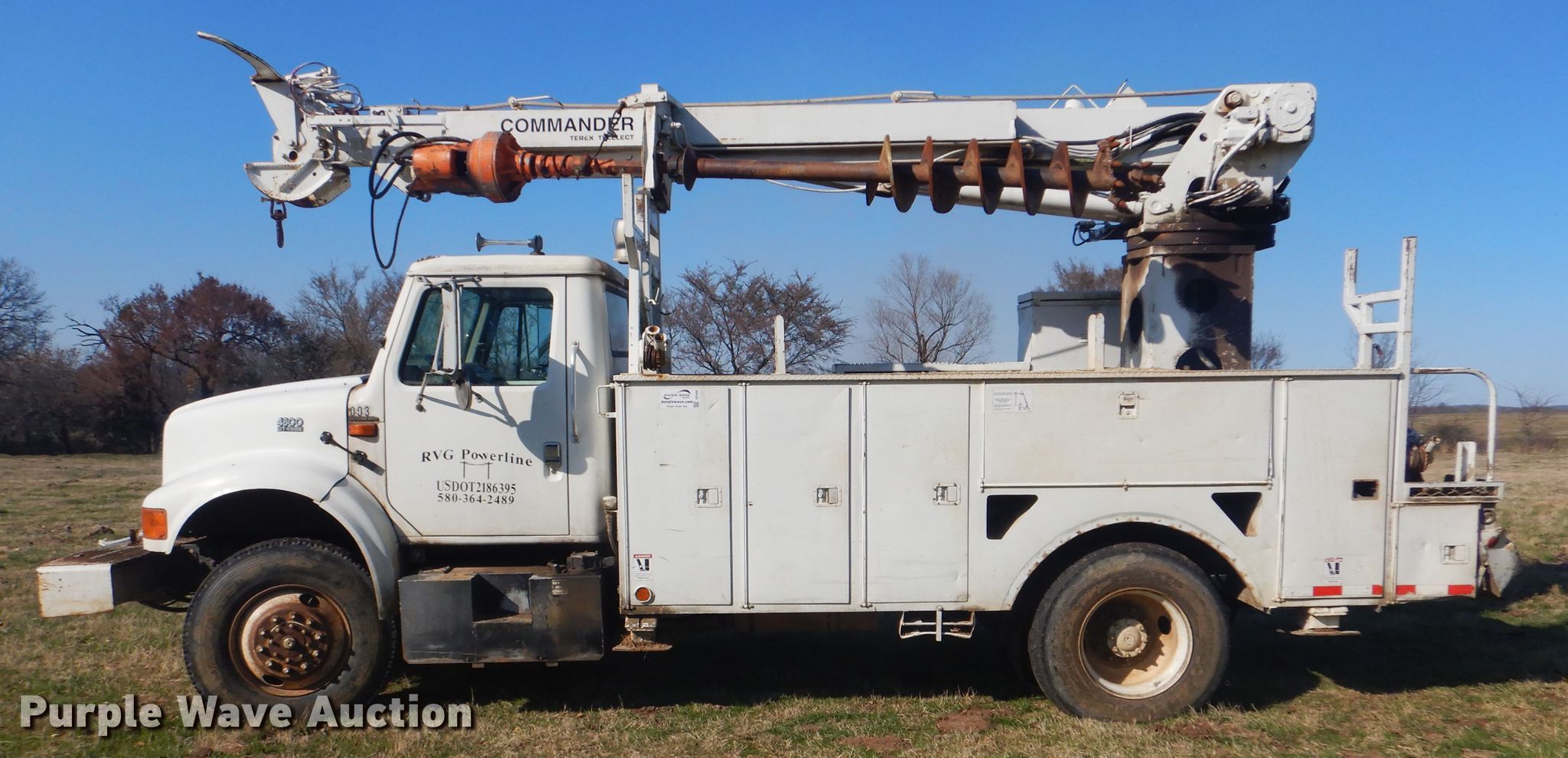 Purple Wave is selling a used Digger Derrick Truck in Oklahoma. This item is a 2002 International 4800 digger derrick truck with the following: 126,588 miles on odometer, 13,618 hours on meter, International DT466E 7.6L L6 diesel engine, Eaton Fuller nine speed manual transmission, Single axle, AC and heat, PTO, Dakota Bodies 156-LB utility bed, 14.5'L, Serial DB03716, Terex Commander Telelect articulating, insulated, telescopic boom, Platform controls, Pole guide, 16' diameter auger, Spring suspension, Air brakes, 11R22.5 tires