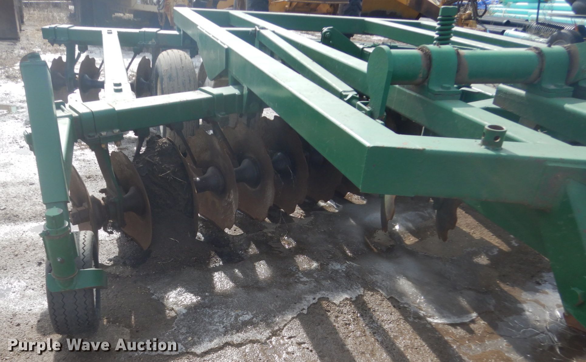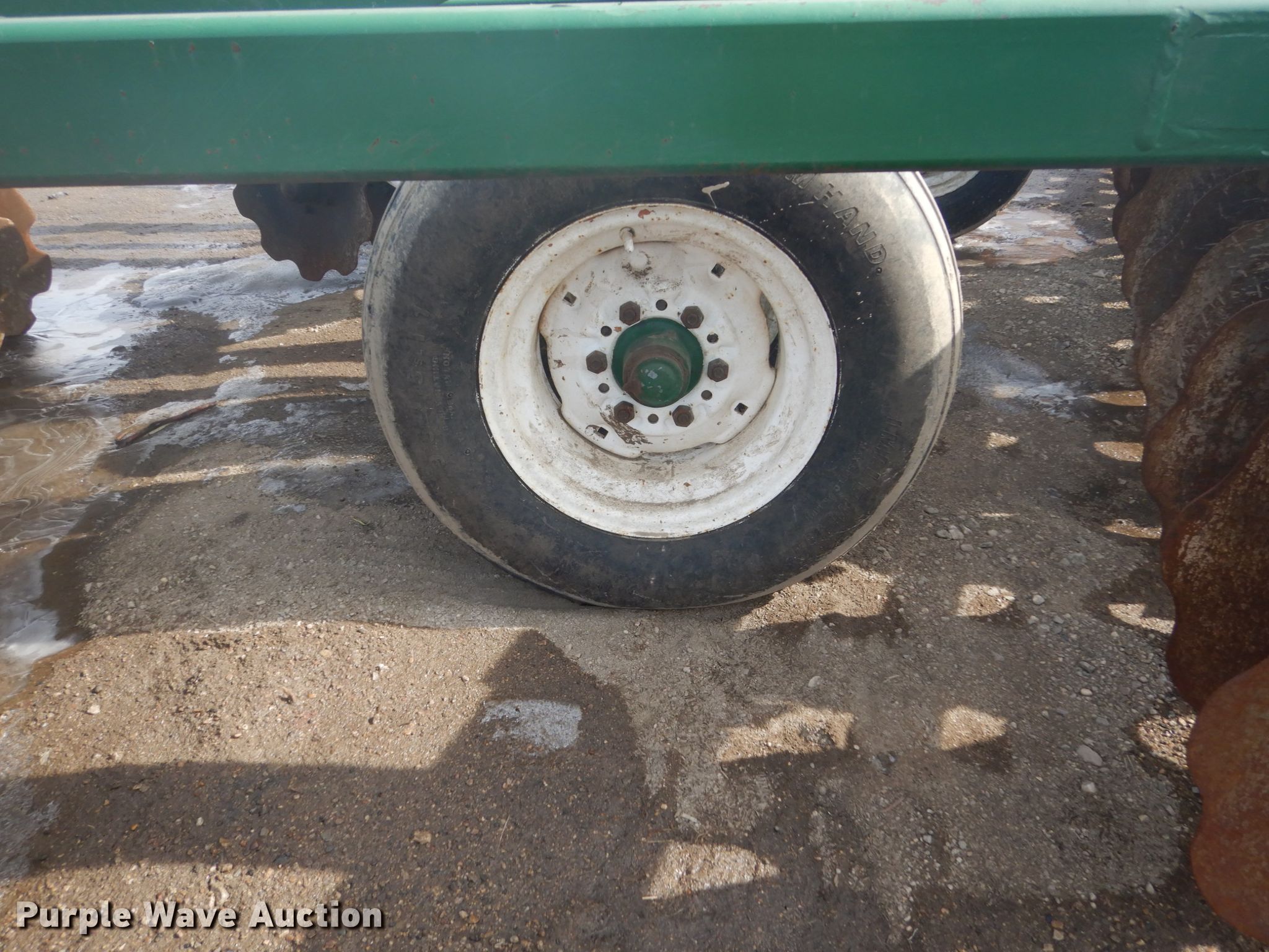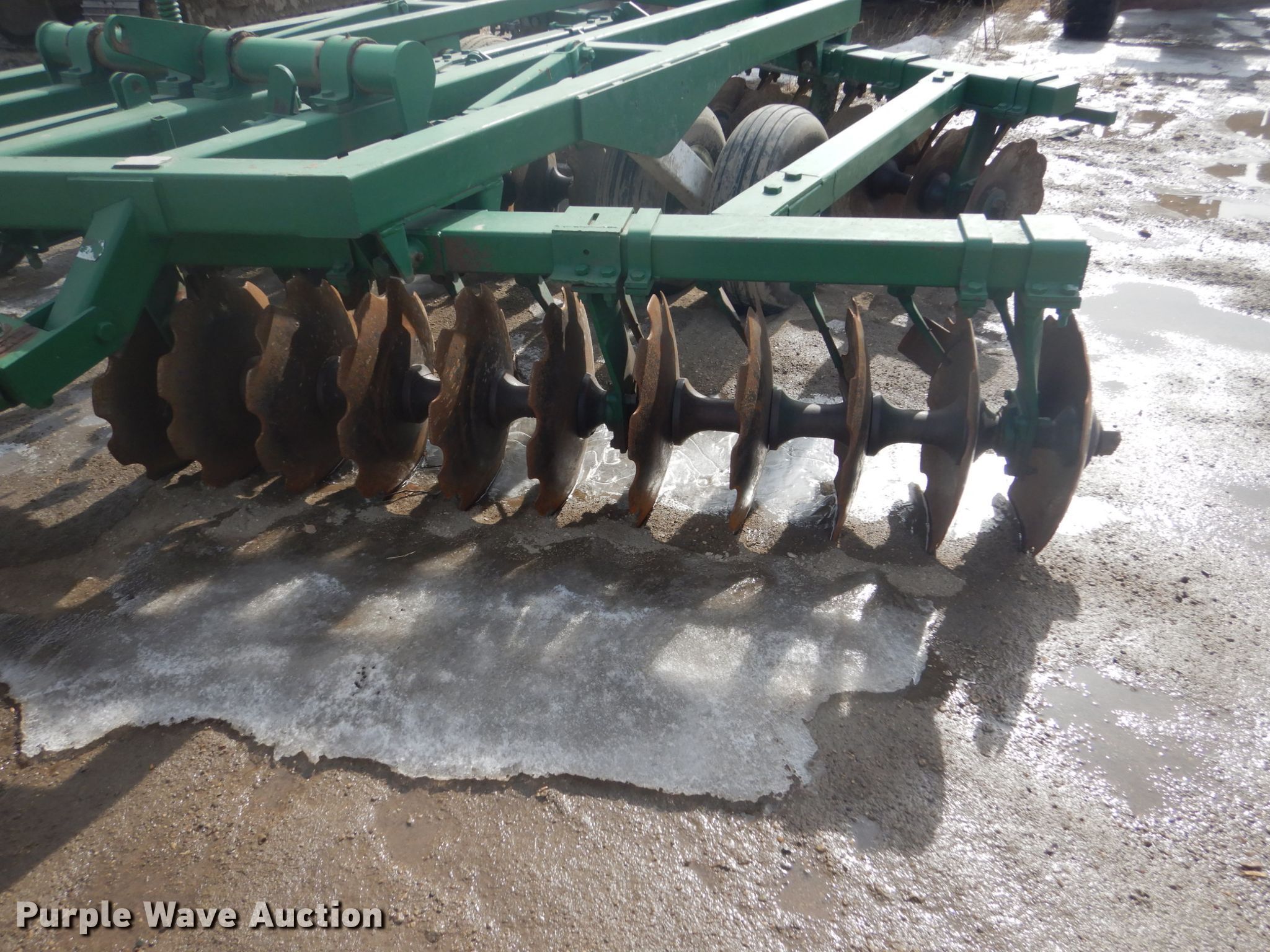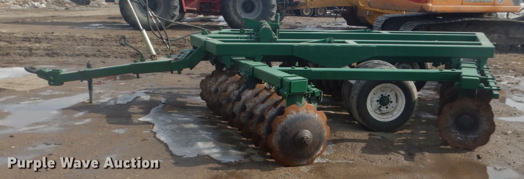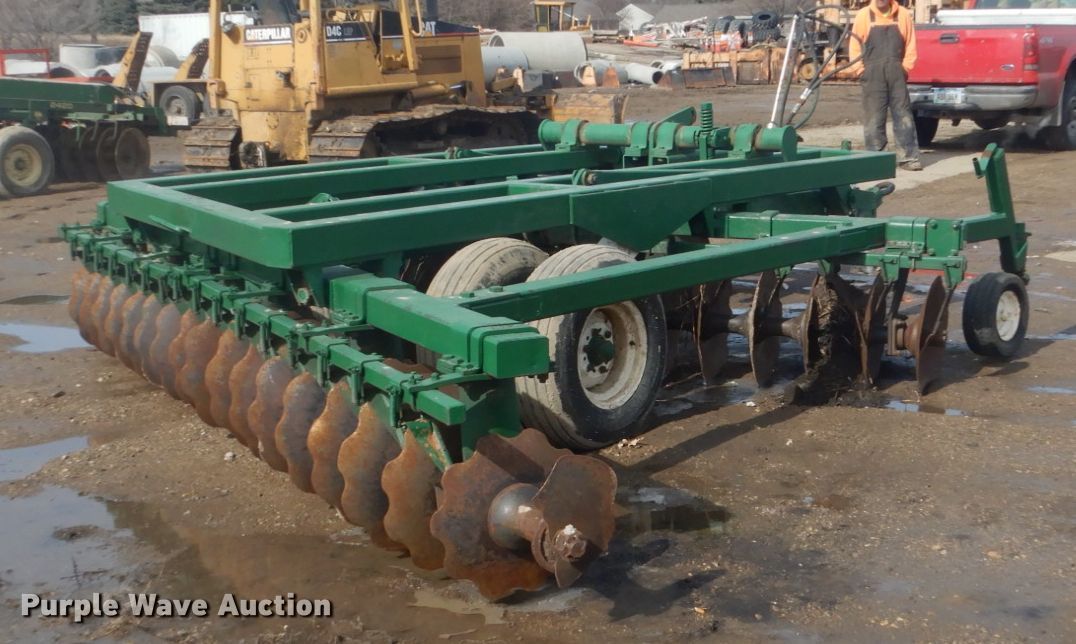 Purple Wave is selling a used Disk in Iowa. This item is a Off-set disk with the following: 14'W, 24" diameter front disk blades, 22" diameter rear disk blades, 9.5" front disk spacing, 10.5" rear disk spacing, Hydraulic lift, 9.5L-15 tires