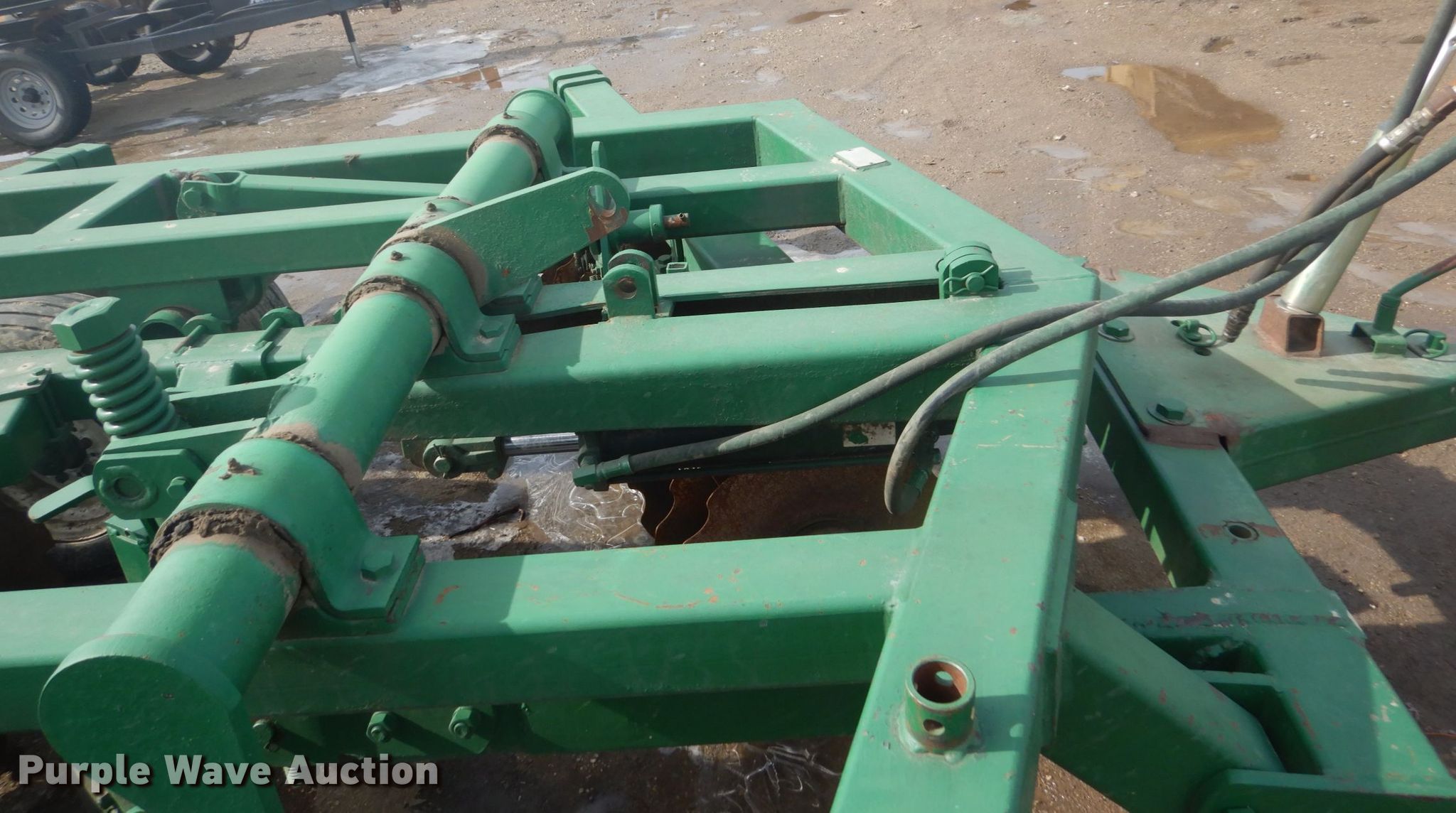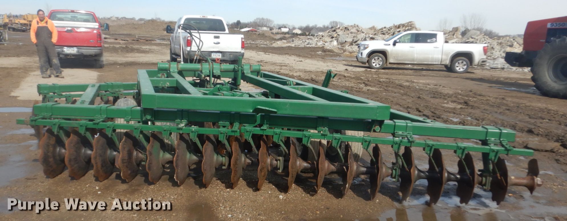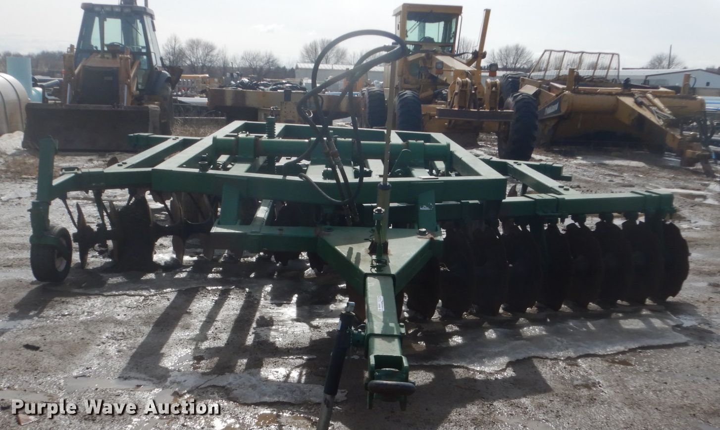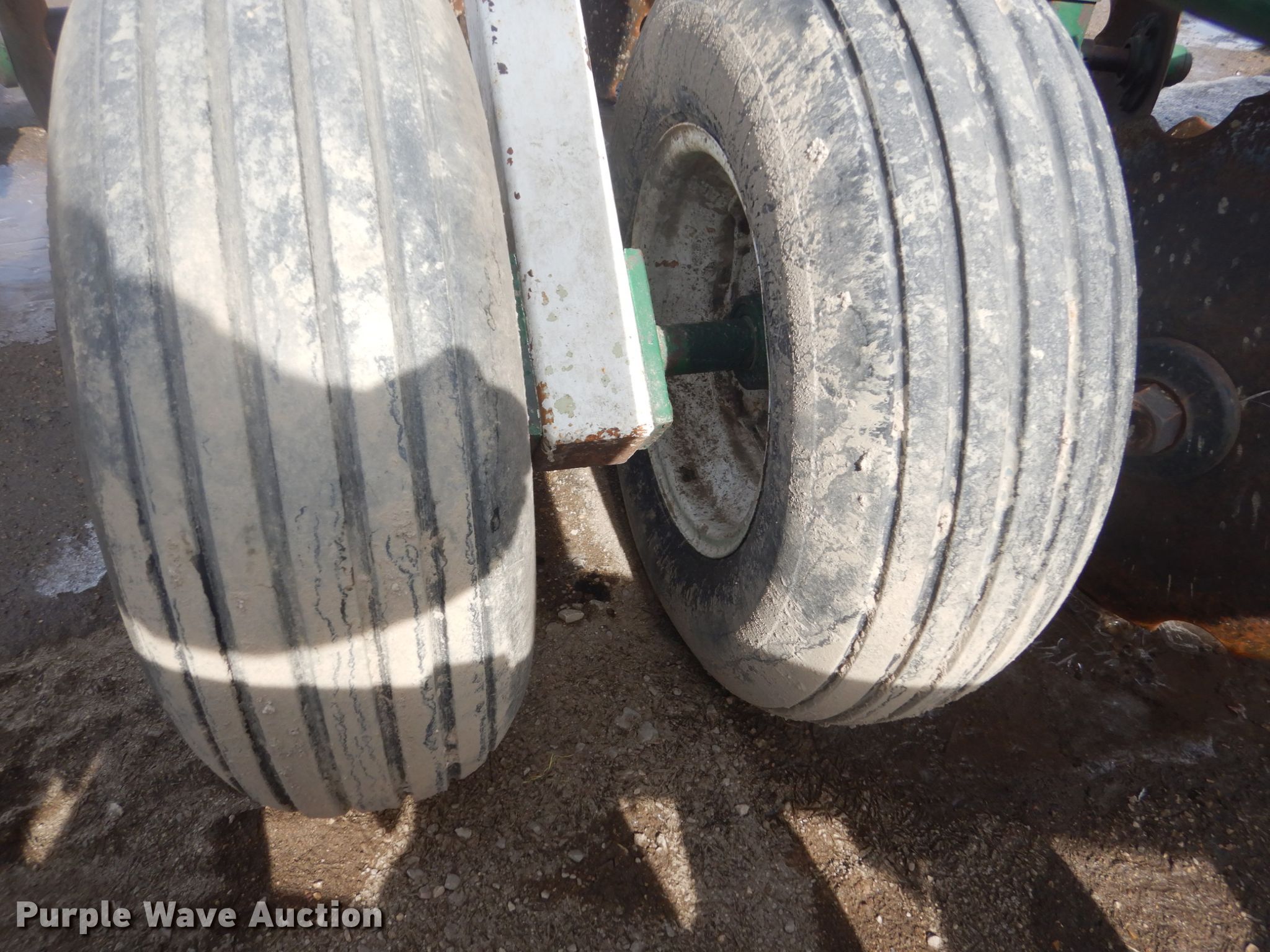 Purple Wave is selling a used Disk in Iowa. This item is a Off-set disk with the following: 14'W, 24" diameter front disk blades, 22" diameter rear disk blades, 9.5" front disk spacing, 10.5" rear disk spacing, Hydraulic lift, 9.5L-15 tires