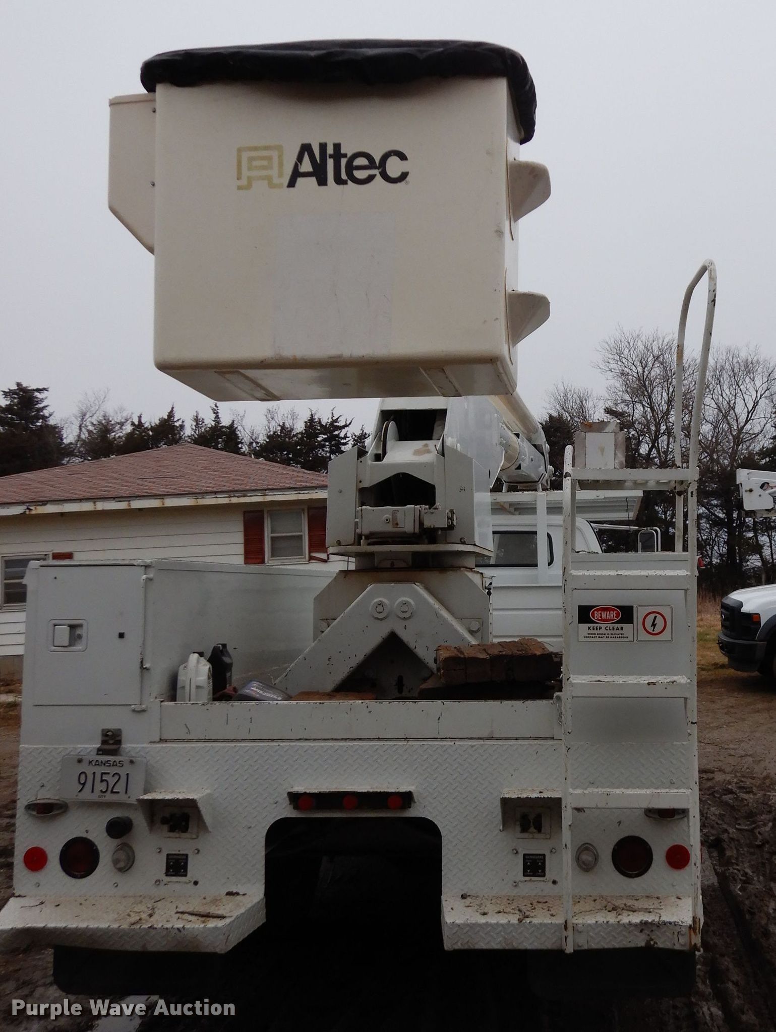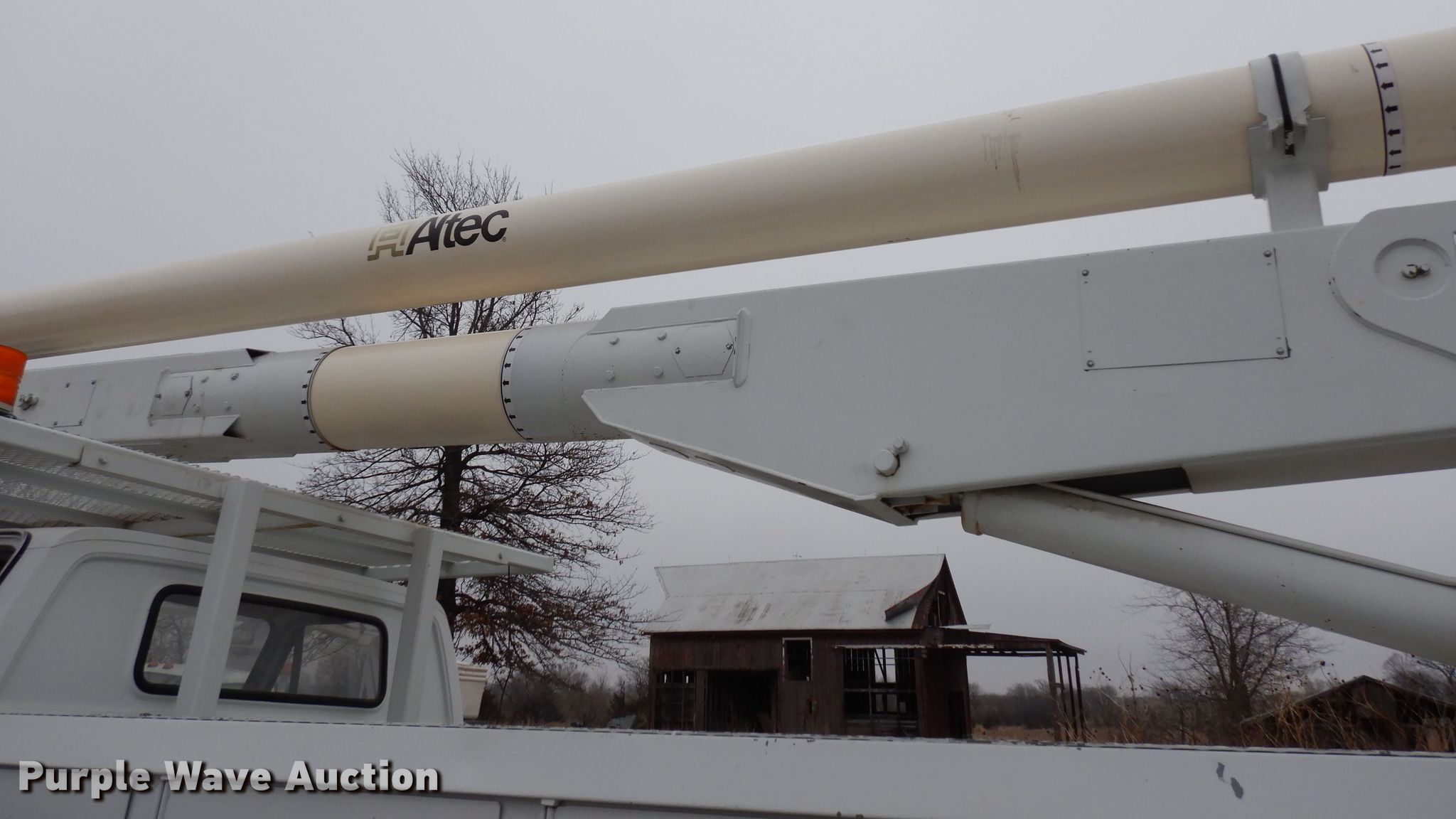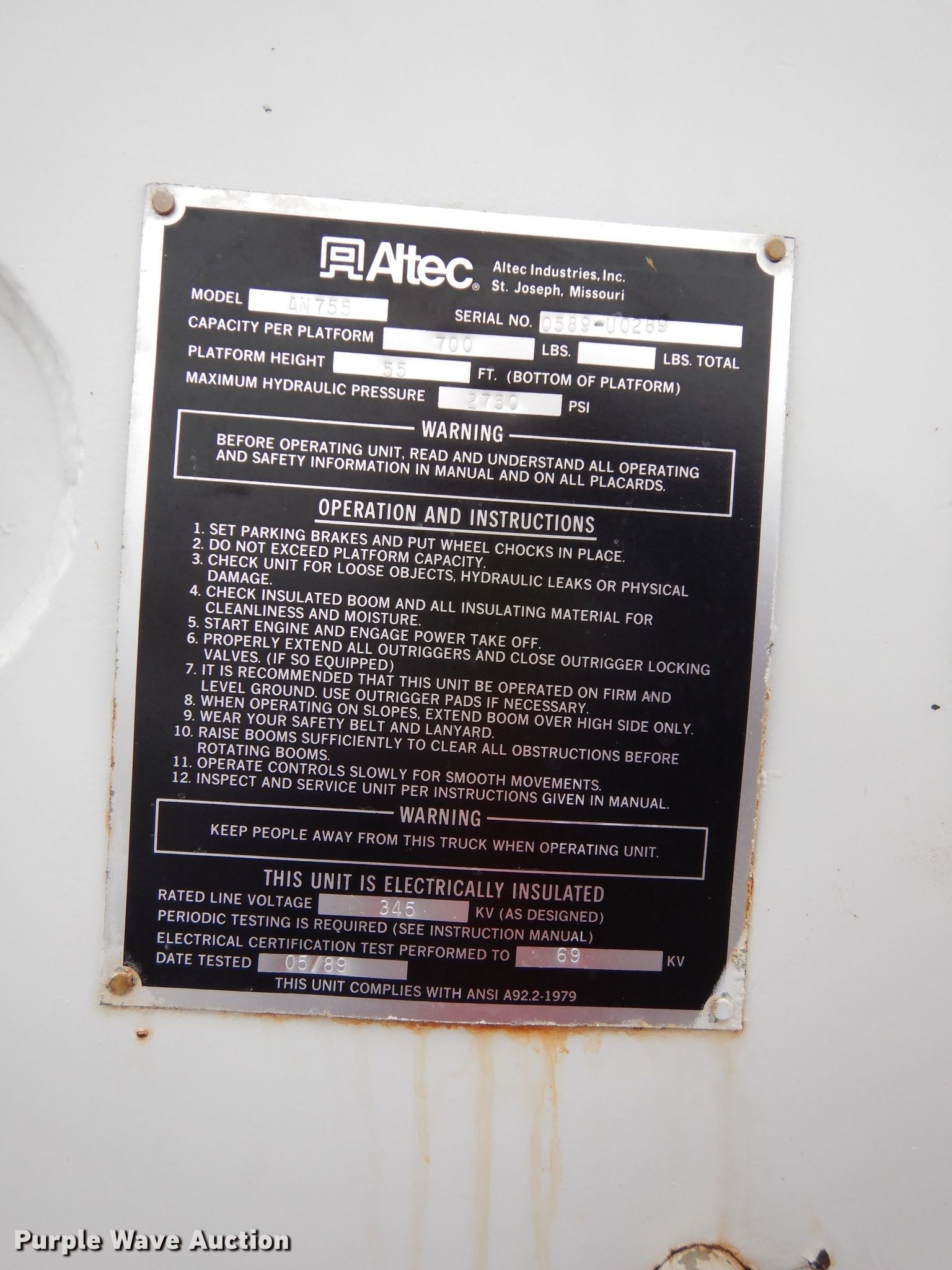 1989 Chevrolet C70 bucket truck. 3,349 miles on odometer, 1,768 hours on meter, 6.0L V8 gas engine, Five speed manual transmission, Single axle, Heat, PTO, Altec utility bed 174"L , Serial 37-62233, 1989 Altec AN755 insulated boom 55' mast height, 700 lbs maximum lift, Man basket Platform controls, Serial 0589-U0289, Certification valid through November 2020, Spring suspension, Hydraulic brakes, 190" wheelbase, BF Goodrich 10.00-20 tires, GVWR 28,000 lbs. Kansas title. 1GBL7D1BXKV112542. Osage City, KS 66523