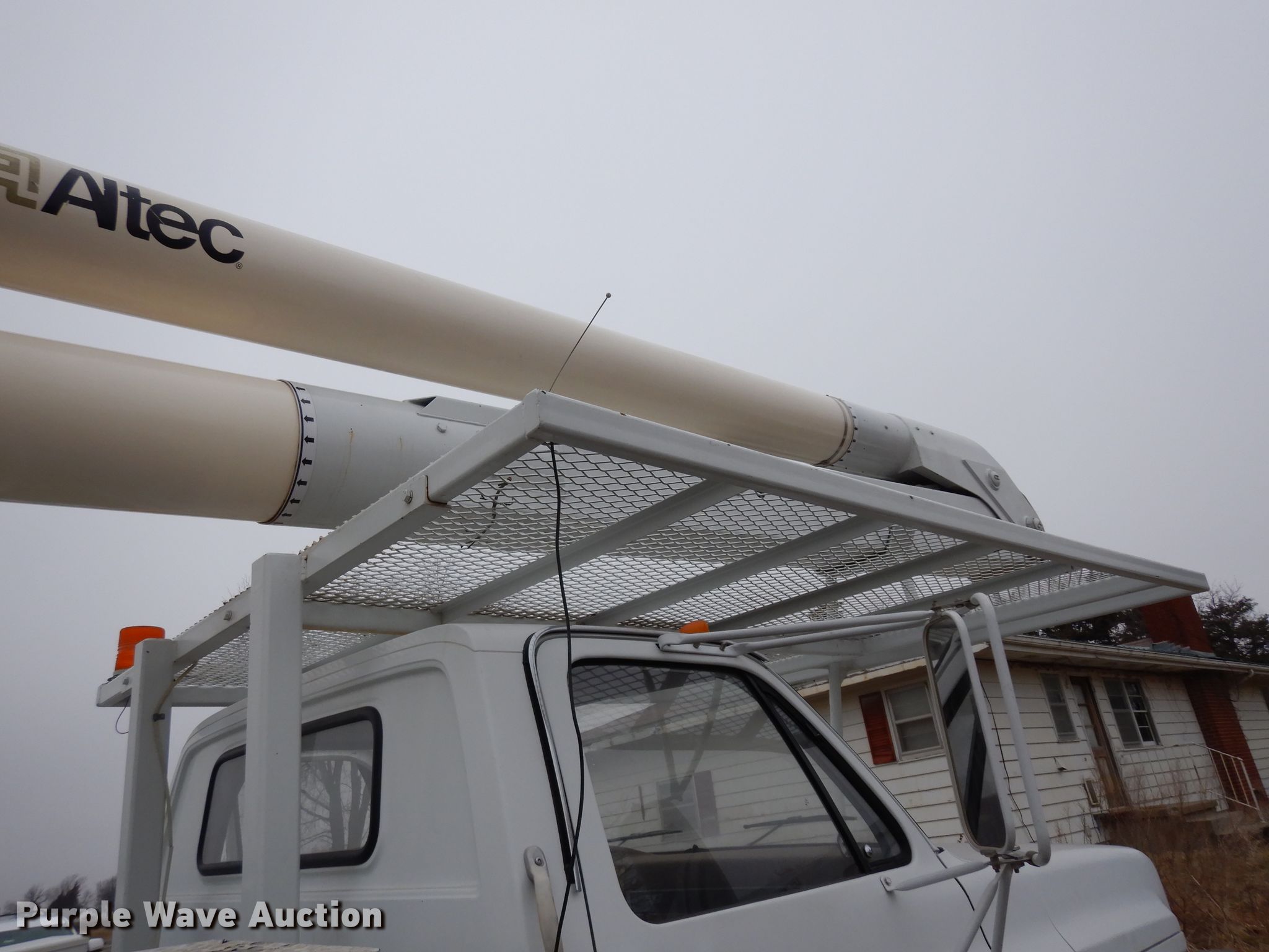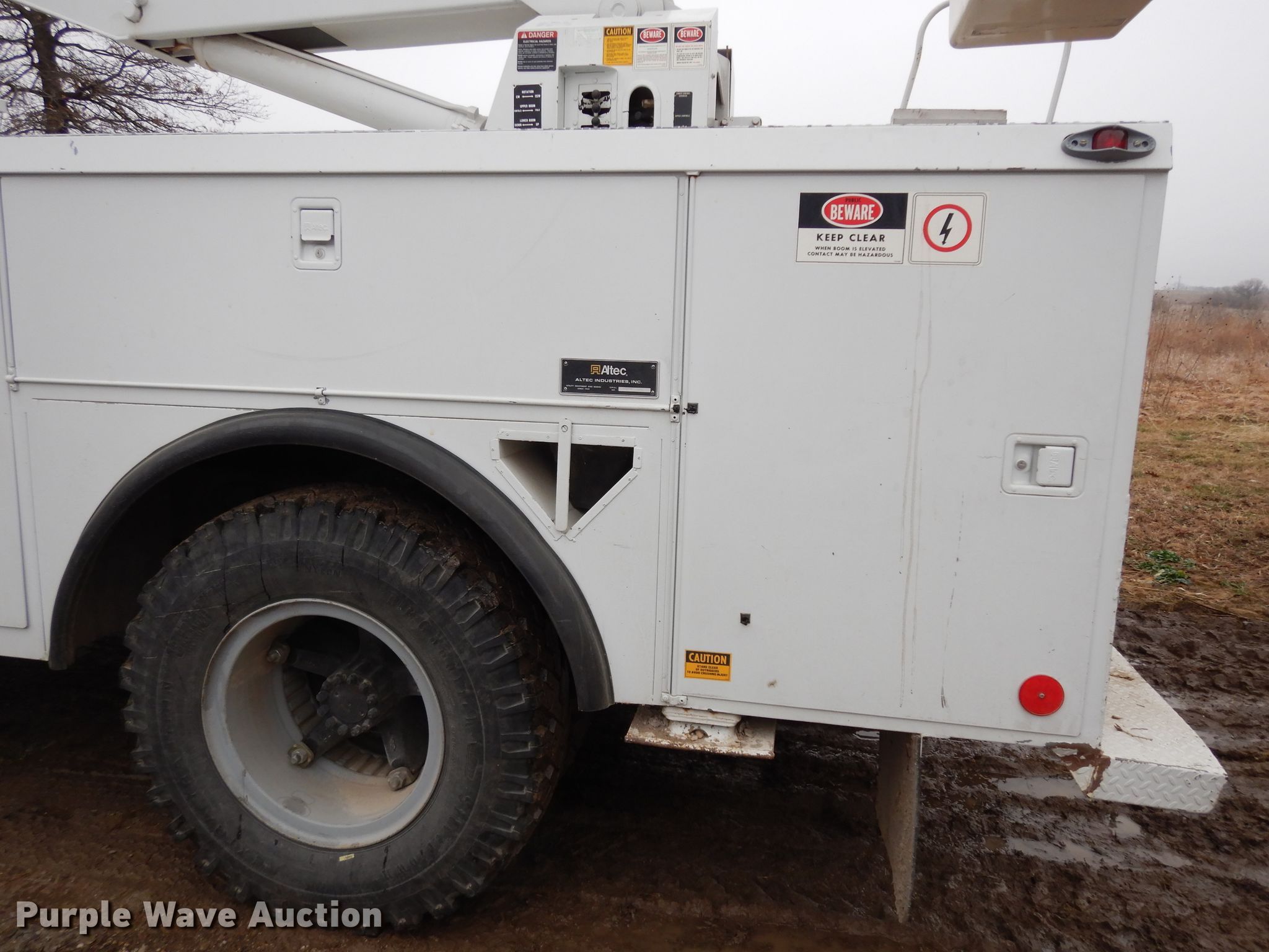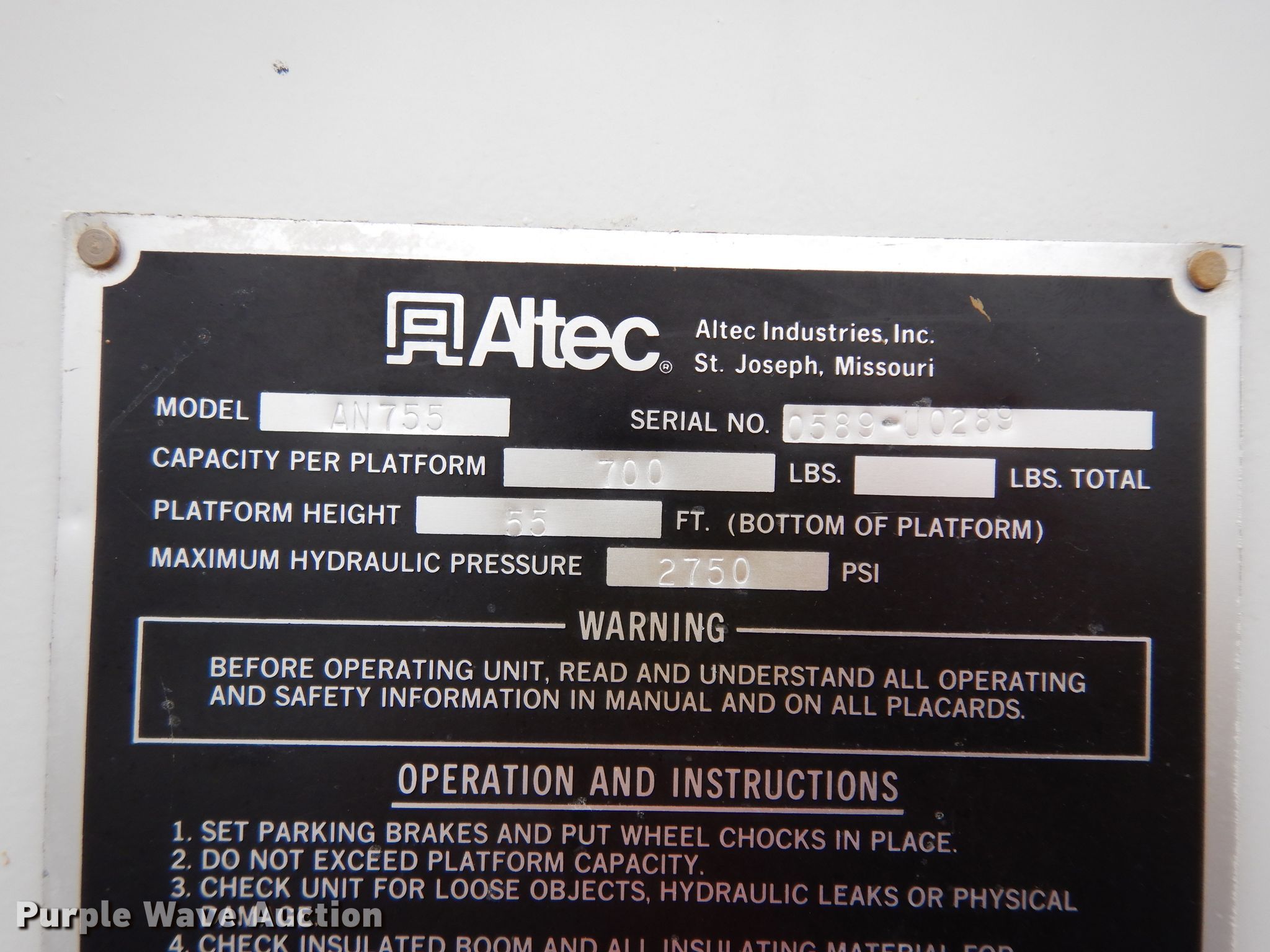 1989 Chevrolet C70 bucket truck. 3,349 miles on odometer, 1,768 hours on meter, 6.0L V8 gas engine, Five speed manual transmission, Single axle, Heat, PTO, Altec utility bed 174"L , Serial 37-62233, 1989 Altec AN755 insulated boom 55' mast height, 700 lbs maximum lift, Man basket Platform controls, Serial 0589-U0289, Certification valid through November 2020, Spring suspension, Hydraulic brakes, 190" wheelbase, BF Goodrich 10.00-20 tires, GVWR 28,000 lbs. Kansas title. 1GBL7D1BXKV112542. Osage City, KS 66523