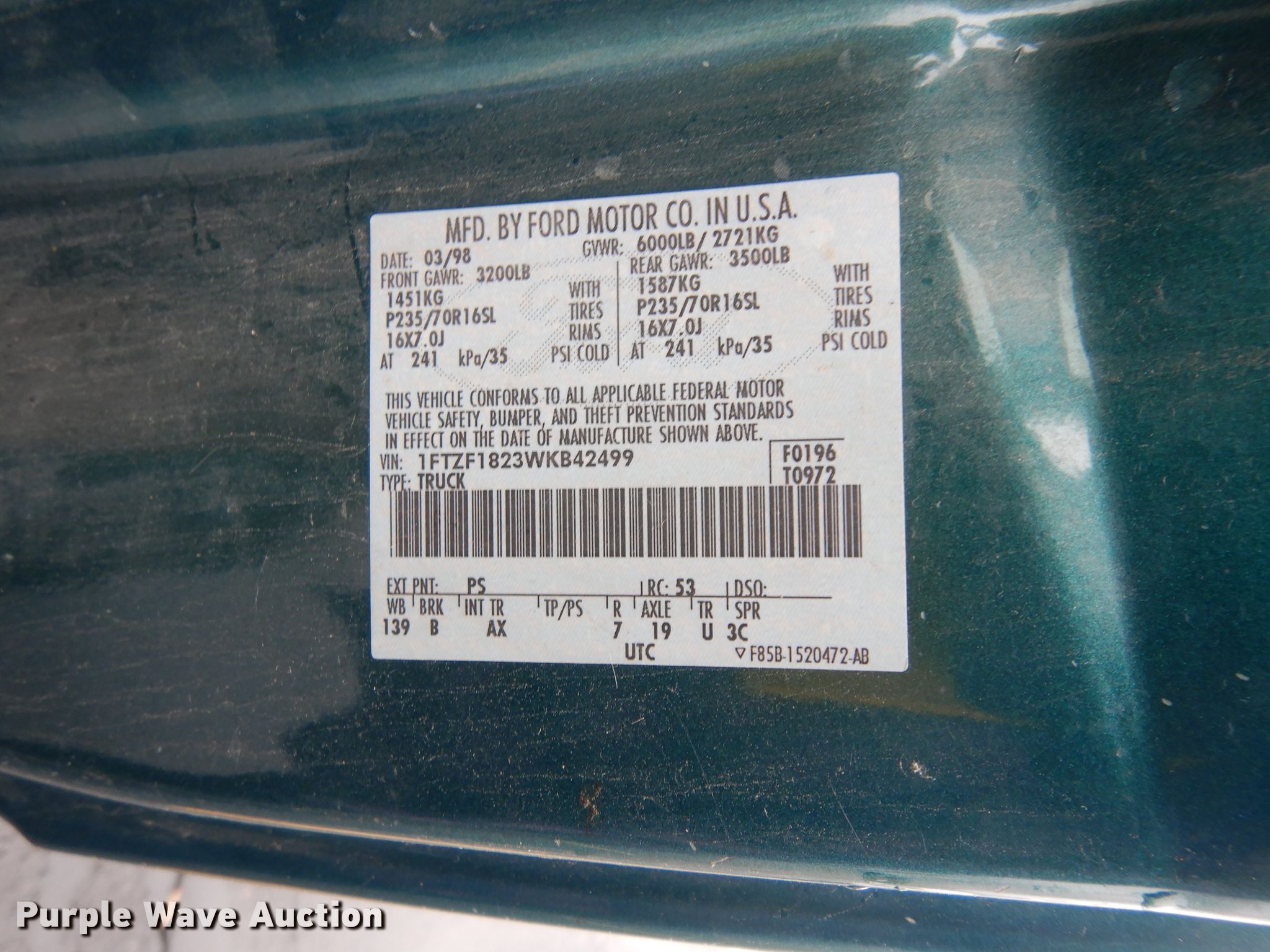 Purple Wave is selling a used 1/2 Ton Pickup or Van in Kansas. This item is a 1998 Ford F150 pickup truck with the following: 148,555 miles on odometer, 4.2L V6 OHV 12V gas engine, Automatic transmission, Four wheel drive, AC and heat, Cruise, 225/75R16 tires, Dead battery, ABS light on, Brakes may need to be replaced, Rodent damage, Floor, cab mounts, and rocker panel damage/rusted, Corrosion damage to underside