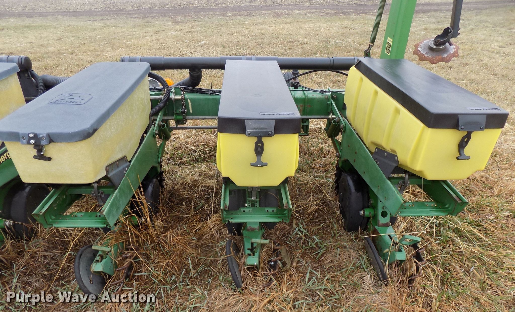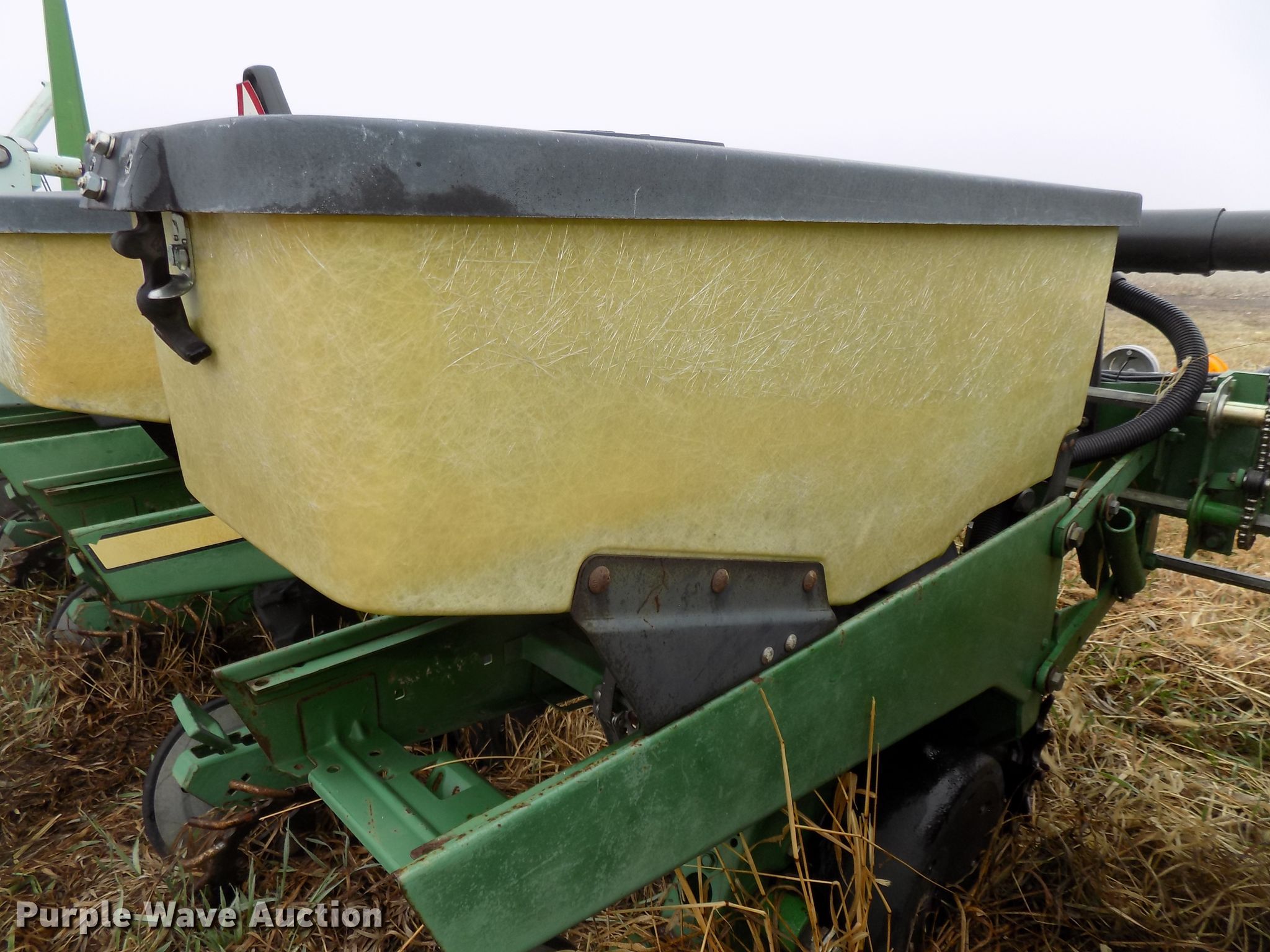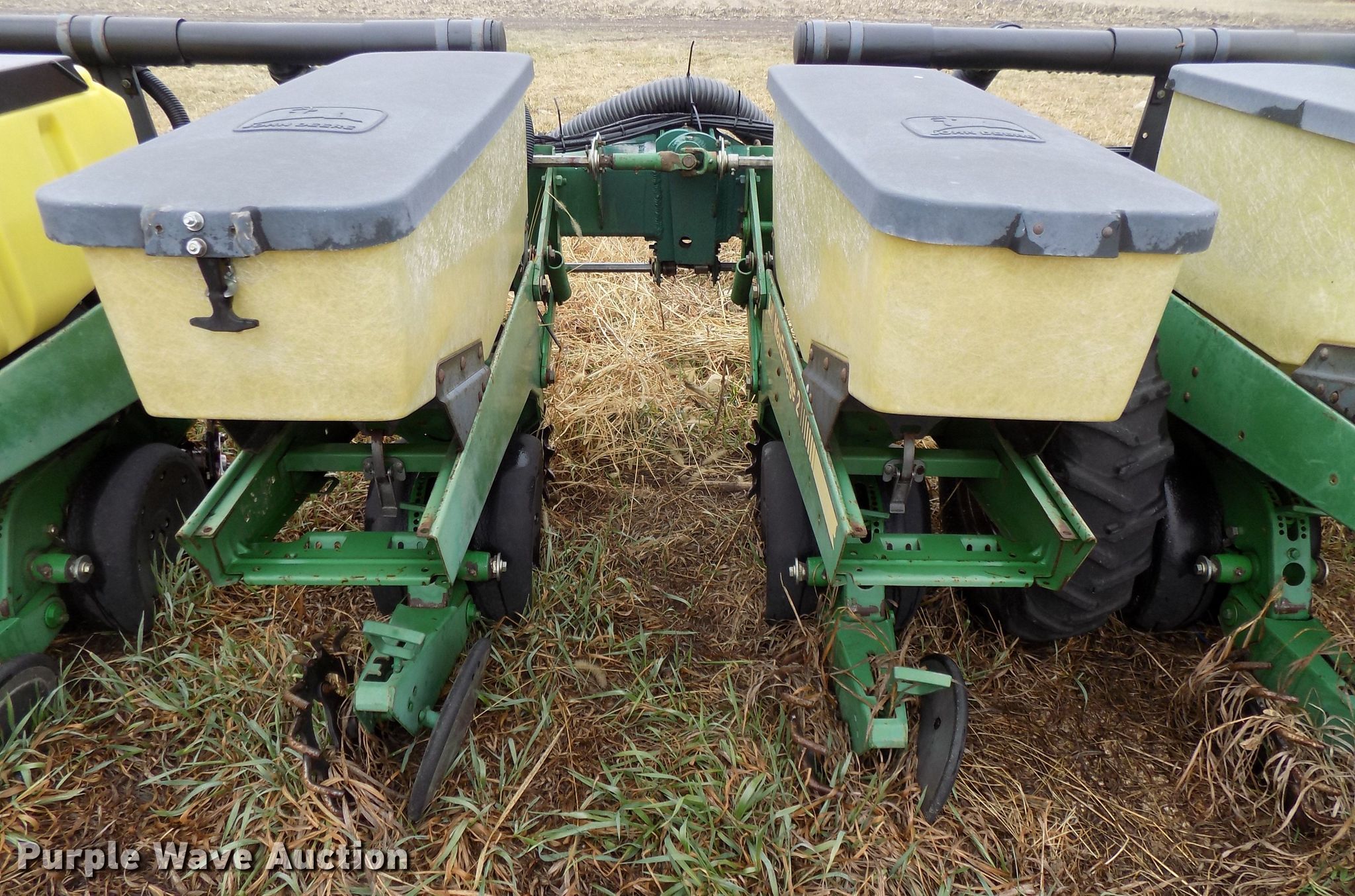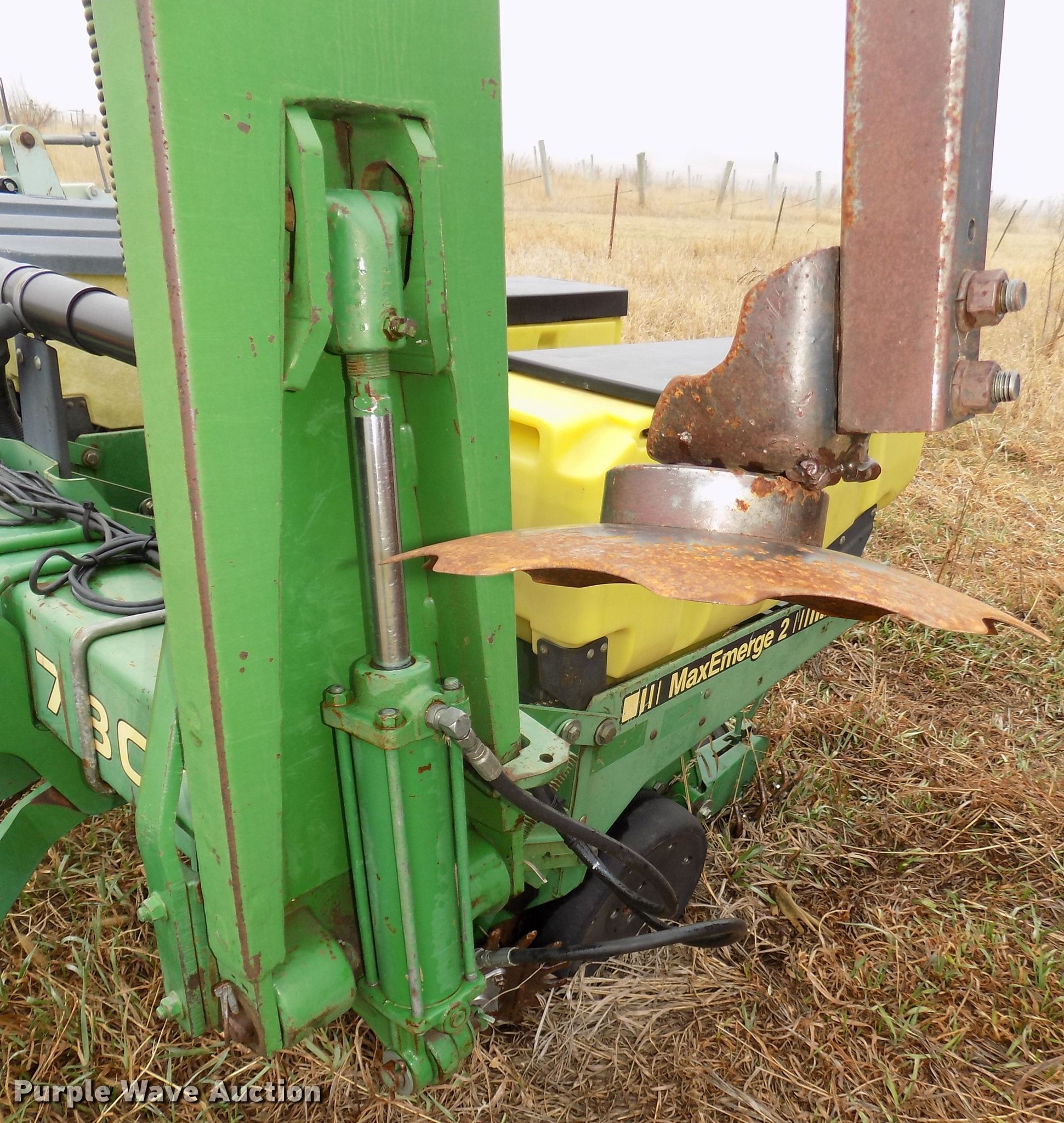 Purple Wave is selling a used Planter in Nebraska. This item is a John Deere 7300 planter with the following: 30'W, 12 row units, 30" row spacing, Marker arms, Hydraulic fold, Individual seed hoppers, Three bushel capacity, Ground meter drive, Corn, soybean, and milo seed meters, HD spring down pressure, Double disk openers, Dawn row cleaners, Single gauge wheels, Schlagel double rubber spiked closing system, John Deere 250 monitor, Duo-Rate population controller, Orthman 601-337 lift assist, Three point, (4) 7.60-15 drive/outside tires, (2) 9.5L-15 transport tires, Serial H07300B202165