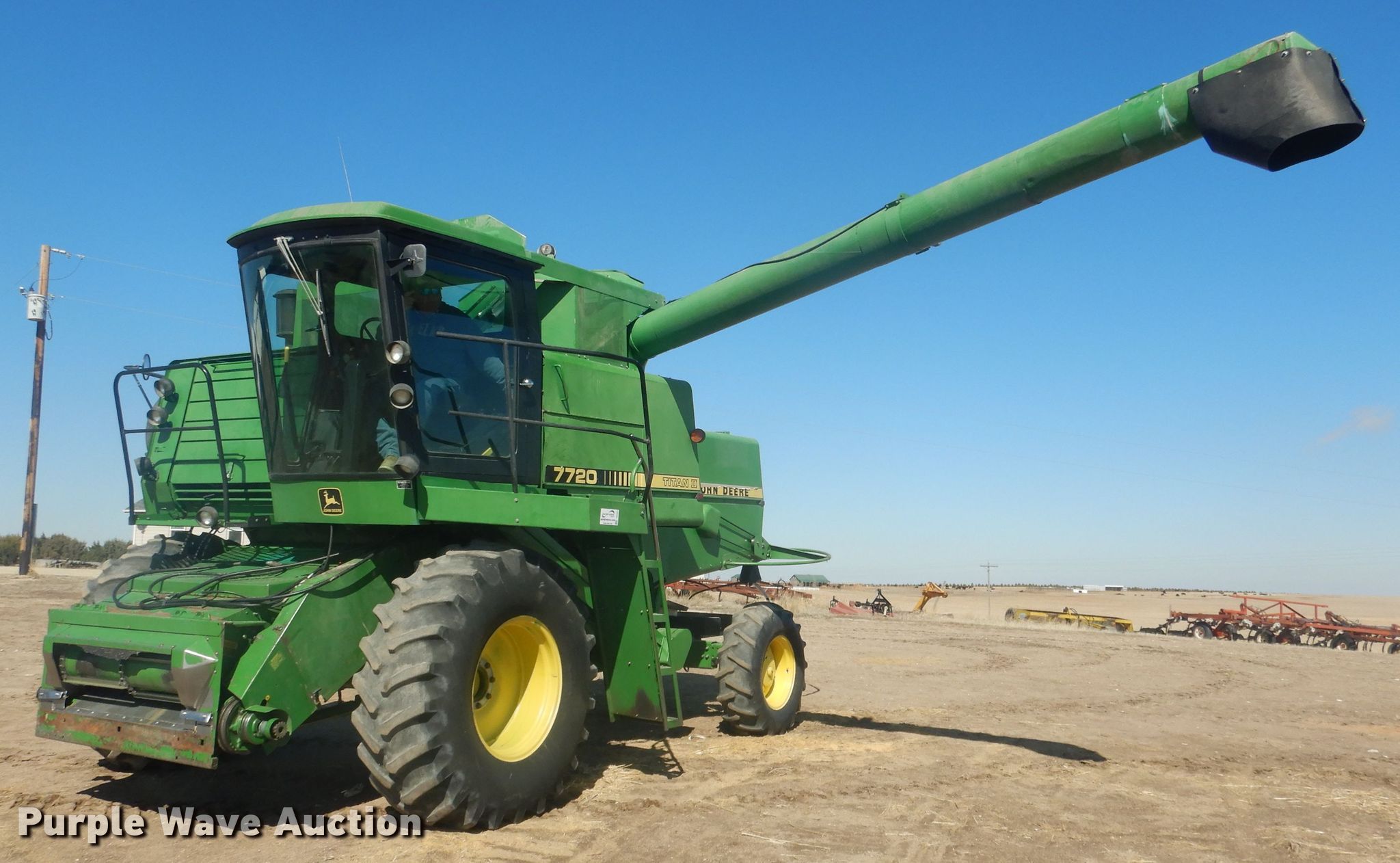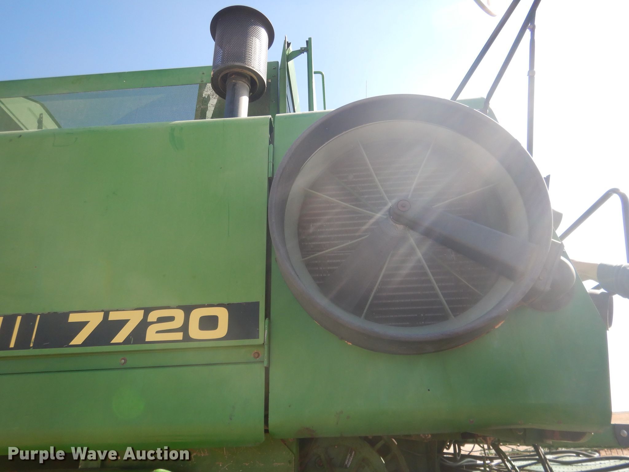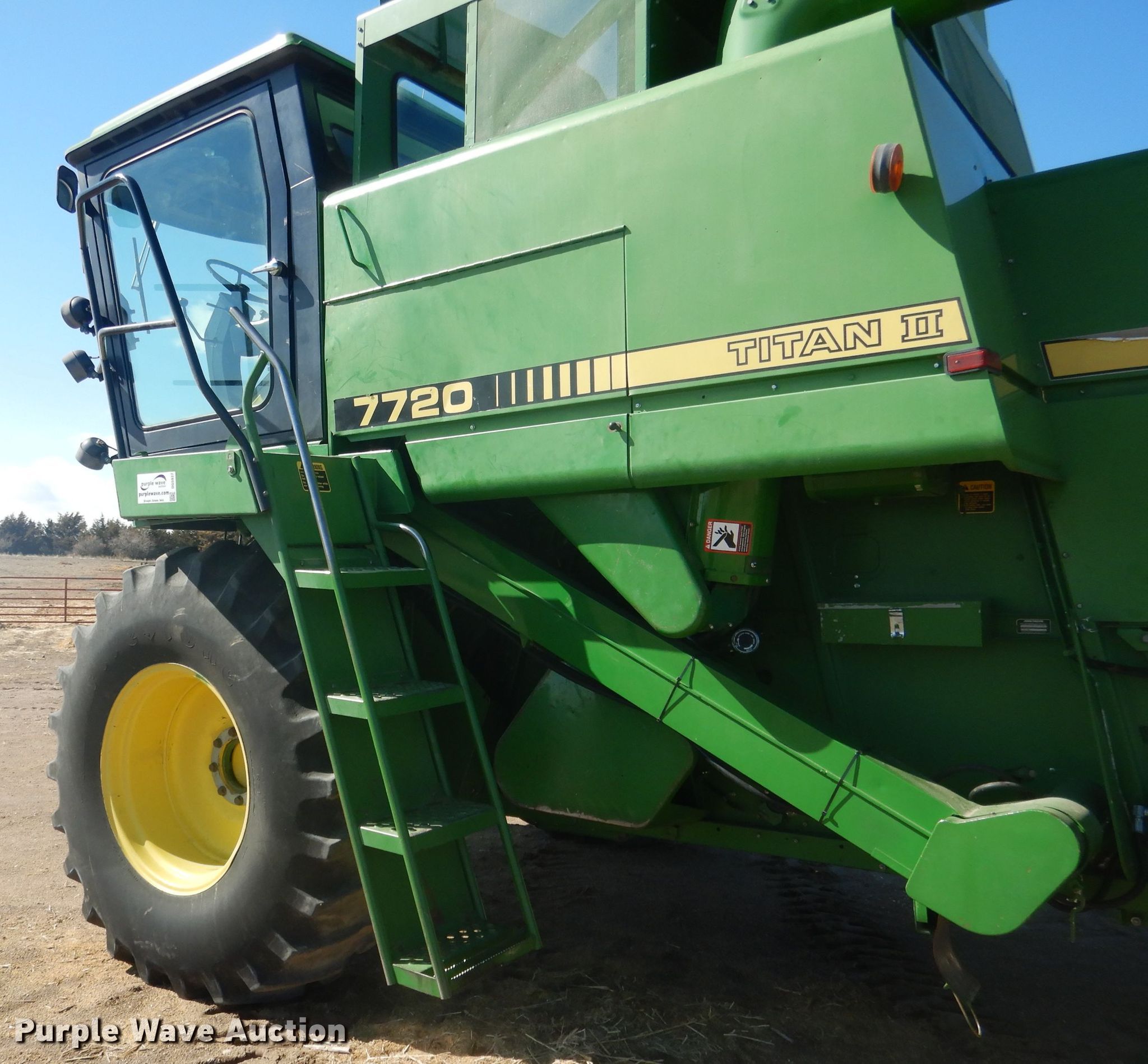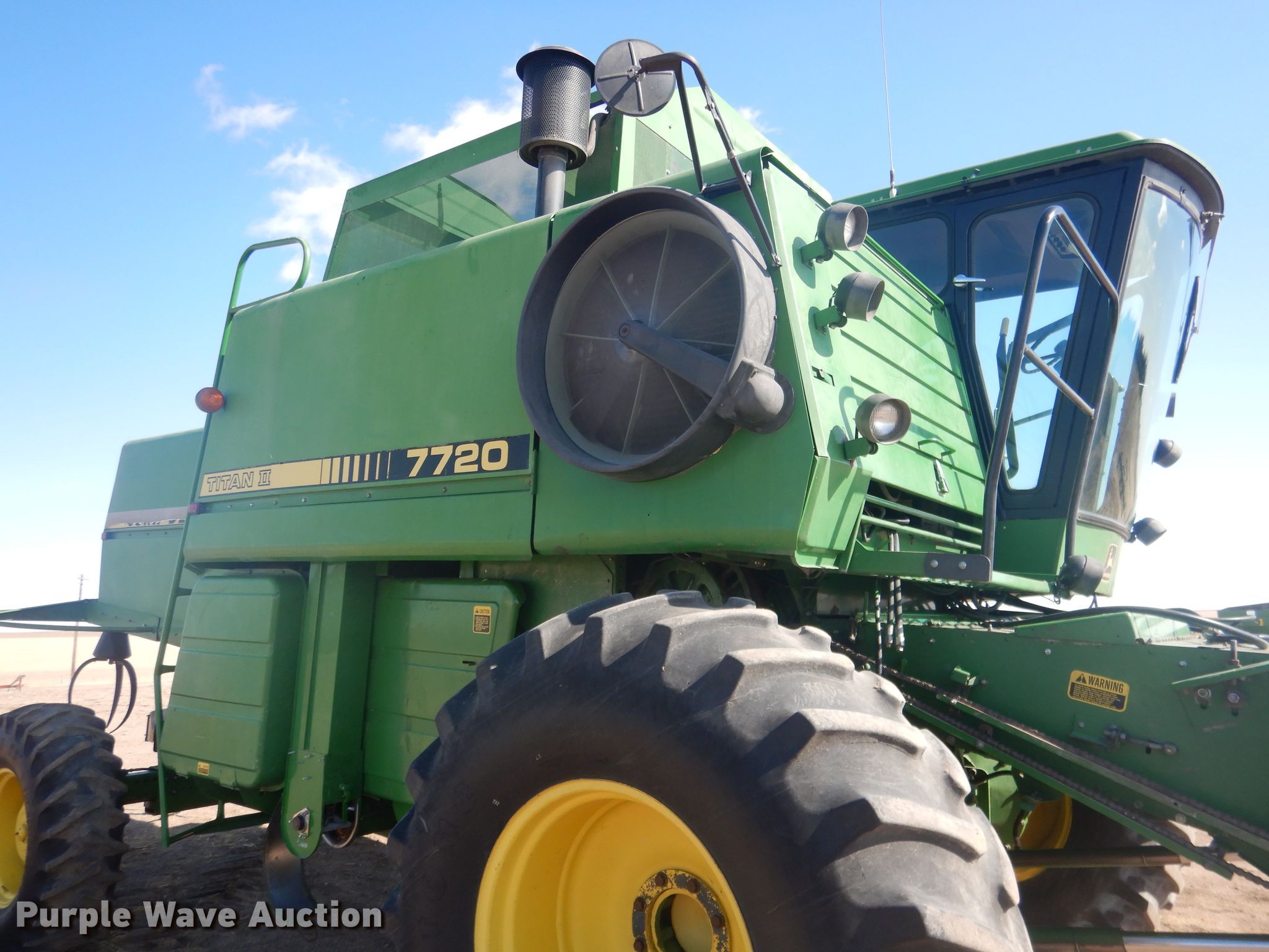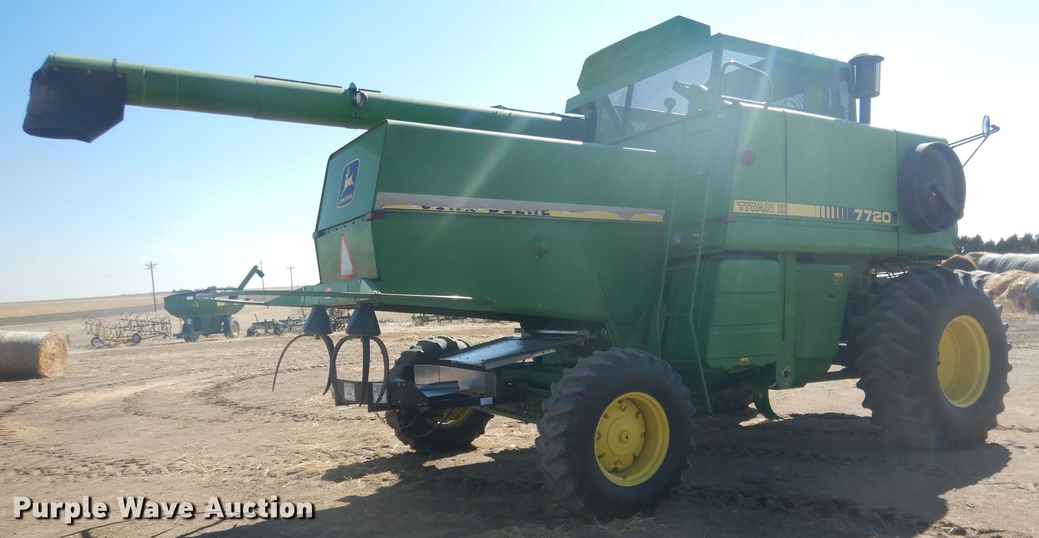 Purple Wave is selling a used Combine in Nebraska. This item is a 1988 John Deere 7720 Titan II combine with the following: 418 engine hours on meter, Approximately 4,400 total hours on unit, John Deere six cylinder diesel engine, Hydrostatic transmission, 4F - 4R, Feederhouse, Reverser, Small wire concaves, 18'L unloading auger, Chaff spreader, AC and heat, Operator manual, Serial H07720X625610, Unit# 01