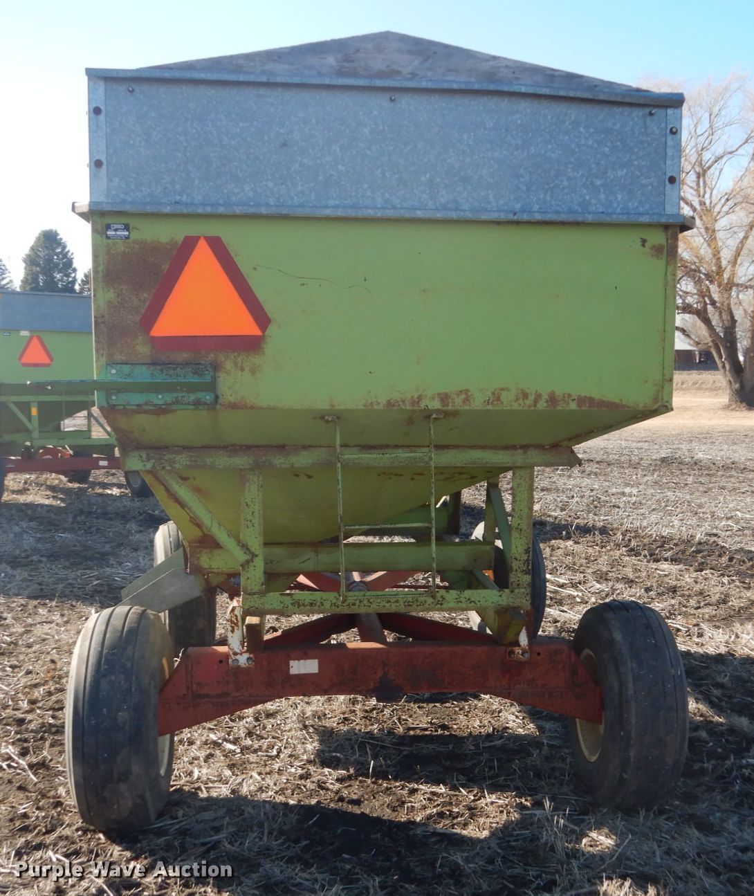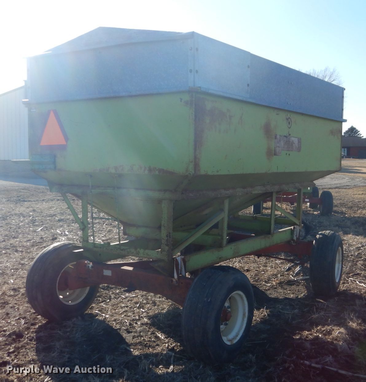 Purple Wave is selling a used Grain Cart or Gravity Wagon in Iowa. This item is a Parker gravity wagon with the following: (2) compartments, Adjustable tongue, 12.5L-15 tires