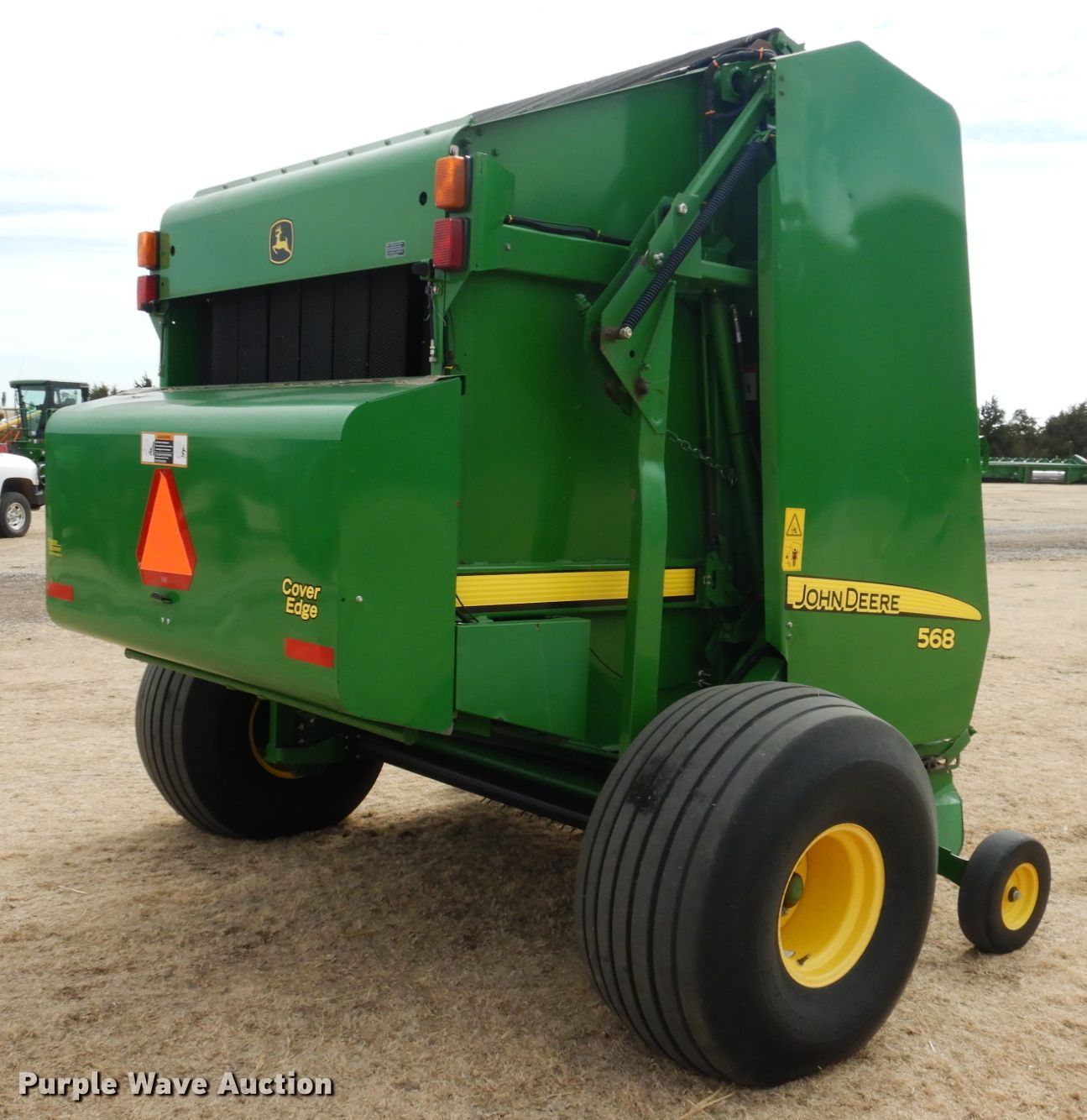 Purple Wave is selling a used Round Baler in Kansas. This item is a 2011 John Deere 568 round baler with the following: 6,316 bale count, 5' x 6' bale capacity, 78"W pickup, Hydraulic pickup width, Feed assist roller, John Deere monitor, Moisture sensor, Auto-tie, Twin twine tie, CoverEdge net-wrap, Bale kicker, Transport lights, Gauge wheels, Large 1000 PTO, 21.5L-15.1 tires, Serial 1E00568XPAB375255