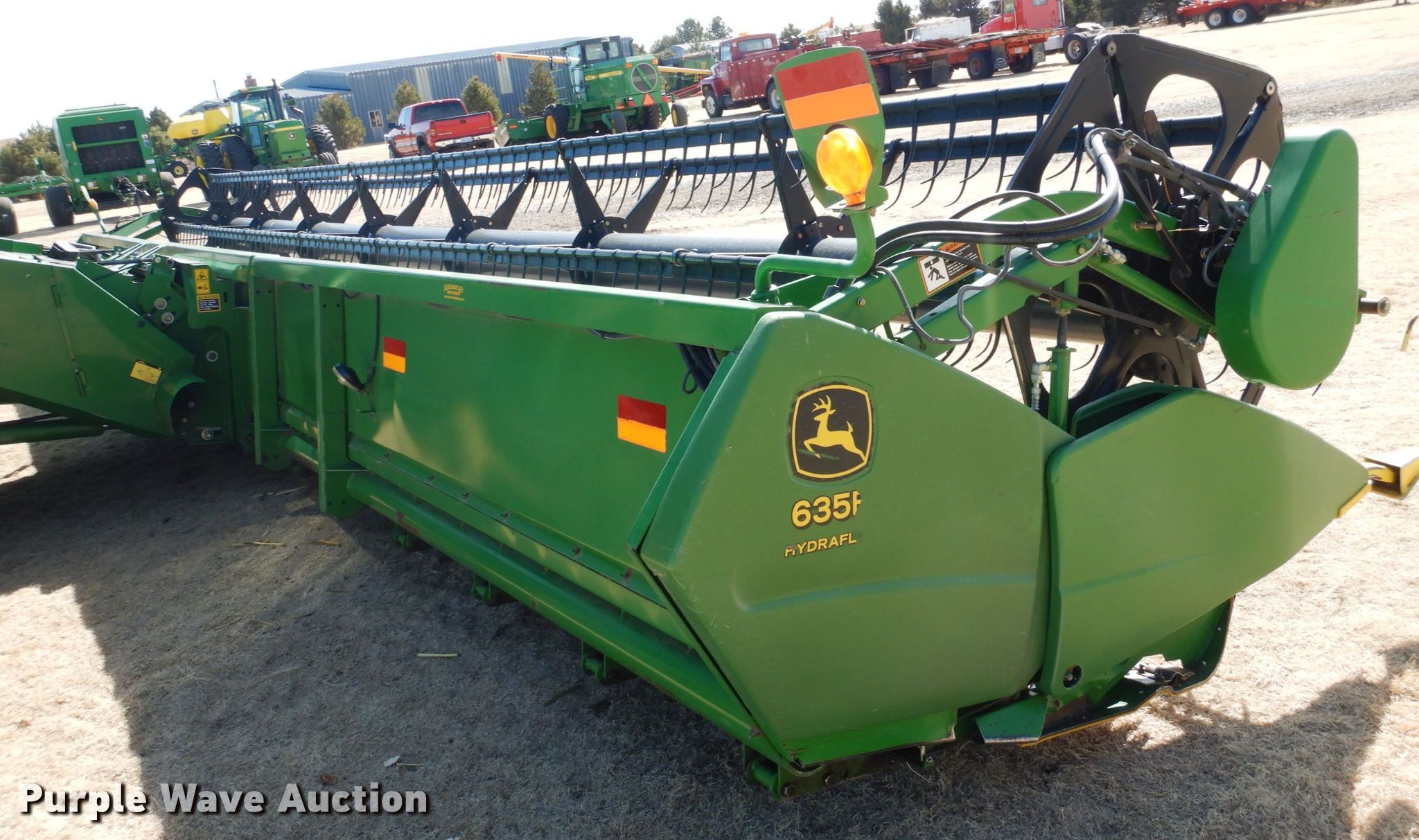 Purple Wave is selling a used Platform or Stripper Head in Kansas. This item is a John Deere 635 Hydraflex flex head with the following: 35'W, Finger reel, Hydraulic fore/aft, Hydraulic reel height control, Poly skid plates, Single point coupler, Single driveline, Serial H00635F716081