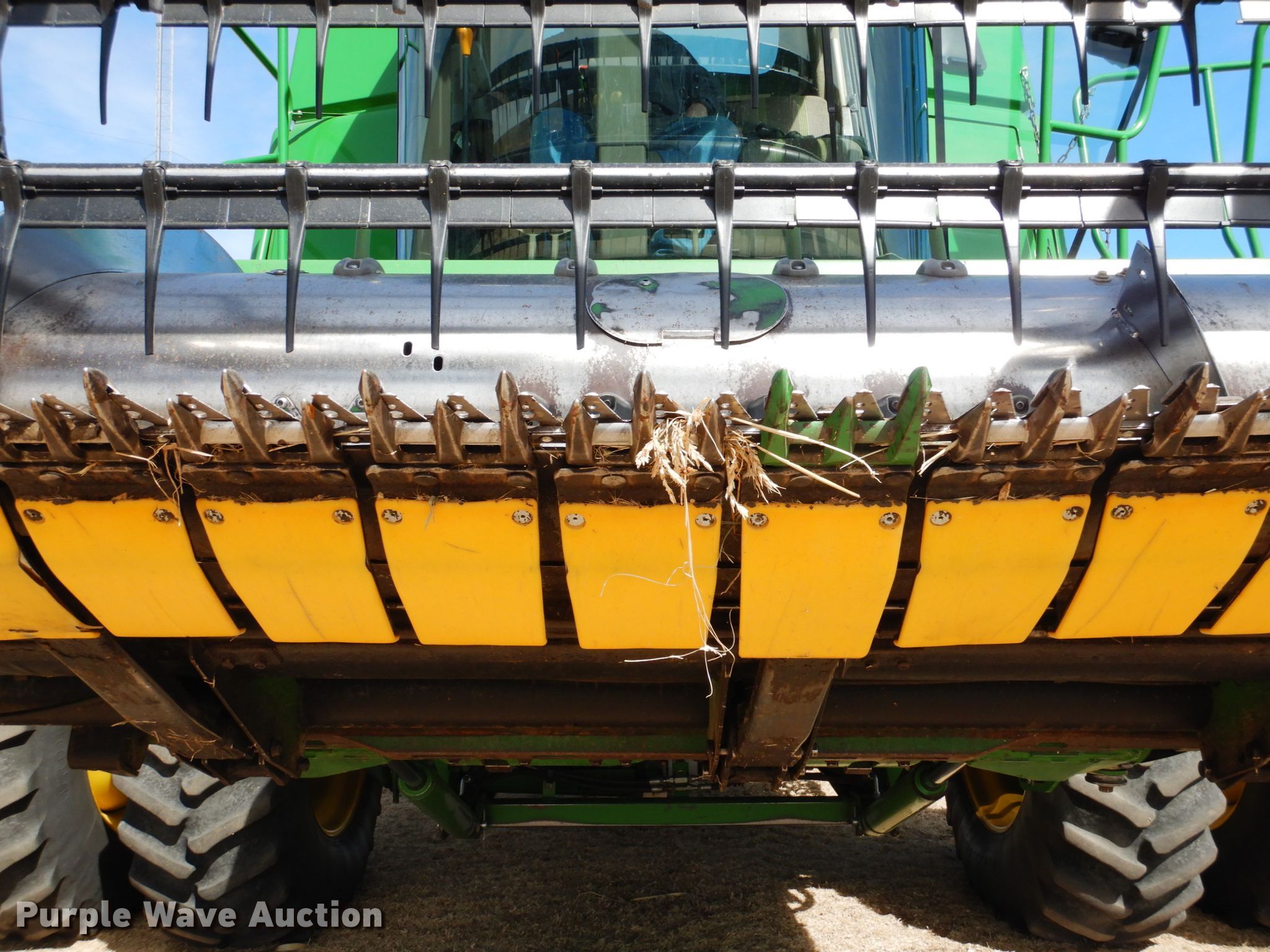 John Deere 635 Hydraflex flex head. 35'W, Finger reel, Hydraulic fore/aft, Hydraulic reel height control, Poly skid plates, Single point coupler, Single driveline, Serial H00635F716081. Struss Farms LLC Retirement. 15075 210th Ave. WaKeeney, KS 67672
