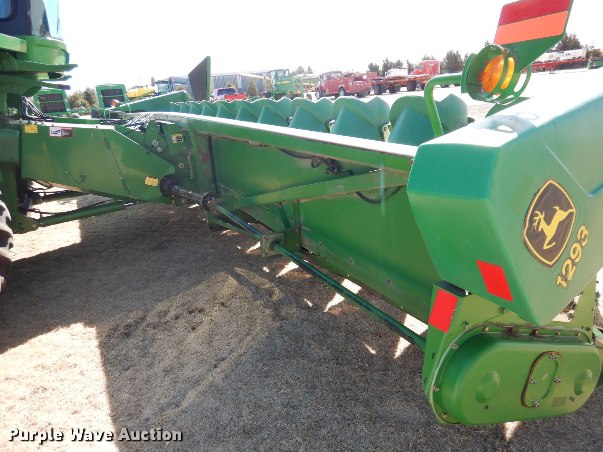 Purple Wave is selling a used Corn or Row Head in Kansas. This item is a John Deere 1293 corn head with the following: 12 rows, 30" row spacing, Dual drivelines, Serial H01293X655813