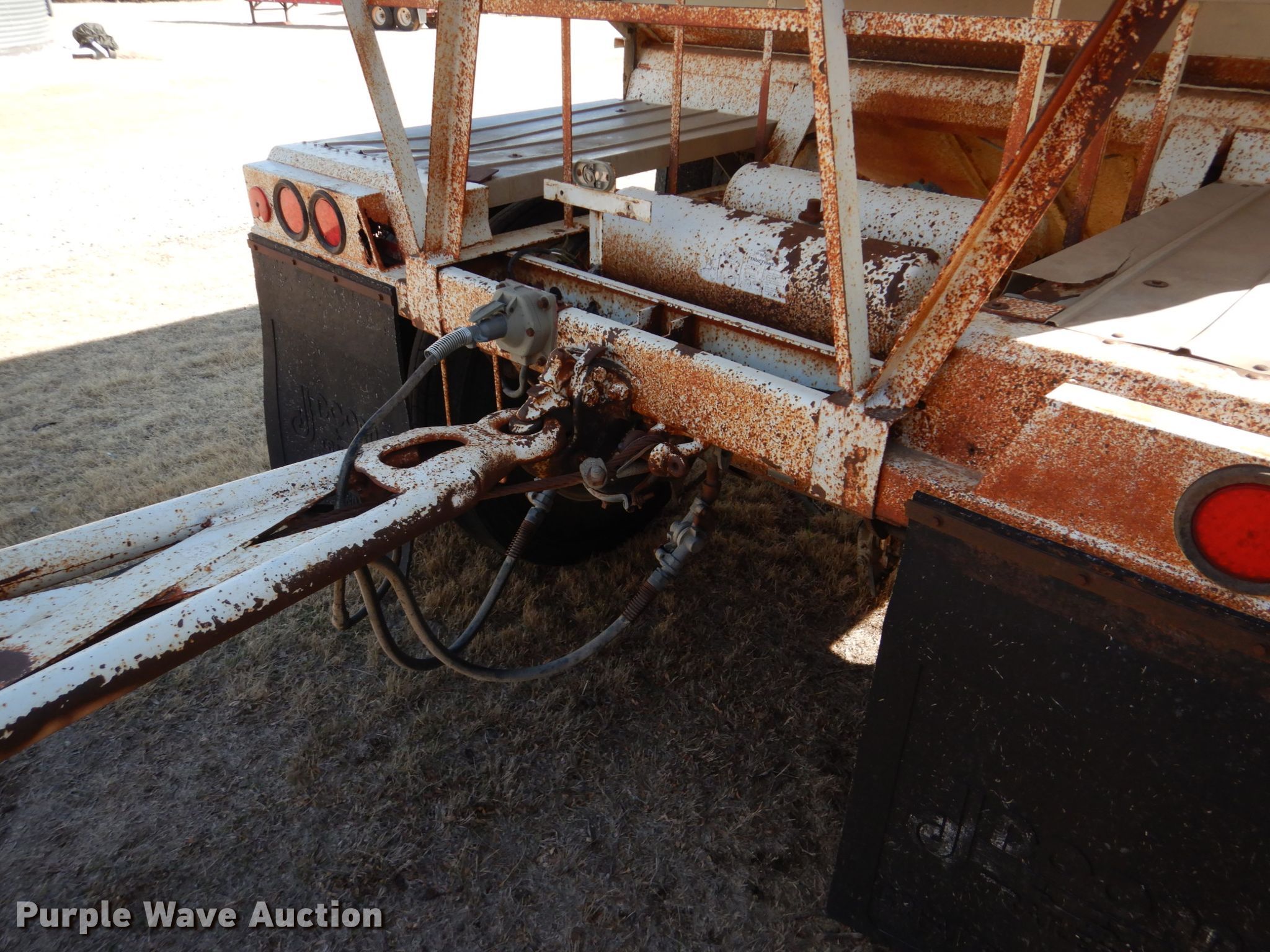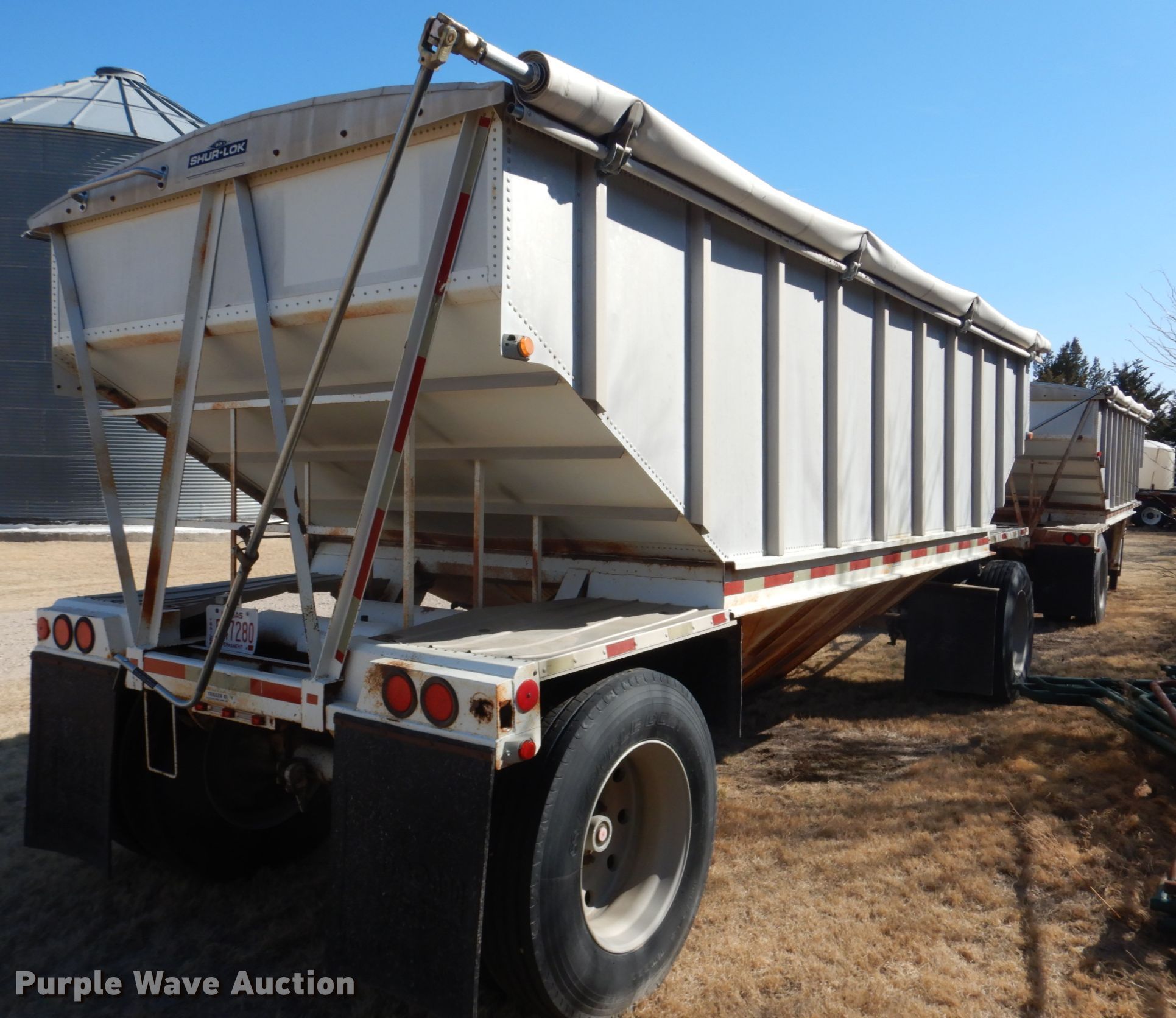 Purple Wave is selling a used Grain or Commodity Trailer in Kansas. This item is a (2) Doonan grain trailers with the following: 1992 Doonan single hopper bottom grain trailer, 22'L x 96"W overall, 57" side height, Manual trap gates, Roll tarp, Aluminum construction, Rear brake outlet, Rear electric outlet, Rear outlet hitch, Dual leg two speed landing gear, Spring suspension, Air Brakes, Aluminum wheels, 11R24.5 tires, GVWR 40,000 lbs, VIN 1D9GH2116NG208647, 1992 Doonan single hopper pup grain trailer, 33'L overall, 21'L x 96"W body, 57" side height, Manual trap gates, Roll tarp, Aluminum construction, Air brakes, Tandem axle, Aluminum wheels, 11R24.5 tires, GVWR 40,000 lbs, VIN 1D9GH2127NG208651