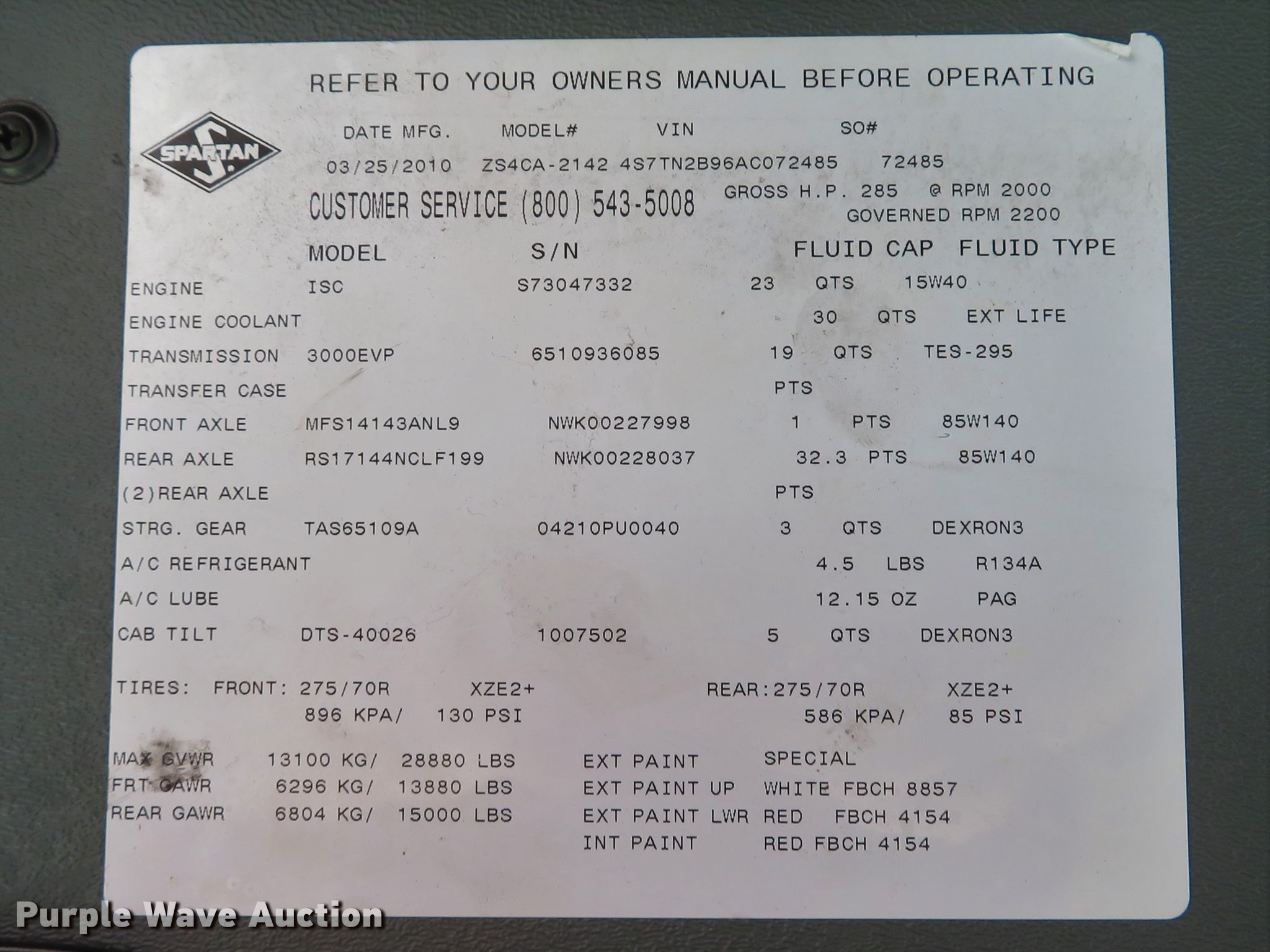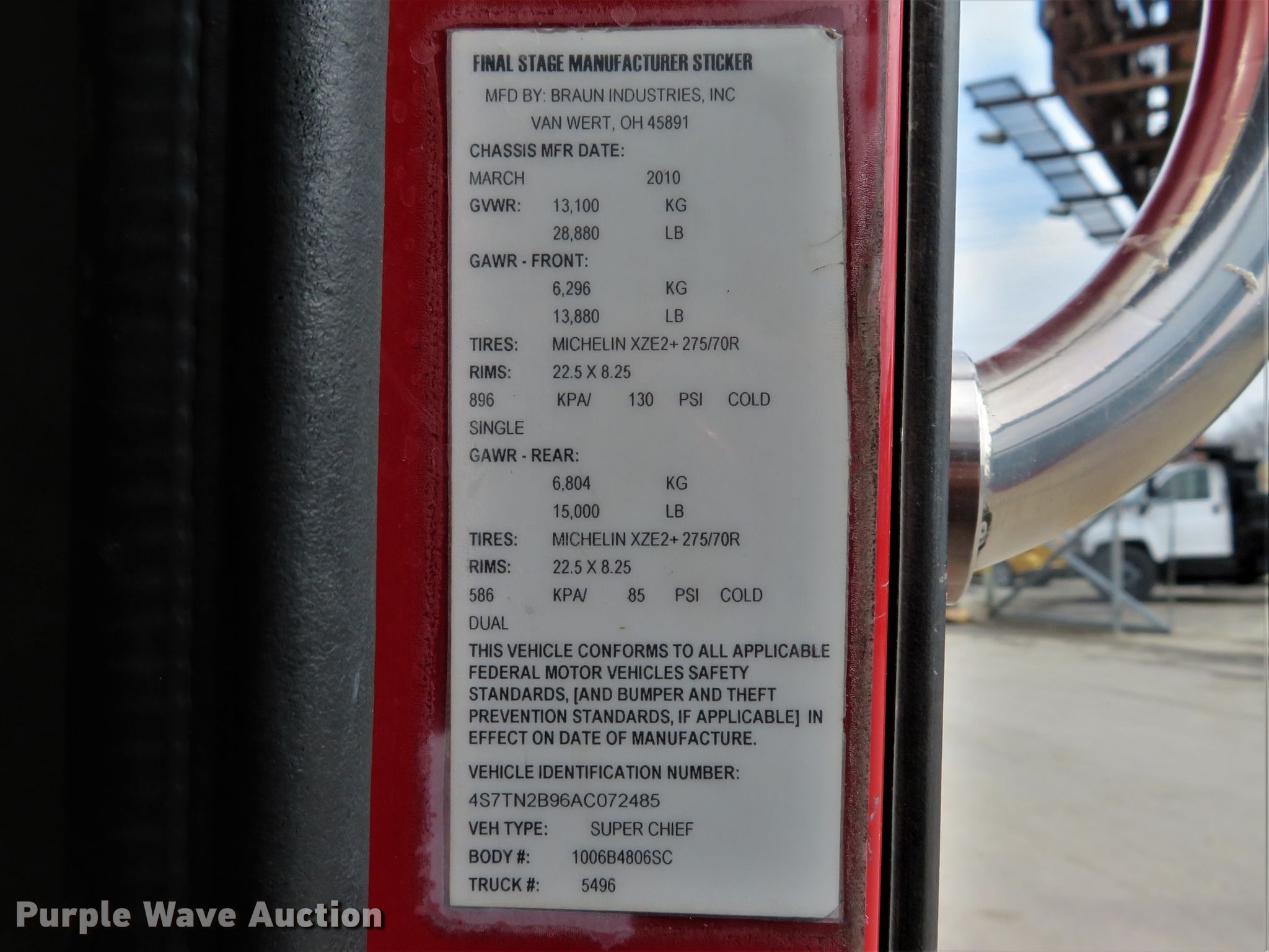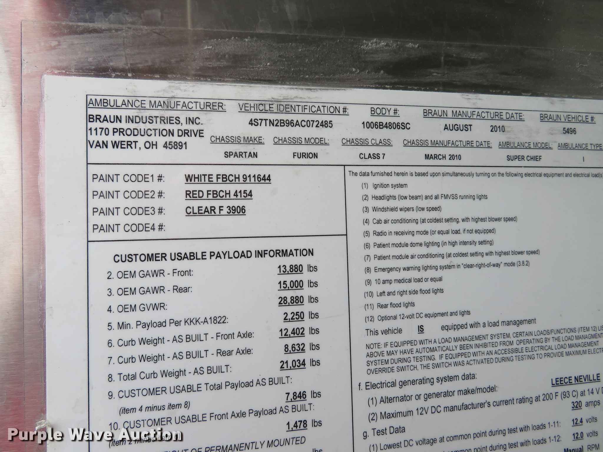 Purple Wave is selling a used Fire Truck or Emergency Vehicle in Missouri. This item is a 2010 Spartan Furion Super Chief ambulance with the following: 125,187 miles on odometer, 11,233 hours on meter, Cummins ISC 8.3L L6 diesel engine, Allison automatic transmission, Single axle, AC and heat, Backup camera, Braun Super Chief ambulance body, Oxygen hookups, Air suspension, Air brakes, 275/70R22.5 tires, Automatic tire chains, GVWR 28,880
