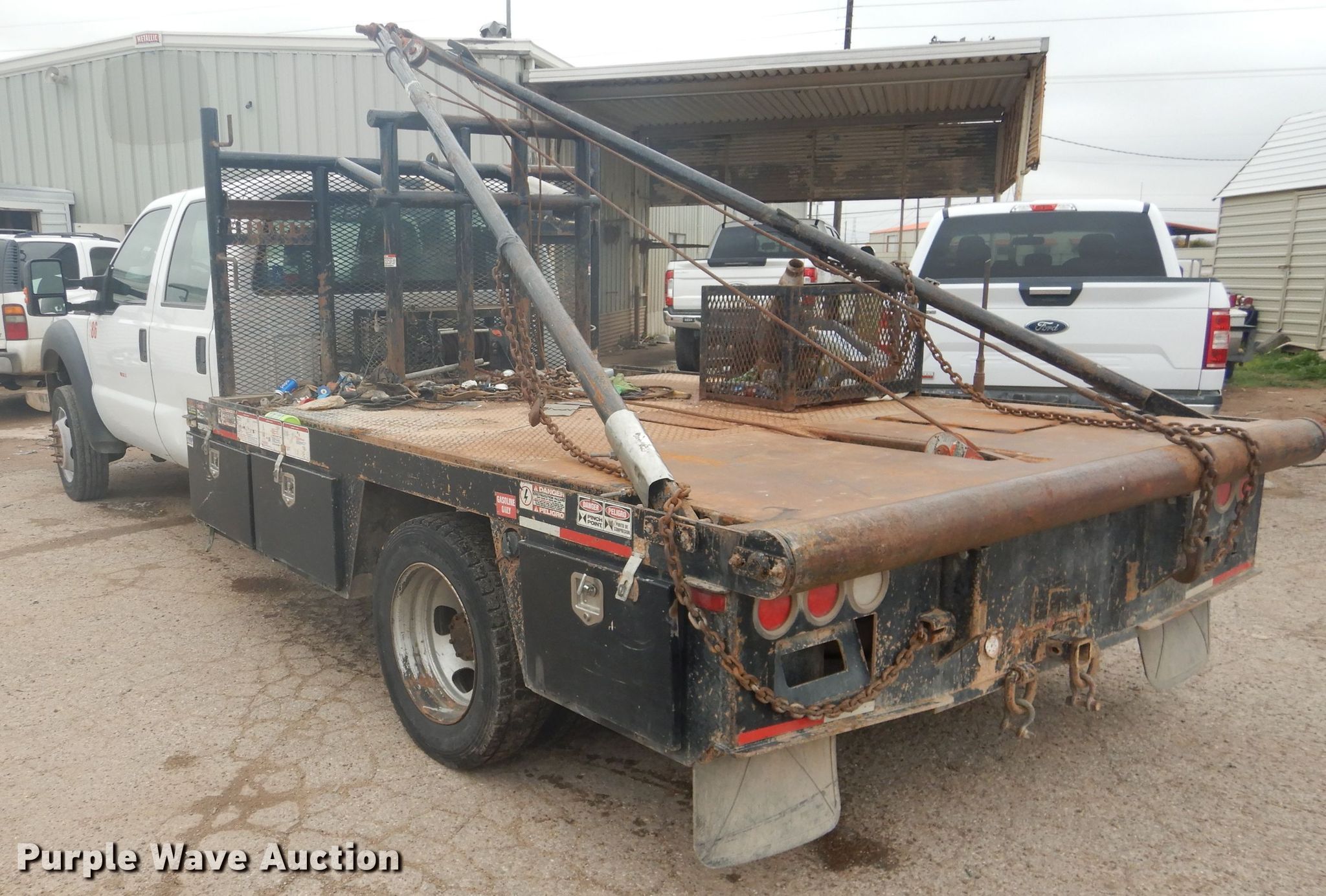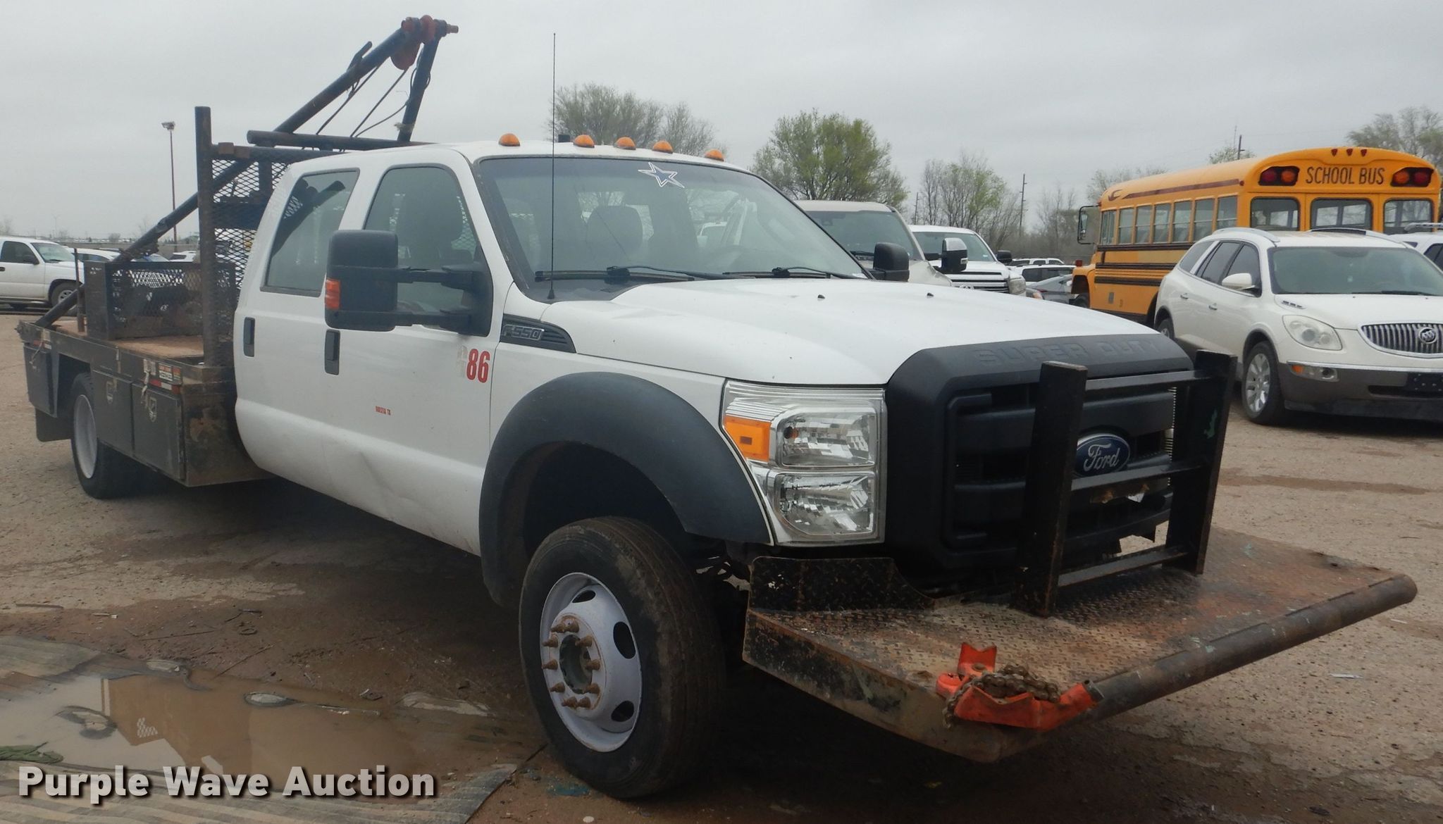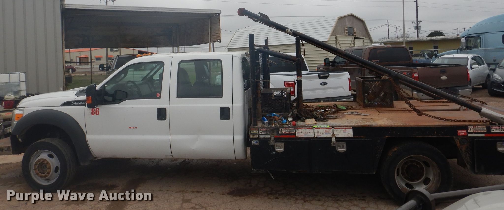 Purple Wave is selling a used Oilfield Truck in Texas. This item is a 2016 Ford F550 winch truck with the following: 156,064 miles on odometer, 6.8L V10 SOHC 30V gas engine, Automatic transmission, Four wheel drive, Single axle, AC and heat, Power windows and locks, Pup flatbed, 11'L x 79"W, Winch, 154" gin poles, Rolling tailboard, 84" wheelbase, Spring suspension, Hydraulic brakes, 225/70R19.5 tires, Windshield cracked