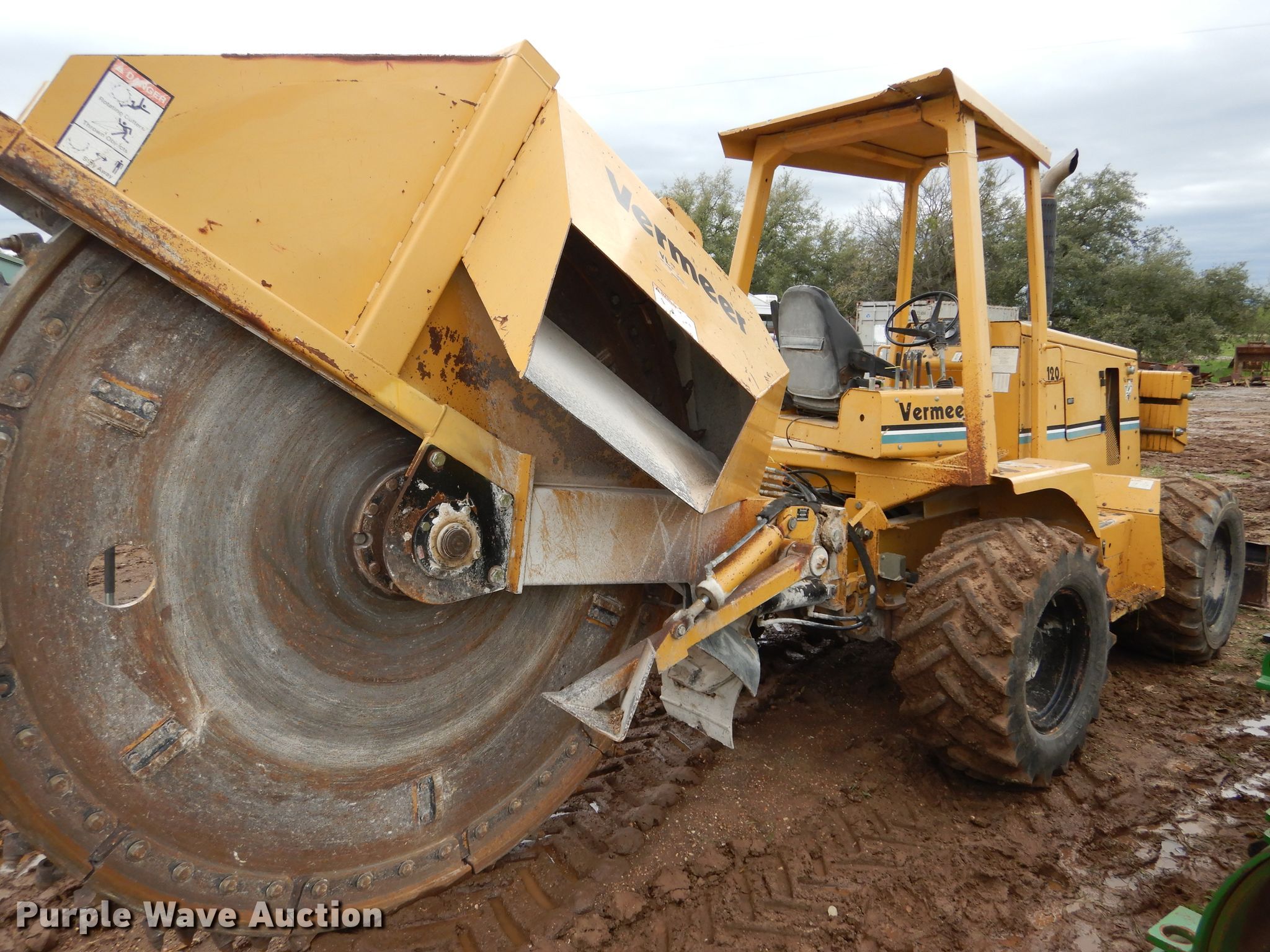 Purple Wave is selling a used Trencher or Rock Saw in Texas. This item is a 2005 Vermeer V120 rock saw with the following: 1,560 hours on meter, Cummins four cylinder diesel engine, Hydrostatic transmission, Four wheel drive, OROPS, 80"W six-way backfill blade, Rock wheel model RW940, 55" boom length, 5" cutting width, 90" wheel diameter, 40" digging depth, Rock teeth, Serial 1VR4110Z571000115, 38x18.00-20 tires, Non-operational parking brake, Serial 1VRT1124251000471